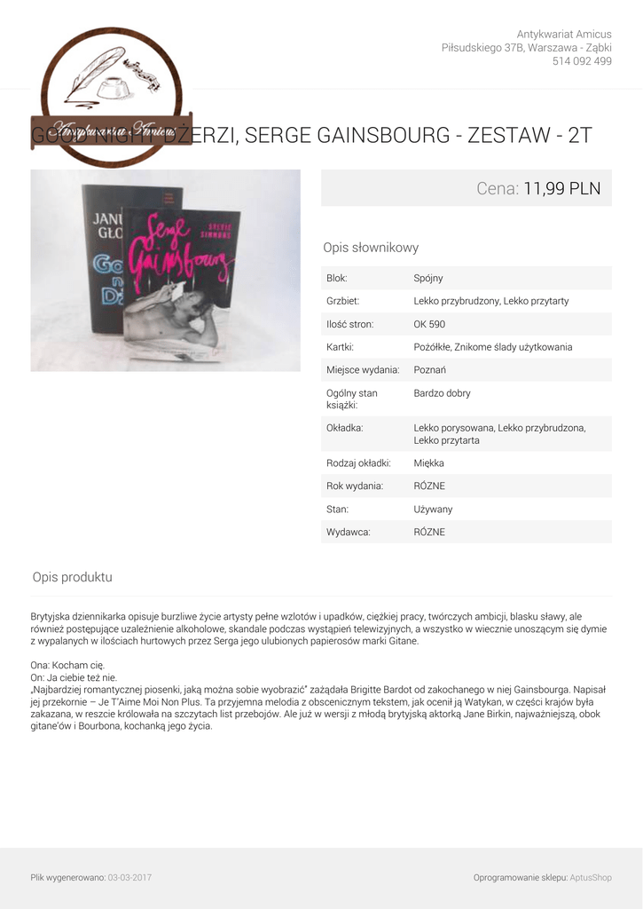 Antykwariat Amicus Piłsudskiego 37B, Warszawa - Ząbki 514 092 499 GOOD NIGHT DŻERZI, SERGE GAINSBOURG - ZESTAW - 2T Cena: 11,99 PLN Opis słownikowy Blok: Spójny Grzbiet: Lekko przybrudzony, Lekko przytarty Ilość stron: OK 590 Kartki: Pożółkłe, Znikome ślady użytkowania Miejsce wydania: Poznań Ogólny stan książki: Bardzo dobry Okładka: Lekko porysowana, Lekko przybrudzona, Lekko przytarta Rodzaj okładki: Miękka Rok wydania: RÓZNE Stan: Używany Wydawca: RÓZNE Opis produktu Brytyjska dziennikarka opisuje burzliwe życie artysty pełne wzlotów i upadków, ciężkiej pracy, twórczych ambicji, blasku sławy, ale również postępujące uzależnienie alkoholowe, skandale podczas wystąpień telewizyjnych, a wszystko w wiecznie unoszącym się dymie z wypalanych w ilościach hurtowych przez Serga jego ulubionych papierosów marki Gitane. Ona: Kocham cię. On: Ja ciebie też nie. „Najbardziej romantycznej piosenki, jaką można sobie wyobrazić” zażądała Brigitte Bardot od zakochanego w niej Gainsbourga. Napisał jej przekornie – Je T’Aime Moi Non Plus. Ta przyjemna melodia z obscenicznym tekstem, jak ocenił ją Watykan, w części krajów była zakazana, w reszcie królowała na szczytach list przebojów. Ale już w wersji z młodą brytyjską aktorką Jane Birkin, najważniejszą, obok gitane’ów i Bourbona, kochanką jego życia. Plik wygenerowano: 03-03-2017 Oprogramowanie sklepu: AptusShop Antykwariat Amicus Piłsudskiego 37B, Warszawa - Ząbki 514 092 499 Galeria Plik wygenerowano: 03-03-2017 Powered by TCPDF (www.tcpdf.org) Oprogramowanie sklepu: AptusShop