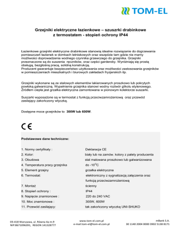 Grzejniki elektryczne łazienkowe – szuszrki drabinkowe z termostatem - stopień ochrony IP44 Łazienkowe grzejniki elektryczne drabinkowe stanowią idealne rozwiązanie do dogrzewania pomieszczeń łazienek w domkach letniskowych oraz wszędzie tam gdzie nie mamy możliwości doprowadzenia wodnego czynnika grzewczego do grzejnika. Grzejniki przeznaczone są do suszenia ręczników, oraz części garderoby. Wyróżniają się prostą obsługą, bezgłośną pracą, solidną konstrukcją. Producent gwarantuje bezpieczeństwo użytkowania oraz możliwości zastosowania grzejników w pomieszczeniach mieszkalnych i biurowych zakładach fryzjerskich itp. Grzejniki wykonane są ze stalowych elementów lakierowanych proszkowo lub pokrytych powłoką galwaniczną. Wypełnienie grzejnika stanowi wodny roztwór glikolu etylenowego. Źródłem ciepła jest grzałka elektryczna zamontowana w pionowym kolektorze suszarki. Suszarki wyposażone są w termostat z funkcją przeciwzamrożeniową oraz przewód zasilający zakończony wtyczką. Dostępne moce grzejników to 300W lub 600W. Podstawowe dane techniczne: 1. Normy certyfikaty : Deklaracja CE 2. Kolor: biały lub na zamów. kolory z palety producenta 4. Temperatura pracy grzejnika do -10OC 3. Obudowa 5. Element grzejny 6. Termostat: stal malowana proszkowo lub galwanizowana grzałka elektryczna elektroniczny z sygnalizacją załączenia oraz funkcją przeciwzamrożeniową 7. Montaż ścienny 9. Napięcie znamionowe : 220 do 240 VAC 8. Stopień ochrony : 10. Moc znamionowa : 11. Przewód zasilający: 03-418 Warszawa, ul. Równa 4a m.9 NIP:8671096391, REGON 141328777 IP44 300W, 600W tak zakończony wtyczką UNI-SHUKO www.tom-el.com.pl e-mail:[email protected] mBank S.A. 30 1140 2004 0000 3902 5138 8171 Suszarki elektryczne z termostatem – STANDARD ELECTRO [GŁE] DOSTĘPNE WERSJE GRZEJNIKÓW STANDARD ELECTRO Model grzejnika Wymiary [mm] szer./wys./głęb. Moc [W] GŁE-30/70 300 x 791 x 160-170 170 300 GŁE-30/90 300 x 1020 x 160-170 170 300 GŁE-50/70 500 x 791 x 160-170 170 300 GŁE-50/90 500 x 1020 x 160-170 170 600 Suszarki elektryczne z termostatem – OMEGA R ELECTRO [OMERE] STĘPNE WERSJE GRZEJNIKÓW OMEGA R ELECTRO Model grzejnika Wymiary [mm] szer./wys./głęb. Moc [W] OMERE-50/120 500 x 1281 x 103--117 600 CHROM GALWANICZNY OMERE-50/120C01 03-418 Warszawa, ul. Równa 4a m.9 NIP:8671096391, REGON 141328777 500 x 1281 x 103--117 www.tom-el.com.pl e-mail:[email protected] 600 mBank S.A. 30 1140 2004 0000 3902 5138 8171 Suszarki elektryczne z termostatem – RETTO ELECTRO [RETE] DOSTĘPNE WERSJE GRZEJNIKÓW RETTO ELECTRO Model grzejnika Wymiary [mm] szer./wys./głęb. Moc [W] RETE-50/70 540 x 816 x 70-80 80 300 RETE-50/110 540 x 1181 x 70--80 600 Suszarki elektryczne z termostatem – STICK ELECTRO [STIE] DOSTĘPNE WERSJE GRZEJNIKÓW STICK ELECTRO Model grzejnika Wymiary [mm] szer./wys./głęb. Moc [W] STIE-50/70 500 x 846 x 65-75 75 300 STIE-50/110 500 x 1216 x 65--75 600 . 03-418 Warszawa, ul. Równa 4a m.9 NIP:8671096391, REGON 141328777 www.tom-el.com.pl e-mail:[email protected] mBank S.A. 30 1140 2004 0000 3902 5138 8171 Dostępna paleta kolorów – na zamówienie Grzejniki w kolorze innym niż biały dostępne na zamówienie według palety producenta za dodatkową dopłatą ok.15% ceny modelu podstawowego. Kolory C22, C54, C28, C32, C54 oraz C47 dostępne za dopłatą 60% do ceny modelu podstawowego 03-418 Warszawa, ul. Równa 4a m.9 NIP:8671096391, REGON 141328777 www.tom-el.com.pl e-mail:[email protected] mBank S.A. 30 1140 2004 0000 3902 5138 8171