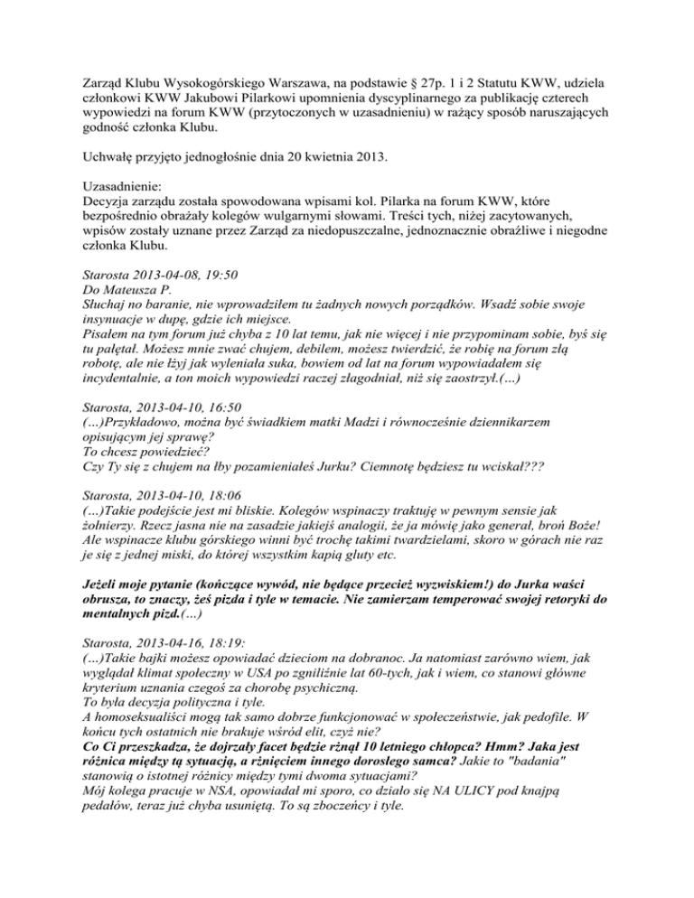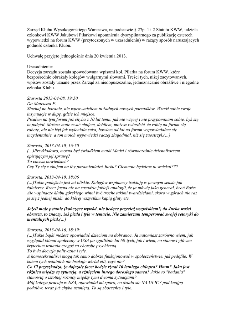 Zarząd Klubu Wysokogórskiego Warszawa, na podstawie § 27p. 1 i 2 Statutu KWW, udziela członkowi KWW Jakubowi Pilarkowi upomnienia dyscyplinarnego za publikację czterech wypowiedzi na forum KWW (przytoczonych w uzasadnieniu) w rażący sposób naruszających godność członka Klubu. Uchwałę przyjęto jednogłośnie dnia 20 kwietnia 2013. Uzasadnienie: Decyzja zarządu została spowodowana wpisami kol. Pilarka na forum KWW, które bezpośrednio obrażały kolegów wulgarnymi słowami. Treści tych, niżej zacytowanych, wpisów zostały uznane przez Zarząd za niedopuszczalne, jednoznacznie obraźliwe i niegodne członka Klubu. Starosta 2013-04-08, 19:50 Do Mateusza P. Słuchaj no baranie, nie wprowadziłem tu żadnych nowych porządków. Wsadź sobie swoje insynuacje w dupę, gdzie ich miejsce. Pisałem na tym forum już chyba z 10 lat temu, jak nie więcej i nie przypominam sobie, byś się tu pałętał. Możesz mnie zwać chujem, debilem, możesz twierdzić, że robię na forum złą robotę, ale nie łżyj jak wyleniała suka, bowiem od lat na forum wypowiadałem się incydentalnie, a ton moich wypowiedzi raczej złagodniał, niż się zaostrzył.(…) Starosta, 2013-04-10, 16:50 (…)Przykładowo, można być świadkiem matki Madzi i równocześnie dziennikarzem opisującym jej sprawę? To chcesz powiedzieć? Czy Ty się z chujem na łby pozamieniałeś Jurku? Ciemnotę będziesz tu wciskał??? Starosta, 2013-04-10, 18:06 (…)Takie podejście jest mi bliskie. Kolegów wspinaczy traktuję w pewnym sensie jak żołnierzy. Rzecz jasna nie na zasadzie jakiejś analogii, że ja mówię jako generał, broń Boże! Ale wspinacze klubu górskiego winni być trochę takimi twardzielami, skoro w górach nie raz je się z jednej miski, do której wszystkim kapią gluty etc. Jeżeli moje pytanie (kończące wywód, nie będące przecież wyzwiskiem!) do Jurka waści obrusza, to znaczy, żeś pizda i tyle w temacie. Nie zamierzam temperować swojej retoryki do mentalnych pizd.(…) Starosta, 2013-04-16, 18:19: (…)Takie bajki możesz opowiadać dzieciom na dobranoc. Ja natomiast zarówno wiem, jak wyglądał klimat społeczny w USA po zgniliźnie lat 60-tych, jak i wiem, co stanowi główne kryterium uznania czegoś za chorobę psychiczną. To była decyzja polityczna i tyle. A homoseksualiści mogą tak samo dobrze funkcjonować w społeczeństwie, jak pedofile. W końcu tych ostatnich nie brakuje wśród elit, czyż nie? Co Ci przeszkadza, że dojrzały facet będzie rżnął 10 letniego chłopca? Hmm? Jaka jest różnica między tą sytuacją, a rżnięciem innego dorosłego samca? Jakie to "badania" stanowią o istotnej różnicy między tymi dwoma sytuacjami? Mój kolega pracuje w NSA, opowiadał mi sporo, co działo się NA ULICY pod knajpą pedałów, teraz już chyba usuniętą. To są zboczeńcy i tyle. www.dailymotion.com/video/x4wufl_joanna-najfeld-vs-jacek-adler-w-wsi_news W linku masz piękną recenzję tzw. kultury gejowskiej. W dniu 17 kwietnia Zarząd zwrócił się do kol. Pilarka o zamieszczenie odpowiedniego tekstu przeprosin w sprawie pierwszych trzech z powyższych wpisów. Kol. Pilarek w dniu 18 kwietnia odmówił umieszczenia przeprosin na forum KWW. Dodatkowo 19 kwietnia wpłynął wniosek kol. Kacpra Gronkiewicza w sprawie ukarania kol. Pilarka za czwarty z wymienionych wyżej wpisów. W świetle stwierdzonych faktów i wobec nie zastosowania się kol. Pilarka do prośby zarządu o publikację przeprosin, zarząd KWW uznał kol. Pilarka winnym naruszenia godności członka KWW i orzekł karę dyscyplinarną w postaci upomnienia. Zarząd KW Warszawa