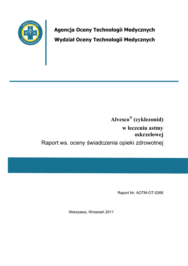 Agencja Oceny Technologii Medycznych Wydział Oceny Technologii Medycznych Alvesco® (cyklezonid) w leczeniu astmy oskrzelowej Raport ws. oceny świadczenia opieki zdrowotnej Raport Nr: AOTM-OT-0266 Warszawa, Wrzesień 2011 W przygotowaniu oceny raportu ws. oceny leku lub wyrobu medycznego udział wzięli pracownicy Działu Raportów i Oceny Raportów Wydziału Oceny Technologii Medycznych AOTM : Osoby uczestniczące w pracach nad oceną raportu zadeklarowały brak konfliktu interesów. W toku prac występowano o opinię do następujących ekspertów klinicznych: Alvesco® (cyklezonid) AOTM-OT-0266 w leczeniu astmy oskrzelowej Zastosowane skróty: Ustawa – Ustawa o zmianie ustawy o świadczeniach opieki zdrowotnej finansowanych ze środków publicznych oraz ustawy o cenach (Dz.U. z 2009 r. nr 118 poz. 989) Rozporządzenie – Rozporządzenie Ministra Zdrowia z dnia 22 grudnia 2009 r. w sprawie przygotowania raportu w sprawie oceny świadczenia opieki zdrowotnej i oceny raportu w sprawie oceny leku lub wyrobu medycznego (DZ.U. z 2009 r. nr 222 poz. 1773) Wytyczne – „Wytyczne oceny technologii medycznych” wprowadzone Zarządzeniem Prezesa AOTM nr 1/2010 z 4.01.2010 r., stanowiące podsumowanie uznawanych przez społeczność międzynarodową wymagań dotyczących przeprowadzania oceny świadczeń opieki zdrowotnej AQLQ - (ang. Asthma Quality of life Questionnaire) kwestionariusz jakości życia chorych z astmą ASS – (ang. Asthma Symptom Score ) Kliniczna punktacja objawów astmy Bd – brak danych BDP – beklometazon bi - (łac. bis in die) dwa razy na dzień; BUD – budezonid CFC - (ang. Chlorofluorocarbon) nośnik chlorofluorokarbonowy (freonowy) CFC-MDI - Inhalator ciśnieniowy z dozownikiem oraz nośnikiem chlorofluorokarbonowym CI95% -(ang. Confidence Interval) 95% przedział ufności CIC - (ang. Ciclesonide) Cyklezonid DPI- (ang. Dry Powder Inhaler) Inhalator suchego proszku FEV1- (ang. Forced Expiratory Volume in 1 second) Natężona objętość wydechowa pierwszosekundowa FP – flutykazon, FVC - (ang. Forced Vital Capacity) Natężona pojemność życiowa GINA - (ang. Global Initiative For Asthma) Światowa Inicjatywa Zwalczania Astmy GKS – glikokortykosteroidy HFA - (ang. Hydrofluoroalkane) Nośnik hydrofluoroalkanowy HFA-MDI – Inhalator ciśnieniowy z dozownikiem oraz nośnikiem hydrofluoroalkanowym ICS - (ang. Inhaled Corticosteroids) Wziewne kortykosteroidy IS - Wynik (różnica) istotna statystycznie ITT - Analiza zgodna z intencją leczenia LABA – (ang. Long acting beta-2-agonists), długo działający agoniści receptorów beta2-adrenergicznych MD - (ang. Mean Difference) Średnia różnica mITT - Zmodyfikowana analiza zgodna z intencją leczenia NNH - (ang. Number Needed to Harm) Liczba pacjentów, u których dana interwencja doprowadza do wystąpienia jednego dodatkowego niekorzystnego punktu końcowego u jednego pacjenta w określonym czasie. Obliczana jako odwrotność bezwzględnego zwiększenia ryzyka ARI (1/ARI) NNT - (ang. Number Needed to Treat) Liczba pacjentów, których należy poddać danej interwencji, aby uzyskać pożądany efekt zdrowotny lub uniknąć jednego negatywnego punktu końcowego u jednego z nich w określonym czasie. (1/ARR) PC20 AMP - Test nadreaktywności oskrzeli - stężenie adenozyny wywołujące co najmniej 20% obniżenie wartości parametru FEV1 PC20 MCh - Test nadreaktywności oskrzeli - stężenie metacholiny wywołujące co najmniej 20% obniżenie wartości parametru FEV1 PEF - (ang. Peak Expiratory Flow) Szczytowy przepływ wydechowy PF – flutykazon PLC – Placebo qd – (łac. quaque die) – raz dziennie; RR - (ang. Relative Risk) Ryzyko względne SABA - (ang. Short Acting Beta-Agonists) Krótko działające beta-2-mimetyki SD - (ang. Standard Deviation) Odchylenie standardowe wGKS – wziewne glikokortykosteroidy WMD - (ang. Weighted Mean Difference) Średnia ważona różnica ex actuator - dawka leku "uwalniana z dozownika", która określa ilość leku uwalnianego z inhalatora podczas jednego wdechu, ex-valve - dawka w dozowniku, określa ilość leku zawartą w pojedynczej dawce w inhalatorze Raport w sprawie oceny świadczenia opieki zdrowotnej 3/78 Alvesco® (cyklezonid) AOTM-OT-0266 w leczeniu astmy oskrzelowej Spis treści 1. Podstawowe informacje o wniosku ............................................................................................................................ 6 2. Problem decyzyjny ..................................................................................................................................................... 9 2.1. Problem zdrowotny ............................................................................................................................................ 9 2.1.1. Skutki następstw choroby lub stanu zdrowia ..................................................................................... 10 2.2. Opis świadczenia opieki zdrowotnej ............................................................................................................... 11 2.2.1. Wpływ świadczenia na stan zdrowia obywateli ................................................................................ 11 2.2.2. Opis świadczeń alternatywnych......................................................................................................... 11 2.2.3. Liczebność populacji wnioskowanej ................................................................................................. 12 2.3. Interwencje wnioskowane i komparatory ........................................................................................................ 14 2.3.1. Interwencje ........................................................................................................................................ 14 2.3.1.1. Zagadnienia rejestracyjne ............................................................................................................. 14 2.3.1.2. Wskazania zarejestrowa
