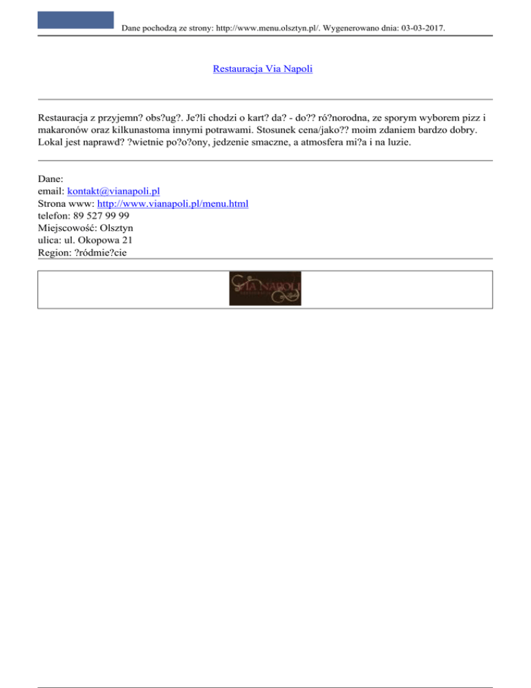 Dane pochodzą ze strony: http://www.menu.olsztyn.pl/. Wygenerowano dnia: 03-03-2017. Restauracja Via Napoli Restauracja z przyjemn? obs?ug?. Je?li chodzi o kart? da? - do?? ró?norodna, ze sporym wyborem pizz i makaronów oraz kilkunastoma innymi potrawami. Stosunek cena/jako?? moim zdaniem bardzo dobry. Lokal jest naprawd? ?wietnie po?o?ony, jedzenie smaczne, a atmosfera mi?a i na luzie. Dane: email: [email protected] Strona www: http://www.vianapoli.pl/menu.html telefon: 89 527 99 99 Miejscowość: Olsztyn ulica: ul. Okopowa 21 Region: ?ródmie?cie