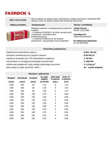 Opis i kod wyrobu Zdjęcie produktu Płyty lamelowe ze skalnej wełny mineralnej do izolacji termicznej w systemach BSO MW-EN 13162-T5-DS(TH)-CS(10\Y)40-TR100-WS-WL(P)-MU1 Zastosowanie Normy i certyfikaty Niepalne ocieplenie w bezspoinowych systemach ociepleń: - w systemie ECOROCK-L do ścian zewnętrznych murowanych, monolitycznych, prefabrykowanych, - w systemie ECOROCK-GL do stropów piwnicznych i nad garaŜami oraz przejazdami. Polska Norma PN-EN 13162:2002 Certyfikat CE 1390-CPD-0072/07/P EC Deklaracja Zgodności Nr CIG 00015/08 Parametry podstawowe współczynnik przewodzenia ciepła λD 0,042 W/mK obciąŜenie charakterystyczne cięŜarem własnym 0,90 kN/m3 napręŜenie ściskające przy 10% odkształceniu względnym ≥ 40 kPa wytrzymałość na rozciąganie prostopadłe do powierzchni ≥ 100 kPa krótkotrwała nasiąkliwość wodą metodą częściowego zanurzenia ≤ 1,0 kg/m2 klasa reakcji na ogień wg PN-EN 13501-1 A1 - wyrób niepalny Wymiary i pakowanie Długość Szerokość Grubość RD opór cieplny Ilość płyt w paczce Ilość m2 w paczce [mm] [mm] [mm] [m2K/W] [szt.] [m2] 1200 200 50 1,15 8 1,92 1200 200 60 1,40 8 1,92 1200 200 80 1,90 6 1,44 1200 200 100 2,35 4 0,96 1200 200 120 2,85 4 0,96 1200 200 140 3,30 4 0,96 1200 200 150 3,55 4 0,96 1200 200 160 3,80 4 0,96 1200 200 180 4,25 4 0,96 1200 200 200 4,75 4 0,96 1200 200 220 5,20 4 0,96 1200 200 240 5,70 4 0,96