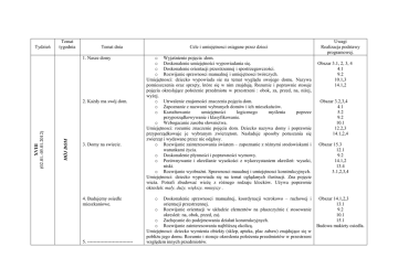 Tydzień Temat tygodnia Temat dnia 1. Nasze domy MÓJ DOM XVIII (02.01.-05.01.2012) 2. Każdy ma swój dom. 3. Domy na swiecie. 4. Budujemy osiedle mieszkaniowe. 5. ----------------------------- Cele i umiejętnosci osiągane przez dzieci o Wyjaśnienie pojęcia :dom. o Doskonalenie umiejętności wypowiadania się. o Doskonalenie orientacji przestrzennej i spostrzegawczości. o Rozwijanie sprawnosci manualnej i umiejętnosci twórczych. Umiejętnosci: dziecko wypowiada sie na temat wyglądu swojego domu. Nazywa pomieszczenia oraz sprzęty, które się w nim znajdują. Rozumie i poprawnie stosuje pojęcia okreslające położenie przedmiotu w przestrzeni : obok, za, przed, na, niżej, wyżej. o Utrwalenie znajomości znaczenia pojęcia dom. o Zapoznanie z nazwami wybranych domów i ich mieszkańców. o Kształtowanie umiejętności logicznego myślenia poprzez przyporządkowywanie i klasyfikowanie. o Wzbogacanie zasobu słownictwa. Umiejętnosci: rozumie znaczenie pojęcia dom. Dziecko nazywa domy i poprawnie przyporządkowuje je wybranym zwierzętom. Nasladuje sposoby poruszania się zwierząt i wydawane przez nie odgłosy. o Rozwijanie zainteresowania światem – zapoznanie z różnymi srodowiskami i warunkami życia. o Doskonalenie płynności i poprawności wymowy. o Porównywanie i określanie wysokości z wykorzystaniem określeń: wysoki, niski. o Rozwijanie wyobraźni. Sprawnosci maualnej i umiejętnosci konstrukcyjnych. Umiejętnosci: dziecko wypowiada się na temat oglądanych ilustracji. Zna pojęcie wieża. Potrafi zbudować wieżę z różnego rodzaju klocków. Używa poprawnie okresleń: mały, duży, większy, mniejszy . Doskonalenie sprawnosci manualnej, koordynacji wzrokowo – ruchowej i orientacji przestrzennej. o Rozwijanie orientacji w układzie elementów na płaszczyźnie ( stosowanie okresleń: na, obok, przed, za). o Zachęcanie do podejmowania działań konstrukcyjnych. o Rozwijanie zainteresowania najbliższą okolicą. Umiejętnosci: dziecko wymienia obiekty (sklep, apteka, plac zabaw) znajdujące się w pobliżu jego domu. Rozumie i stosuje okreslenia położenia przedmiotów w przestrzeni względem innych przedmiotów. o Uwagi Realizacja podstawy programowej. Obszar 3.1, 2, 3, 4 4.1 9.2 10.1,3 14.1,2 Obszar 3.2,3,4 4.1 5.2 9.2 10.1 12.2,3 14.1,2,4 Obszar 15.3 12.1 9.2 14.1,2 13.4 3.1,2,3,4 Obszar 14.1,2,3 13.1 9.2 10.1 15.1 Budowa makiety osiedla. MOJA RODZINA XIX (09.01. – 13.01.2012) Cele tematu kompleksowego: o Wyjaśnienie pojęć „rodzina”, „rodzice”. o Dostrzeganie i akceptowanie własnego miejsca w rodzinie. o Rozwijanie umiejętności prawidłowego nazywania członków rodziny. o Kształtowanie pewności i poczucia bezpieczeństwa dziecka jako ważnego członka grupy społecznej – rodziny. o Zacieśnianie więzi emocjonalnej z rodziną. o Rozwijanie zainteresowania życiem najbliższych członków rodziny o Inspirowanie zabaw tematycznych dotyczących rodziny i domu. o Rozwijanie inwencji twórczej i umiejetności dostrzegania potrzeby pomagania członkom rodziny. o Zachęcanie do aktywnego uczestnictwa w życiu rodzinnym. o Wprowadzenie w świat takich wartości moralnych jak: szacunek i miłość. o Wdrażanie do samodzielnego wykonywania czynności samoobsługowych. o Doskonalenie umiejętności poprawnego i płynnego wypowiadania się. o Doskonalenie ekspresji ruchowej. o Doskonalenie percepcji wzrokowej. 1. Moje miejsce w rodzinie. Umiejętności: dziecko rozpoznaje i prawidłowo nazywa członków rodziny:mama, tata, brat siostra, babcia, dziadek.. Potrafi podać ich imiona. Próbuje określić stopień pokrewieństwa miedzy dziadkami i rodzicami. Podaje informacje o sobie, o swoich ulubionych domowych zajęciach. 2. Rodzice. Umiejętności: dziecko zna imiona rodziców. Próbuje określić role pełnione przez mamę i tatę w rodzinie oraz wykonywane przez nich zawody. Potrafi wyrazić swoje uczucia wobec rodziców poprzez słowa i czyny. Rozpoznaje właściwe formy zachowania i postawy wobec rodziców. Odczuwa radość i satysfakcję z możliwości pomagania dorosłym w codziennych obowiązkach (bierze aktywny udział w zabawach tematycznych dotyczących tego tematu). 3. Rodzeństwo. Umiejętności: dziecko rozumie znaczenie pojęć: siostra, brat. Podaje imiona swojego rodzeństwa. Wyraża swoje uczucia wobec rodzeństwa. Opowiada o nich, o wspólnych zajęciach i ulubionych zabawach. Zna zasady wspólnej i zgodnej zabawy. 4. Jak spędzamy wolny czas z rodziną. Umiejętności: dziecko opowiada o ulubionych formach wypoczynku i zabawy w swojej rodzinie. Podejmuje spontanicznie zabawy ruchowe. Obszar 15.1 1.1,2,3,4 2.1,2 3.1,2,3,4 7.2 14.1,2 a 5. Mój przyjaciel o o o o Wyjaśnienie znaczenia określenia „przyjaciel”, „przyjaźń”. Kształtowanie poprawnych zachowań prospołecznych. Rozwijanie umiejętności współpracy i porozumiewania się z innymi. Wzmacnianie pozytywnych relacji w grupie. Rozwijanie umiejętności wyrażania własnych myśli i emocji. Umiejętności: dziecko zna zasady wspólnej i zgodnej zabawy. Stosuje zwroty grzecznościowe w stosunku do kolegów w grupie. Rozpoznaje i poprawnie nazywa różne stany emocjonalne. Podejmuje próby określania cech i zachowań przyjaciela. Obszar 1.1,2,3,4 3.1,2,3,4 9.2 12.2 JESTEM WNUCZKIEM XX (16.01. – 20.01.2012) 11. Nie ma jak u babci. 12. Dziadzio. Wzmacnianie więzi emocjonalnej z dziadkami. Utrwalanie znaczenia „szacunku” jako wartości moralnej i sposobu okazywania go starszym. o Kształtowanie nawyku stosowania zwrotów grzecznościowych. o Rozwijanie wrażliwości emocjolnalnej. o Ukazanie piękna i radości czerpanej ze sprawiania bliskim osobom niespodzianek i przyjemności. o Rozwijanie sprawności manulanej i inwencji twórczej. Umiejętności: dziecko zna imiona swoich dziadków. Swobodnie opowiada o nich. Dostrzega różnice w ich wyglądzie. Wie, jak należy się zachowywać w stosunku do starszych osób. Wyraża, w ekspresji ruchowej, pomoc ni