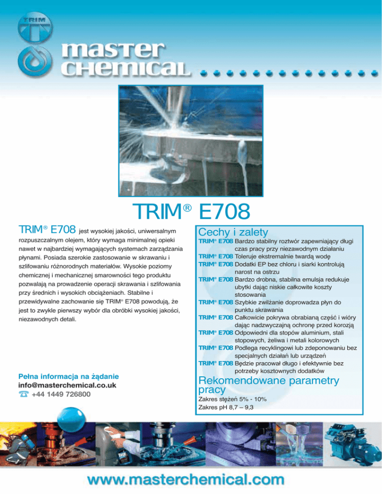 TRIM® E708 TRIM® E708 jest wysokiej jakości, uniwersalnym rozpuszczalnym olejem, który wymaga minimalnej opieki nawet w najbardziej wymagających systemach zarządzania płynami. Posiada szerokie zastosowanie w skrawaniu i szlifowaniu różnorodnych materiałów. Wysokie poziomy chemicznej i mechanicznej smarowności tego produktu pozwalają na prowadzenie operacji skrawania i szlifowania przy średnich i wysokich obciążeniach. Stabilne i przewidywalne zachowanie się TRIM® E708 powodują, że jest to zwykle pierwszy wybór dla obróbki wysokiej jakości, niezawodnych detali. Pełna informacja na żądanie [email protected] +44 1449 726800 Cechy i zalety TRIM® E708 Bardzo stabilny roztwór zapewniający długi czas pracy przy niezawodnym działaniu TRIM® E708 Toleruje ekstremalnie twardą wodę TRIM® E708 Dodatki EP bez chloru i siarki kontrolują narost na ostrzu ® TRIM E708 Bardzo drobna, stabilna emulsja redukuje ubytki dając niskie całkowite koszty stosowania TRIM® E708 Szybkie zwilżanie doprowadza płyn do punktu skrawania TRIM® E708 Całkowicie pokrywa obrabianą część i wióry dając nadzwyczajną ochronę przed korozją TRIM® E708 Odpowiedni dla stopów aluminium, stali stopowych, żeliwa i metali kolorowych TRIM® E708 Podlega recyklingowi lub zdeponowaniu bez specjalnych działań lub urządzeń TRIM® E708 Będzie pracował długo i efektywnie bez potrzeby kosztownych dodatków Rekomendowane parametry pracy Zakres stężeń 5% - 10% Zakres pH 8,7 – 9,3 Dostawca części Ogólny samochodowych wytwórca Ogólny wytwórca CEL: CEL: Wcześniej stosowane przez CEL: Klient miał problemy z dużą klienta, drogie chłodziwo okresowo powodowało czarne plamy na wyrobach z mosiądzu i brązu. Klient był zmuszony dodawać inhibitory korozji żółtych metali, każdorazowo gdy wykonywano obróbkę mosiądzu. Celem próby było znalezienie chłodziwa nie wymagającego takich dodatków i jednocześnie zmniejszającego ilość pozostałości olejowych w maszynie. ilością pozostałości i rozdzielaniem się emulsji. Zmuszało to do stosowania wysokich stężeń roztworu, powodowało korozję części i skracało trwałość narzędzi. Próba stosowania TRIM® E708 została zainicjowana aby znaleźć chłodziwo eliminujące te problemy. Klient zastosował TRIM E708 na próbę, ponieważ chciał używać jednego produktu do obróbki elementów z aluminium, stali i żeliwa. Dotychczas stosowany produkt często powodował rdzewienie części z żeliwa i wymagał częstego przewietrzania z powodu nieprzyjemnego zapachu w maszynach do żeliwa. ® OPERACJA: Klient zastosował ® TRIM E708 w trzech frezarkach HAAS. Obrabianymi materiałami były żeliwo, stal i aluminium. Wykonywano frezowanie, wiercenie i gwintowanie. Woda stosowana do przygotowania roztworu miała twardość około 300 ppm. OPERACJA: Klient zastosował TRIM® E708 w dwóch komputerowo sterowanych tokarkach CNC, obrabiając stal nierdzewną, stal narzędziową , mosiądz, brąz i tworzywa sztuczne. OPERACJA: Klient zastosował TRIM E708 w dwóch frezarkach. Prowadzone operacje to frezowanie, wiercenie i gwintowanie takich materiałów jak: stal, stal nierdzewna, aluminium i mosiądz. Woda użyta do sporządzenia roztworu była bardzo twarda, 400 ppm. REZULTAT: Stabilność TRIM REZULTAT: TRIM® E708 sprawował się świetnie nawet przy tak twardej wodzie. Nie wystąpiła korozja na żadnej z części w całym sześciomiesięcznym okresie próby. Żywotność roztworu we wszystkich trzech maszynach była dłuższa niż sześć miesięcy próby. Klient jest bardzo zadowolony z działania produktu. REZULTAT: TRIM ® E708 z sukcesem obrabiał wszystkie te różne materiały i nie pozostawiał plam na jakiejkolwiek części z żółtego metalu. Klient zauważył jednocześnie wyraźną poprawę czystości maszyny. Local distributor: ® E708 w twardej wodzie zapewniła, ze nie nastąpiło rozdzielanie emulsji w żadnej z maszyn. Pozostałości wewnątrz maszyny zostały zdecydowanie zredukowane, podobnie korozja stalowych części. Stabilność produktu zapewniła także stałą żywotność narzędzi w całym 4ro miesięcznym okresie próby. W całym warsztacie wymieniono chłodziwo na TRIM® E708. 2007.01.10
