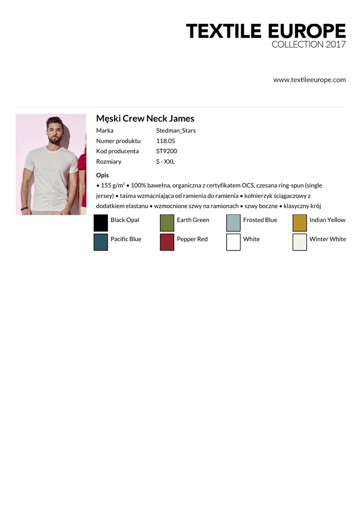Męski Crew Neck James Marka Stedman_Stars Numer produktu 118.05 Kod producenta ST9200 Rozmiary S - XXL Opis • 155 g/m² • 100% bawełna, organiczna z certyfikatem OCS, czesana ring-spun (single jersey) • taśma wzmacniająca od ramienia do ramienia • kołnierzyk ściągaczowy z dodatkiem elastanu • wzmocnione szwy na ramionach • szwy boczne • klasyczny krój Black Opal Earth Green Frosted Blue Indian Yellow Pacific Blue Pepper Red White Winter White