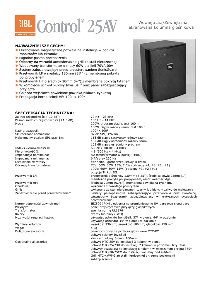 Wewnętrzna/Zewnętrzna ekranowana kolumna głośnikowa NAJWAŻNIEJSZE CECHY: Ekranowanie magnetyczne pozwala na instalację w pobliżu monitorów lub ekranów Łagodne pasmo przenoszenia Odporny na warunki atmosferyczne grill ze stali nierdzewnej Wbudowany transformator o mocy 60W dla linii 70V/100V System zabezpieczający przed przesterowaniem SonicGuard Przetwornik LF o średnicy 130mm (5¼”) z membraną pokrytą polipropylenem Przetwornik HF o średnicy 20mm (¾”) z membraną pokrytą tytanem W komplecie uchwyt kulowy InvisiBall® oraz panel zabezpieczający przyłącza Gniazda wejściowe powlekane powłoką niklowo-cynkową Propagacja horna sekcji HF: 100° x 100° SPECYFIKACJA TECHNICZNA: Zakres częstotliwości (-10 dB): Pasmo średnich częstotliwości (±1.5 dB): Moc : Kąty propagacji: Skuteczność nominalna: Maksymalny poziom SPL przy 1m: Indeks kierunkowości DI: Kierunkowość Q: Impedancja nominalna: Impedancja minimalna: Ustawienia zwrotnicy: Odczepy transformatora: Przetwornik LF: Przetwornik HF: Obudowa: Grill: Zabezpieczenie przed przesterowaniem: Normy odporności zewnętrznej: Przyłącza: Transformator: Kolory: Możliwości regulacji kątów: Wymiary kolumny: Waga: Dołączone akcesoria: Opcjonalne akcesoria: 70 Hz – 23 kHz 130 Hz – 14 kHz 200W, program ciągły, test 100 h 100W, ciągły różowy szum, test 100 h 100° x 100° 87 dB SPL, 1W/1m 113 dB ciągły szczytowy różowy szum 107 dB ciągły uśredniony różowy szum 103 dB ciągły uśredniony program 6.9 dB (500 Hz – 4 kHz) 4.9 (500 Hz – 4 kHz) 8Ω (transformator w pozycji THRU) 6.7Ω przy 230 Hz filtr dolno i górnoprzepustowy II rzędu 70V: 60W, 30W, 15W, 7,5W (odczepy #4, #3, #2 i #1) 100V: 60W, 30W, 15W, (odczepy #3, #2 i #1) pozycja THRU: 8Ω przetwornik o średnicy 130mm (5.25”), średnica cewki 25mm (1”) membrana pokryta polipropylenem, resor WeatherEdge średnica 20mm (0.75”), membrana powlekana tytanem, wykonana z twardego polistyrenu wykonany ze stali nierdzewnej, czarny lub biały, możliwy do malowania limitery pełnopasmowe zabezpieczające przetworniki oraz zwrotnicę, wewnętrzny bezpiecznik zabezpieczający w krytycznych sytuacjach przesterowania IEC529 IP-X4 , odporna na promieniowanie UV, parę oraz słoną parę panel przykręcanych przyłączy głośnikowych spełnia normę UL1876 czarny lub biały (-WH) używając uchwytu InvisiBall: 37° w pionie, 44° w poziomie używając uchwytu: 44° w pionie i w poziomie wysokość 236mm, szerokość 186mm, głębokość 159 mm 4 kg panel ochronny na przłącza głośnikowe MTC-PC uchwyt ścienny InvisBall klucz ampulowy 6mm x 100mm uchwyt MTC-25V do instalacji 3 kolumn w pionie uchwyt MTC-25/23H do instalacji 2 kolumn w poziomie. Trzy takie uchwyty pozwalają na instalację 6 kolumn w zwieszanym okręgu 360° uchwyt MTC-28/25CM do instalacji kolumny pod sufitem Grill MTC-xxWMG ze stali nierdzewnej z trzema poziomami zabezpieczenia