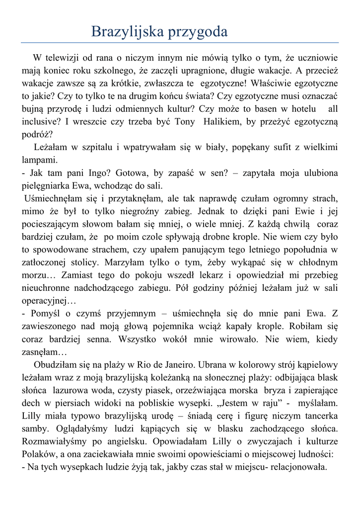 Brazylijska przygoda W telewizji od rana o niczym innym nie mówią tylko o tym, że uczniowie mają koniec roku szkolnego, że zaczęli upragnione, długie wakacje. A przecież wakacje zawsze są za krótkie, zwłaszcza te egzotyczne! Właściwie egzotyczne to jakie? Czy to tylko te na drugim końcu świata? Czy egzotyczne musi oznaczać bujną przyrodę i ludzi odmiennych kultur? Czy może to basen w hotelu all inclusive? I wreszcie czy trzeba być Tony Halikiem, by przeżyć egzotyczną podróż? Leżałam w szpitalu i wpatrywałam się w biały, popękany sufit z wielkimi lampami. - Jak tam pani Ingo? Gotowa, by zapaść w sen? – zapytała moja ulubiona pielęgniarka Ewa, wchodząc do sali. Uśmiechnęłam się i przytaknęłam, ale tak naprawdę czułam ogromny strach, mimo że był to tylko niegroźny zabieg. Jednak to dzięki pani Ewie i jej pocieszającym słowom bałam się mniej, o wiele mniej. Z każdą chwilą coraz bardziej czułam, że po moim czole spływają drobne krople. Nie wiem czy było to spowodowane strachem, czy upałem panującym tego letniego popołudnia w zatłoczonej stolicy. Marzyłam tylko o tym, żeby wykąpać się w chłodnym morzu… Zamiast tego do pokoju wszedł lekarz i opowiedział mi przebieg nieuchronne nadchodzącego zabiegu. Pół godziny później leżałam już w sali operacyjnej… - Pomyśl o czymś przyjemnym – uśmiechnęła się do mnie pani Ewa. Z zawieszonego nad moją głową pojemnika wciąż kapały krople. Robiłam się coraz bardziej senna. Wszystko wokół mnie wirowało. Nie wiem, kiedy zasnęłam… Obudziłam się na plaży w Rio de Janeiro. Ubrana w kolorowy strój kąpielowy leżałam wraz z moją brazylijską koleżanką na słonecznej plaży: odbijająca blask słońca lazurowa woda, czysty piasek, orzeźwiająca morska bryza i zapierające dech w piersiach widoki na pobliskie wysepki. „Jestem w raju” - myślałam. Lilly miała typowo brazylijską urodę – śniadą cerę i figurę niczym tancerka samby. Oglądałyśmy ludzi kąpiących się w blasku zachodzącego słońca. Rozmawiałyśmy po angielsku. Opowiadałam Lilly o zwyczajach i kulturze Polaków, a ona zaciekawiała mnie swoimi opowieściami o miejscowej ludności: - Na tych wysepkach ludzie żyją tak, jakby czas stał w miejscu- relacjonowała. Byłam w cudownym nastroju i nie chciałam wracać do domu. Jednak po dłuższym leżakowaniu ubrałyśmy swoje falujące na wietrze sukienki, zebrałyśmy nasze rzeczy i udałyśmy się w drogę powrotną. Przy wyjściu z plaży zatrzymałyśmy się przy niewielkim bazarku, gdzie swoim wyglądem zachwycały soczyste, tropikalne owoce. Lilly zakupiła kilka z nich. Zbliżałyśmy się do celu. Moim oczom ukazał się dom Brazylijki, który wyglądem przypominał raczej wiejską chatę z drewna. Zbudowany z pali oraz rozłożystych liści przykuł moją uwagę już z daleka, ponieważ nieczęsto spotyka się takie domy. Nie był on pełen drogich mebli czy ozdób, wręcz przeciwnie. Skromnie urządzony, z kilkoma mebelkami prawdopodobnie skonstruowanymi przez moją towarzyszkę, bez telewizora, miał w sobie coś, co powodowało, że dobrze się tu czułam . Pomimo gorąca na zewnątrz, w środku dało się odczuć przyjemny chłód. Twórcy klimatyzacji w Europie mogliby się tu czegoś nauczyć. Lilly się nie przelewa – pomyślałam w pierwszej chwili. Jakże się myliłam… Pracowała i radziła sobie jak tylko mogła, lecz żyła skromnie. Mimo tego nie narzekała i ciągle jej twarz miała pogodny wyraz. Następnego ranka zastałam pięknie przygotowane śniadanie z bazarowych owoców. Przez okno ujrzałam Lilly pielęgnującą rośliny w ogrodzie, który swoją drogą robił większe wrażenie niż dom. Ogromnych rozmiarów krzewy róż oplatały wszystko, co tylko mogły. W głębi dostrzegłam różnokolorowe piwonie, na każdym kroku rosły trawy i kaktusy. Tuż za ogrodem rozciągał się chyba gaj palmowy. Ogród ten był źródłem utrzymania dziewczyny. Wielu mieszkańców miasta odwiedzało ją i kupowało różne rośliny. W pewnym momencie Lilly zobaczyła mnie i odłożyła pracę. Podczas śniadania przedstawiła mi plan na ostatni dzień mojego pobytu: miałyśmy zwiedzić galerię sztuki oraz pójść do parku w centrum, a także po raz ostatni wykąpać się w oceanie. Oczywiście nie miałam żadnych zarzutów co do tych atrakcji. Około pierwszej po południu odwiedziłyśmy galerię, która zachwyciła mnie przepięknymi obrazami. Dotarłyśmy tam na rowerach o wielkich kołach i pięknych koszykach. Chodziłyśmy korytarzami przepełnionymi dziełami sztuki, a ja nawet na moment nie potrafiłam oderwać od nich wzroku. W parku zaspokoiłyśmy nasze pragnienie i napiłyśmy się wody ze specjalnie przeznaczonego źródła a nie plastikowej butelki. Cień palm pozwolił nam odpocząć od żaru świecącego słońca. Po powrocie z miasta spakowałyśmy ręczniki i ruszyłyśmy w kierunku oceanu. Starałam się jak najlepiej wykorzystać chwile na plaży. Podczas gry w siatkówkę zdążyłam zawrzeć nowe znajomości, a pływając z Lilly na materacu, rozmawiałyśmy o swoich wrażeniach z tych wspaniałych wakacji. Rankiem pożegnałam moją przyjaciółkę i podarowałam jej prezent, który zgodziła się przyjąć dopiero po długich prośbach. Ruszyłam taksówką na lotnisko. Wysiadłam u celu i kierowałam się w stronę rozsuwanych drzwi, które otworzyły się i … ujrzałam znany mi biały, popękany sufit i panią Ewę. - Jak się spało? – zapytała, śmiejąc się. - Dobrze… - odpowiedziałam. Wróciłam z egzotycznej podróży - dodałam. Tak, to był sen. Kilka dni później wróciłam do swojego wielkiego domu na przedmieściach Warszawy na tylnym siedzeniu nowego samochodu taty. Jednak myślałam o swojej „podróży” przez resztę dnia. O podróży i o Lilly, która mimo że ciągle pracowała i żyła skromnie, to zawsze cieszyła się każdą chwilą, każdą mał