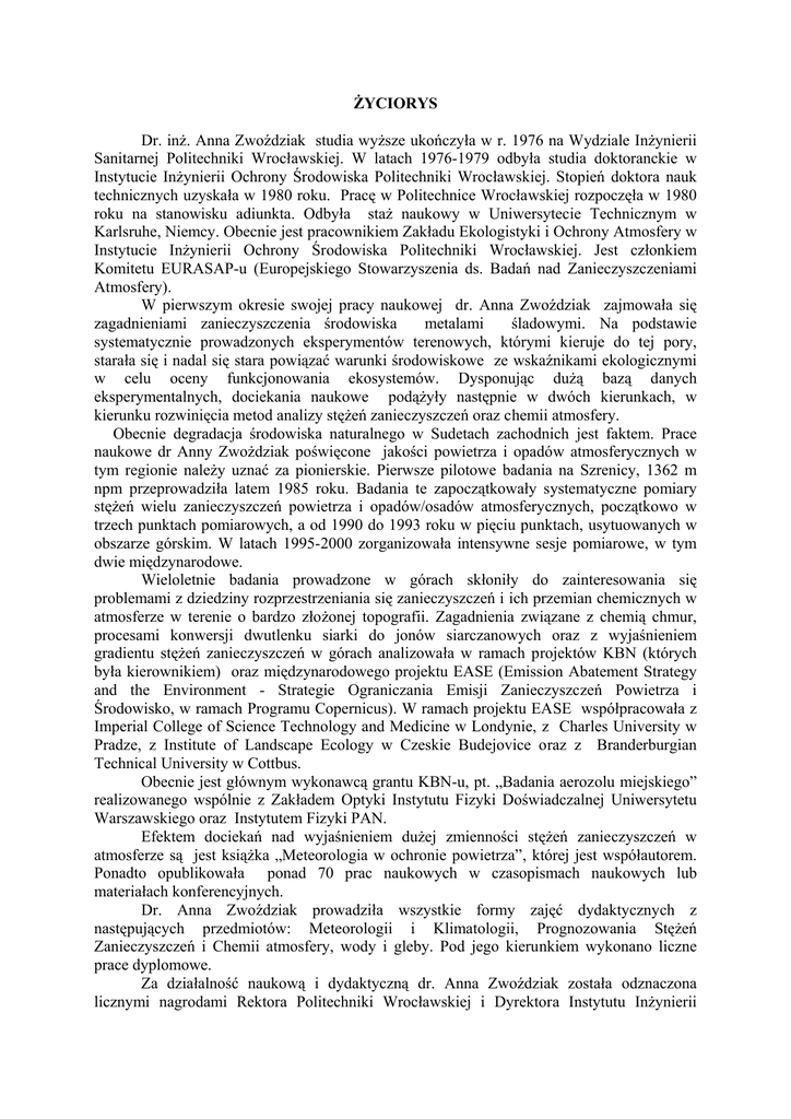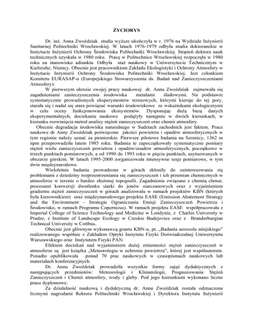 ŻYCIORYS Dr. inż. Anna Zwoździak studia wyższe ukończyła w r. 1976 na Wydziale Inżynierii Sanitarnej Politechniki Wrocławskiej. W latach 1976-1979 odbyła studia doktoranckie w Instytucie Inżynierii Ochrony Środowiska Politechniki Wrocławskiej. Stopień doktora nauk technicznych uzyskała w 1980 roku. Pracę w Politechnice Wrocławskiej rozpoczęła w 1980 roku na stanowisku adiunkta. Odbyła staż naukowy w Uniwersytecie Technicznym w Karlsruhe, Niemcy. Obecnie jest pracownikiem Zakładu Ekologistyki i Ochrony Atmosfery w Instytucie Inżynierii Ochrony Środowiska Politechniki Wrocławskiej. Jest członkiem Komitetu EURASAP-u (Europejskiego Stowarzyszenia ds. Badań nad Zanieczyszczeniami Atmosfery). W pierwszym okresie swojej pracy naukowej dr. Anna Zwoździak zajmowała się zagadnieniami zanieczyszczenia środowiska metalami śladowymi. Na podstawie systematycznie prowadzonych eksperymentów terenowych, którymi kieruje do tej pory, starała się i nadal się stara powiązać warunki środowiskowe ze wskaźnikami ekologicznymi w celu oceny funkcjonowania ekosystemów. Dysponując dużą bazą danych eksperymentalnych, dociekania naukowe podążyły następnie w dwóch kierunkach, w kierunku rozwinięcia metod analizy stężeń zanieczyszczeń oraz chemii atmosfery. Obecnie degradacja środowiska naturalnego w Sudetach zachodnich jest faktem. Prace naukowe dr Anny Zwożdziak poświęcone jakości powietrza i opadów atmosferycznych w tym regionie należy uznać za pionierskie. Pierwsze pilotowe badania na Szrenicy, 1362 m npm przeprowadziła latem 1985 roku. Badania te zapoczątkowały systematyczne pomiary stężeń wielu zanieczyszczeń powietrza i opadów/osadów atmosferycznych, początkowo w trzech punktach pomiarowych, a od 1990 do 1993 roku w pięciu punktach, usytuowanych w obszarze górskim. W latach 1995-2000 zorganizowała intensywne sesje pomiarowe, w tym dwie międzynarodowe. Wieloletnie badania prowadzone w górach skłoniły do zainteresowania się problemami z dziedziny rozprzestrzeniania się zanieczyszczeń i ich przemian chemicznych w atmosferze w terenie o bardzo złożonej topografii. Zagadnienia związane z chemią chmur, procesami konwersji dwutlenku siarki do jonów siarczanowych oraz z wyjaśnieniem gradientu stężeń zanieczyszczeń w górach analizowała w ramach projektów KBN (których była kierownikiem) oraz międzynarodowego projektu EASE (Emission Abatement Strategy and the Environment - Strategie Ograniczania Emisji Zanieczyszczeń Powietrza i Środowisko, w ramach Programu Copernicus). W ramach projektu EASE współpracowała z Imperial College of Science Technology and Medicine w Londynie, z Charles University w Pradze, z Institute of Landscape Ecology w Czeskie Budejovice oraz z Branderburgian Technical University w Cottbus. Obecnie jest głównym wykonawcą grantu KBN-u, pt. „Badania aerozolu miejskiego” realizowanego wspólnie z Zakładem Optyki Instytutu Fizyki Doświadczalnej Uniwersytetu Warszawskiego oraz Instytutem Fizyki PAN. Efektem dociekań nad wyjaśnieniem dużej zmienności stężeń zanieczyszczeń w atmosferze są jest książka „Meteorologia w ochronie powietrza”, której jest współautorem. Ponadto opublikowała ponad 70 prac naukowych w czasopismach naukowych lub materiałach konferencyjnych. Dr. Anna Zwoździak prowadziła wszystkie formy zajęć dydaktycznych z następujących przedmiotów: Meteorologii i Klimatologii, Prognozowania Stężeń Zanieczyszczeń i Chemii atmosfery, wody i gleby. Pod jego kierunkiem wykonano liczne prace dyplomowe. Za działalność naukową i dydaktyczną dr. Anna Zwoździak została odznaczona licznymi nagrodami Rektora Politechniki Wrocławskiej i Dyrektora Instytutu Inżynierii Ochrony Środowiska. Uzyskała nagrodę Ministra Edukacji Narodowej oraz Ministra Ochrony Środowiska, Zasobów Naturalnych i Leśnictwa. Najważniejsze publikacje 1. Zwoździak J., Zwoździak A., 1990. Sulphate aerosol production in the upper parts of the Sudety Range, J. Aerosol Sc. 21, 369-372. 2. Zwoździak J., Zwoździak A., 1991. Chemical composition of aerosol and rime ice samples collected at the summit of Szrenica, Sudeten, Poland, Wiss.Umwelt., 113116. 3. Zwoździak J., Zwoździak A., 1992. Atmospheric sulphate formation and air pollution episodes in the upper parts of the Karkonosze mountains, Envir. Protec. Engng 16, 89-98. 4. Zwoździak J., Zwoździak A., Kmieć G., 1994. Pollutant and wind data for episodes in the atmosphere over the Sudeten, Poland, Envir. Protec. Engng 20, 53-72. 5. Kmieć G., Zwoździak J., Zwoździak A., 1994. Cloud water chemistry and its effect on precipitation composition, Envir. Protec. Engng 20, 73- 87. 6. Zwoździak J., Zwoździak A., Kmieć G., Kacperczyk K. 1995. Some observations of pollutant fluxes over the Sudeten, south-western Poland. Water, Air and Soil Poll., 85, 2009-2013. 7. Kmieć G., Kacperczyk K., Zwoździak A., Zwoździak J. 1995. Acid pollutants in air and precipitation/deposition at the Sudeten Mountains, Poland. Air, Water, Air and Soil Poll., 85: 2131-2136. 8. Zwoździak J., Zwoździak A., Szczurek A.,1998, Meteorologia w Ochronie Atmosfery, Oficyna Wydawnicza Politechniki Wrocławskiej, Wrocław 1998. 9. Zwoździak J., Zwoździak A., Kmieć G., 1999, Spatial patterns of pollutant concentrations in the Mount Szrenica region, Poland, w: Air Quality and Atmospheric Sciences (ed. Chen Fu), China Ocean Press, Pekin, 28-33. 10.Zwoździak J., Zwoździak A., Sówka I., Wieprecht W., 1999, Determination of hydrogen peroxide concentrations in the air, Archives of Environ. Protec., 25, 17-27. 11.Acker K., Wieprecht W., Moller D., Auel R., Kolass D., Zwoździak J., Zwoździak A., Kmieć G. 1999, Results of cloud water and air chemistry measurements at Mt. Szrenica, Poland, w: Chemical Mechanism; Photo-oxidants, Aerosol and Clouds (ed. P.M. Borell i P. Borell), Southampton WIT Press, 448-452. 12.Acker K., Wieprecht W., Moller D., Auel R., Kolass D., Zwo