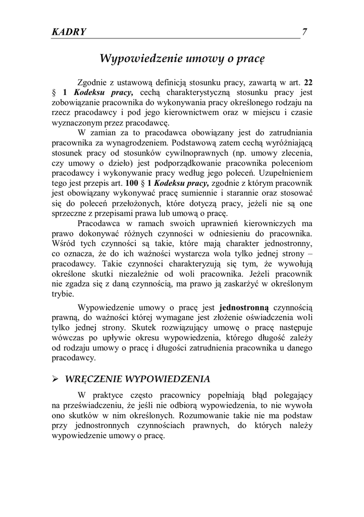 KADRY 7 Wypowiedzenie umowy o pracę Zgodnie z ustawową definicją stosunku pracy, zawartą w art. 22 § 1 Kodeksu pracy, cechą charakterystyczną stosunku pracy jest zobowiązanie pracownika do wykonywania pracy określonego rodzaju na rzecz pracodawcy i pod jego kierownictwem oraz w miejscu i czasie wyznaczonym przez pracodawcę. W zamian za to pracodawca obowiązany jest do zatrudniania pracownika za wynagrodzeniem. Podstawową zatem cechą wyróżniającą stosunek pracy od stosunków cywilnoprawnych (np. umowy zlecenia, czy umowy o dzieło) jest podporządkowanie pracownika poleceniom pracodawcy i wykonywanie pracy według jego poleceń. Uzupełnieniem tego jest przepis art. 100 § 1 Kodeksu pracy, zgodnie z którym pracownik jest obowiązany wykonywać pracę sumiennie i starannie oraz stosować się do poleceń przełożonych, które dotyczą pracy, jeżeli nie są one sprzeczne z przepisami prawa lub umową o pracę. Pracodawca w ramach swoich uprawnień kierowniczych ma prawo dokonywać różnych czynności w odniesieniu do pracownika. Wśród tych czynności są takie, które mają charakter jednostronny, co oznacza, że do ich ważności wystarcza wola tylko jednej strony – pracodawcy. Takie czynności charakteryzują się tym, że wywołują określone skutki niezależnie od woli pracownika. Jeżeli pracownik nie zgadza się z daną czynnością, ma prawo ją zaskarżyć w określonym trybie. Wypowiedzenie umowy o pracę jest jednostronną czynnością prawną, do ważności której wymagane jest złożenie oświadczenia woli tylko jednej strony. Skutek rozwiązujący umowę o pracę następuje wówczas po upływie okresu wypowiedzenia, którego długość zależy od rodzaju umowy o pracę i długości zatrudnienia pracownika u danego pracodawcy. WRĘCZENIE WYPOWIEDZENIA W praktyce często pracownicy popełniają błąd polegający na przeświadczeniu, że jeśli nie odbiorą wypowiedzenia, to nie wywoła ono skutków w nim określonych. Rozumowanie takie nie ma podstaw przy jednostronnych czynnościach prawnych, do których należy wypowiedzenie umowy o pracę.