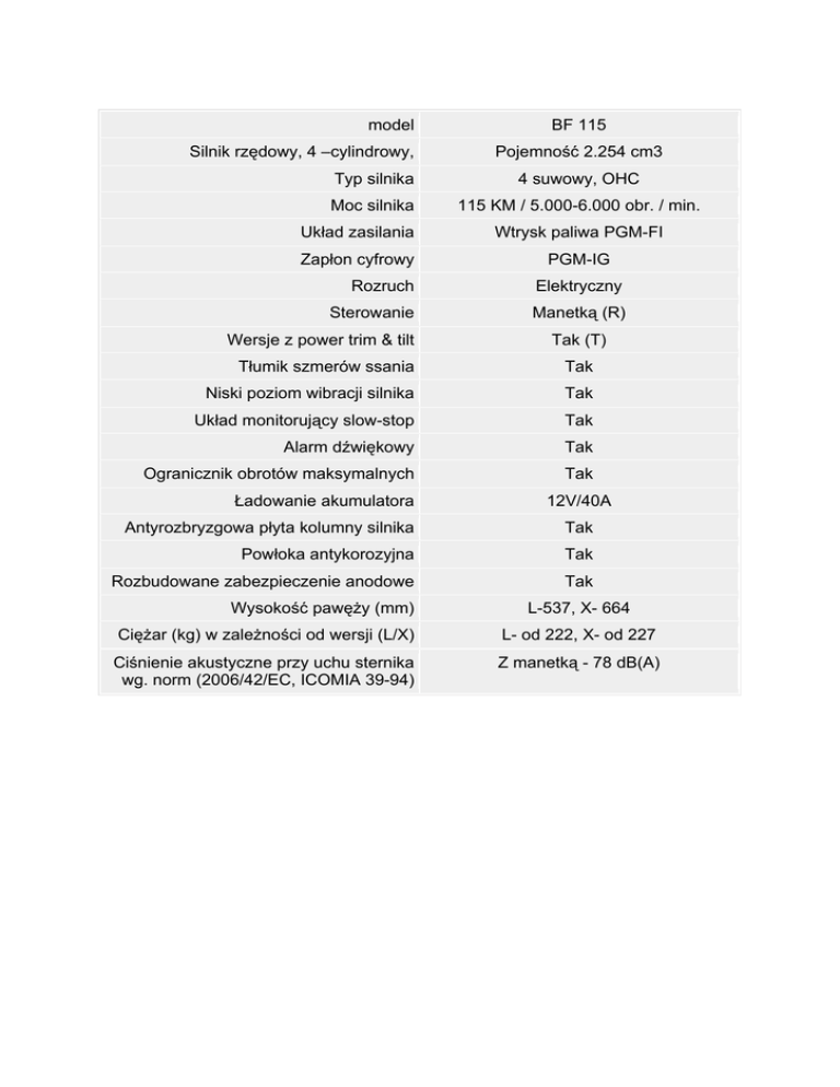 model Silnik rzędowy, 4 –cylindrowy, BF 115 Pojemność 2.254 cm3 Typ silnika 4 suwowy, OHC Moc silnika 115 KM / 5.000-6.000 obr. / min. Układ zasilania Wtrysk paliwa PGM-FI Zapłon cyfrowy PGM-IG Rozruch Elektryczny Sterowanie Manetką (R) Wersje z power trim & tilt Tak (T) Tłumik szmerów ssania Tak Niski poziom wibracji silnika Tak Układ monitorujący slow-stop Tak Alarm dźwiękowy Tak Ogranicznik obrotów maksymalnych Tak Ładowanie akumulatora 12V/40A Antyrozbryzgowa płyta kolumny silnika Tak Powłoka antykorozyjna Tak Rozbudowane zabezpieczenie anodowe Tak Wysokość pawęży (mm) L-537, X- 664 Ciężar (kg) w zależności od wersji (L/X) L- od 222, X- od 227 Ciśnienie akustyczne przy uchu sternika wg. norm (2006/42/EC, ICOMIA 39-94) Z manetką - 78 dB(A)