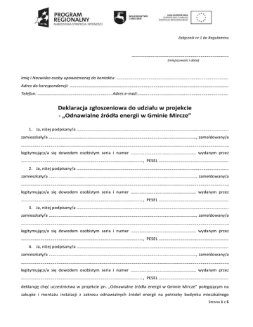 Załącznik nr 1 do Regulaminu ………………….………………………………………………………….. (miejscowość i data) Imię i Nazwisko osoby upoważnionej do kontaktu: ………………………………………………………………………………………….. Adres do korespondencji: ……………………………………………………………………………..………..………..………..……………………. Telefon: …………………………………………………………… Adres e-mail:………………..………………………………………………………. Deklaracja zgłoszeniowa do udziału w projekcie - „Odnawialne źródła energii w Gminie Mircze” 1. Ja, niżej podpisany/a ………………………………………………........…………………………..….……………………….............. zamieszkały/a ……………………………….……………………………………………………….................………………, zameldowany/a …………………………………………………………………………………………………………………………………………………………………………, legitymujący/a się dowodem osobistym seria i numer …….............…..…..………………………… wydanym przez ………………………………………………………..………………………………………..., PESEL ……………………………………………………….. 2. Ja, niżej podpisany/a ………………………………………………........…………………………..….……………………….............. zamieszkały/a ……………………………….……………………………………………………….................………………, zameldowany/a …………………………………………………………………………………………………………………………………………………………………………, legitymujący/a się dowodem osobistym seria i numer …….............…..…..………………………… wydanym przez ………………………………………………………..………………………………………..., PESEL ……………………………………………………….. 3. Ja, niżej podpisany/a ………………………………………………........…………………………..….……………………….............. zamieszkały/a ……………………………….……………………………………………………….................………………, zameldowany/a …………………………………………………………………………………………………………………………………………………………………………, legitymujący/a się dowodem osobistym seria i numer …….............…..…..………………………… wydanym przez ………………………………………………………..………………………………………..., PESEL ……………………………………………………….. 4. Ja, niżej podpisany/a ………………………………………………........…………………………..….……………………….............. zamieszkały/a ……………………………….……………………………………………………….................………………, zameldowany/a …………………………………………………………………………………………………………………………………………………………………………, legitymujący/a się dowodem osobistym seria i numer …….............…..…..………………………… wydanym przez ………………………………………………………..………………………………………..., PESEL ……………………………………………………….. deklaruję chęć uczestnictwa w projekcie pn. „Odnawialne źródła energii w Gminie Mircze” polegającym na zakupie i montażu instalacji z zakresu odnawialnych źródeł energii na potrzeby budynku mieszkalnego Strona 1 z 5 * zlokalizowanego na terenie Gminy Mircze, stanowiącego moją własność/współwłasność i położonego na działce o nr ewid. ………………………………………, obręb …………………………………..................................., pod adresem …………………………………………………………………………………………………………………………………………………………………………. Wybrany przeze mnie rodzaj instalacji - kolektory słoneczne. Jestem świadomy/a odpowiedzialności karnej za składanie fałszywych oświadczeń lub zatajenie prawdy, a podane przeze mnie dane są zgodne z prawdą i stanem faktycznym, w związku z tym oświadczam, że: 1. Zapoznałem/am się z Regulaminem naboru wniosków w ramach projektu pn. „Odnawialne źródła energii 2. 3. 4. 5. 6. w Gminie Mircze” planowanego do realizacji przez Gminę Mircze w latach 2016-2018 i akceptuję jego treść. Posiadam prawo do dysponowania nieruchomością (działką wraz z istniejącym budynkiem mieszkalnym, dla którego planowany jest montaż instalacji w ramach projektu) położoną na terenie Gminy Mircze, na podstawie (właściwe proszę zaznaczyć): aktu notarialnego księgi wieczystej postanowienia Sądu innego dokumentu, tj. ……………………………………………………………………………………………………….................... Na tej podstawie posiadam prawo do dysponowania ww. nieruchomością co najmniej do dnia 31.12.2023 r. w sposób umożliwiający montaż i użytkowanie instalacji, której efekty będą wykorzystywane wyłącznie na 