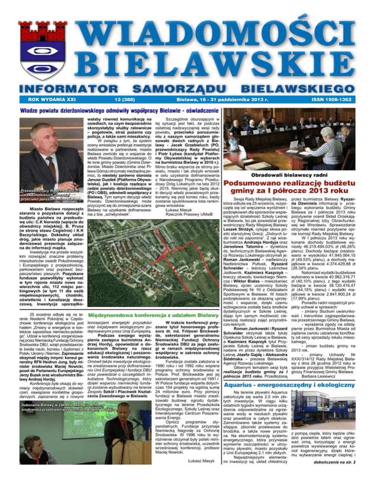 INFORMATOR ROK WYDANIA XXI SAMORZĄDU 13 (388) BIELAWSKIEGO Bielawa, 16 - 31 października 2013 r. ISSN 1508-1362 Władze powiatu dzierżoniowskiego odmówiły współpracy Bielawie - oświadczenie wałaby również komunikację na osiedlach, na czym bezpośrednio skorzystałyby służby ratownicze – pogotowie, straż pożarna czy policja, a także sami mieszkańcy. W związku z tym, że system oceny wniosków preferuje inwestycje realizowane w partnerstwie, miasto Bielawa zwróciło się o wsparcie do władz Powiatu Dzierżoniowskiego. O ile inne gminy powiatu (Gmina Dzierżoniów, Miasto Dzierżoniów oraz Piława Górna) otrzymały niezbędną pomoc, to niestety zarówno starosta Janusz Guzdek (Platforma Obywatelska), jak i koalicja rządząca w radzie powiatu dzierżoniowskiego Przewodniczący Rady Powiatu (PO i OBS), odmówili współpracy z Jacek Grzebieluch głosował Bielawą. Tym samym decyzja władz przeciwko porozumieniu z Bielawą Powiatu Dzierżoniowskiego może przyczynić się do zmniejszenia szans Miasto Bielawa rozpoczęło Bielawy na uzyskanie dofinansowastarania o pozyskanie dotacji z nia z tzw. „schetynówek”. budżetu państwa na przebudowę ulic: C.K Norwida (wpięcie do obwodnicy miejskiej), B. Prusa (w stronę stawu Cegielnia) i K.K Baczyńskiego. Dokładny układ dróg, jakie miasto planuje zmodernizować prezentuje załączona do informacji mapka. Inwestycja ma przede wszystkim rozwiązać znaczne problemy mieszkańców osiedli Południowego i Europejskiego z przejezdnością, parkowaniem oraz poprawić bezpieczeństwo pieszych. Pozyskane fundusze pozwoliłyby wykonać w tym rejonie miasta nowe nawierzchnie ulic, 112 miejsc parkingowych (w tym 11 dla osób niepełnosprawnych), chodniki, oświetlenie i kanalizację deszczową. Inwestycja uporządko- Szczególnie oburzającym w tej sytuacji jest fakt, że podczas ostatniej nadzwyczajnej sesji rady powiatu, przeciwko porozumieniu z naszym samorządem głosowało dwóch radnych z Bielawy - Jacek Grzebieluch (PO, przewodniczący Rady Powiatu) i Piotr Łyżwa (kandydat Platformy Obywatelskiej w wyborach na burmistrza Bielawy w 2010 r.). Mimo braku wsparcia ze strony powiatu, miasto i tak złożyło wniosek w celu uzyskania dofinansowania Obradowali bielawscy radni z Narodowego Programu Przebudowy Dróg Lokalnych na lata 2012 – 2015. Niemniej jakie będą skutki decyzji władz powiatowych przekonamy się pod koniec roku, kiedy Sesja Rady Miejskiej Bielawy, przez burmistrza Bielawy Ryszarzostanie opublikowana lista rankinktóra odbyła się 25 września, rozpo- da Dźwiniela informację o przegowa wniosków. częła się od wręczenia wyróżnień i biegu wykonania budżetu Gminy Łukasz Masyk podziękowań dla sponsorów wspie- Bielawa za I półrocze 2013 roku Rzecznik Prasowy UMwB rających działalność Szkoły Leśnej pozytywnie ocenił Skład Orzekająw Bielawie, bo jak powiedział prze- cy Regionalnej Izby Obrachunkowodniczący Rady Miejskiej Bielawy wej we Wrocławiu. Sprawozdanie Leszek Stróżyk, cytując słowa po- otrzymało również pozytywne opietki starożytnej Grecji: „Dobrych lu- nie komisji Rady Miejskiej Bielawy. dzi nikt nie zapomina”. Z rąk wiceW I półroczu 2013 roku wyburmistrza Andrzeja Hordyja oraz konane dochody budżetowe wyJarosława Tatomira – dyrektora niosły 46.219.494,03% zł (46,26% ds. technicznych Bielawskiej Agen- planu). Dochody bieżące zrealizocji Rozwoju Lokalnego otrzymali je: wano w wysokości 41.845.064,15 Roman Jankowski – nadleśniczy zł (49,53% planu), a dochody maNadleśnictwa Pułtusk, Ryszard jątkowe w kwocie 4.374.429,88 zł Schneider – leśniczy Leśnictwa (28,34% planu. Jodłownik, Kazimierz Kasprzyk – Natomiast wydatki budżetowe łowczy obwodu łowieckiego Niem- wykonano w kwocie 40.962.316,71 cza i Wiktor Białas – mieszkaniec zł (40,10% planu), z tego wydatki Bielawy, ojciec uczennicy Szkoły bieżące w kwocie 38.120.416,47 Podstawowej Nr 10 z Oddziałami zł (44,15% planu) i wydatki maSportowymi w Bielawie. W listach jątkowe w kwocie 2.841.900,24 zł podziękowano za okazaną uprzej- (17,99% planu). mość i wsparcie, dzięki czemu Ponadto radni rozpatrzyli prowzbogacona została baza środków jekty uchwał w sprawach: dydaktycznych w Szkole Leśnej, - zmiany Studium uwarunko25 września odbyła się na te- Międzynarodowa konferencja z udziałem Bielawy dając tym samym możliwość cie- wań i kierunków zagospodarowarenie Akademii Polonijnej w Częstokawszej realizacji zajęć przyrodni- nia przestrzennego Gminy Bielawa, W trakcie konferencji przy- czo-leśnych. chowie konferencja ekologiczna pod koncepcjami energetyki przyszłości - wyrażenia zgody na odstąhasłem „Zmiany w energetyce w kon- oraz inicjatywami ekologicznymi po- znano tytuł honorowego profeRoman Jankowski i Ryszard pienie przez Burmistrza Miasta od tekście sąsiedztwa niemiecko-polskie- dejmowanymi przez Unię Europejską. sora dr. inż. Fritzowi Brickwed- Schneider otrzymali także tytuły żądania zwrotu udzielonej bonifikaPodczas swojego wystą- de, sekretarzowi generalnemu Opiekuna Szkoły Leśnej w Bielawie, ty od ceny sprzedaży lokalu mieszgo”. Udział w konferencji zorganizowanej przez Niemiecką Fundację Ochrony pienia zastępca burmistrza An- Niemieckiej Fundacji Ochrony a Kazimierz Kasprzyk tytuł Przy- kalnego, Środowiska DBU, wzięli przedstawicie- drzej Hordyj, opowiedział o do- Środowiska DBU za jego zasłu- jaciela Szkoły Leśnej w Bielawie, - zmian budżetu gminy na le świata nauki, biznesu i dyplomaci z konaniach Bielawy na rzecz gi w ramach międzynarodowej nadane im przez dyrektora Szkoły 2013 rok, edukacji ekologicznej i poszanowspółpracy w zakresie ochrony Polski, Ukrainy i Niemiec. Zaproszenie Leśnej Józefa Gajdę i Aleksandra zmiany Uchwały Nr otrzymali między innymi: konsul ge- wania środowiska naturalnego. środowiska. Siódmaka – prezesa Bielawskiej XXXI/314/12 Rady Miejskiej BielaFundacja została założona 