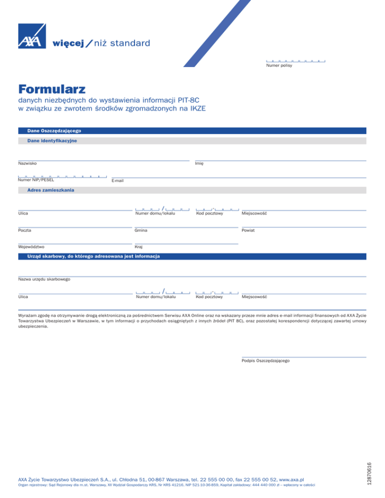 Numer polisy Formularz danych niezbędnych do wystawienia informacji PIT-8C w związku ze zwrotem środków zgromadzonych na IKZE Dane Oszczędzającego Dane identyfikacyjne Nazwisko Numer NIP/PESEL Imię E-mail Adres zamieszkania Ulica Numer domu/lokalu Poczta Gmina Województwo Kraj Kod pocztowy Miejscowość Powiat Urząd skarbowy, do którego adresowana jest informacja Nazwa urzędu skarbowego Ulica Numer domu/lokalu Kod pocztowy Miejscowość Wyrażam zgodę na otrzymywanie drogą elektroniczną za pośrednictwem Serwisu AXA Online oraz na wskazany przeze mnie adres e-mail informacji finansowych od AXA Życie Towarzystwa Ubezpieczeń w Warszawie, w tym informacji o przychodach osiągniętych z innych źródeł (PIT 8C), oraz pozostałej korespondencji dotyczącej zawartej umowy ubezpieczenia. AXA Życie Towarzystwo Ubezpieczeń S.A., ul. Chłodna 51, 00-867 Warszawa, tel. 22 555 00 00, fax 22 555 00 52, www.axa.pl Organ rejestrowy: Sąd Rejonowy dla m.st. Warszawy, XII Wydział Gospodarczy KRS, Nr KRS 41216, NIP 521-10-36-859, Kapitał zakładowy: 444 440 000 zł – wpłacony w całości 12870616 Podpis Oszczędzającego