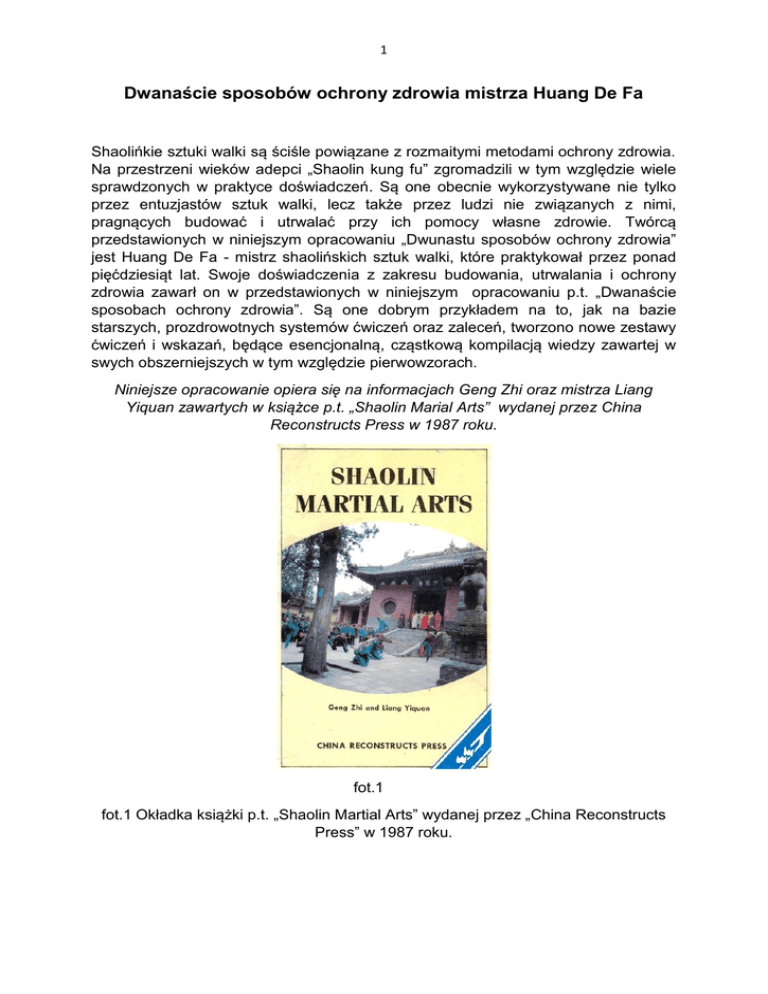 1 Dwanaście sposobów ochrony zdrowia mistrza Huang De Fa Shaolińkie sztuki walki są ściśle powiązane z rozmaitymi metodami ochrony zdrowia. Na przestrzeni wieków adepci „Shaolin kung fu” zgromadzili w tym względzie wiele sprawdzonych w praktyce doświadczeń. Są one obecnie wykorzystywane nie tylko przez entuzjastów sztuk walki, lecz także przez ludzi nie związanych z nimi, pragnących budować i utrwalać przy ich pomocy własne zdrowie. Twórcą przedstawionych w niniejszym opracowaniu „Dwunastu sposobów ochrony zdrowia” jest Huang De Fa - mistrz shaolińskich sztuk walki, które praktykował przez ponad pięćdziesiąt lat. Swoje doświadczenia z zakresu budowania, utrwalania i ochrony zdrowia zawarł on w przedstawionych w niniejszym opracowaniu p.t. „Dwanaście sposobach ochrony zdrowia”. Są one dobrym przykładem na to, jak na bazie starszych, prozdrowotnych systemów ćwiczeń oraz zaleceń, tworzono nowe zestawy ćwiczeń i wskazań, będące esencjonalną, cząstkową kompilacją wiedzy zawartej w swych obszerniejszych w tym względzie pierwowzorach. Niniejsze opracowanie opiera się na informacjach Geng Zhi oraz mistrza Liang Yiquan zawartych w książce p.t. „Shaolin Marial Arts” wydanej przez China Reconstructs Press w 1987 roku. fot.1 fot.1 Okładka książki p.t. „Shaolin Martial Arts” wydanej przez „China Reconstructs Press” w 1987 roku. 2 Dwanaście sposobów ochrony zdrowia mistrza Huang De Fa 1. Zalecenia wstępne oraz opis postawy ciała przed rozpoczęciem wykonywania ćwiczeń. Praktycy tych ćwiczeń wykonując je na zewnątrz pomieszczeń zazwyczaj czynią to w postawie stojącej, gdy natomiast praktykują je we wnętrzu pomieszczenia, np. w pokoju, wykonują je siedząc. Jeśli zamierzasz ćwiczyć stojąc, stań stopami równoległymi względem siebie, rozstawionymi na szerokość ramion. Palce stóp skierowane są w przód. Dłonie oparte są na tułowiu z obu jego stron, na wysokości talii. Jeśli chcesz wykonywać ćwiczenia siedząc, usiądź prosto, np. na krześle, i oprzyj obie stopy na podłożu tak, aby pięty spoczywały na nim, a stopy były oddalone od siebie w linii bocznej na szerokość bioder. Palce stóp skierowane są w przód. Połóż dłonie na kolanach. ( rys.1.) rys.1. Pierwszy sposób ROZCZESYWANIE WŁOSÓW PALCAMI DŁONI 3 rys.2. rys.2: Rysunki przedstawiające pierwszy sposób o nazwie „Rozczesywanie włosów palcami dłoni”. OPIS SPOSOBU Zegnij wszystkie palce w obu dłoniach. Przesuń opuszkami palców po skórze głowy, począwszy od przodu nad czołem, w tył, aż do potylicy. Przeczesuj palcami dłoni włosy na głowie, jak dwoma grzebieniami. Powtórz ruchy przeczesywania włosów szesnaście razy, bez względu na to, jakie długie posiadasz włosy. ODDZIAŁYWANIE Chroni włosy przed wypadaniem. UWAGI DO PRAKTYKI Aby nie podrapać skóry głowy, przed rozpoczęciem rozczesywania włosów palcami dłoni zadbaj o właściwą pielęgnację paznokci. Wykonuj czeszące ruchy palcami dłoni przesuwając je po głowie wyłącznie od przodu w tył. Przeczesując włosy palcami dłoni używaj takiej siły nacisku na skórę głowy, aby dotyk był przyjemny. Drugi sposób MASAŻ TWARZY, NOSA, OCZU ORAZ SKRONI OPIS SPOSOBU 1. Pocieraj dłonie o siebie do chwili, aż poczujesz, że stały się gorące. Rozmasuj skórę twarzy rozgrzanymi pocieraniem dłońmi, przesuwając je po niej naprzemiennie w górę i w dół szesnaście razy, tj. sunąc nimi po twarzy szesnaście razy w górę i szesnaście razy w dół. 2. Rozmasuj obszar po obu stronach nosa opuszkami środkowych palców dłoni, przesuwając je z obu jego stron, począwszy od poziomu oczu, w dół, aż do poziomu dziurek nosa. 3. Wykonaj powyższe ruchy palcami dłoni szesnaście razy. 4. Zamknij oczy, a następnie przyłóż opuszki palców do powiek. Przesuń szesnaście razy opuszki palców dłoni po powiekach i znajdujących się pod nimi gałkach oczu, począwszy od sąsiadującej z nosem wewnętrznej strony, ku stronie zewnętrznej, znajdującej się bliżej skroni. 5. Rozmasuj skronie opuszkami kciuków dłoni. Uczyń to przesuwając je szesnaście razy po skroniach, od przodu głowy w tył, w kierunku karku. ODDZIAŁYWANIE Redukuje zmarszczki na twarzy. 4 UWAGI DO PRAKTYKI Wykonując niniejsze ćwiczenie oddychaj miarowo i głęboko, wstrzymując oddech w trakcie przesuwania palców dłoni po skórze głowy. Pocieraj dłonie o siebie aż do ich rozgrzania się nie wydając przy tym żadnych dźwięków. Trzeci sposób PORUSZANIE OCZAMI rys.3. rys.3: Rysunek przedstawiający trzeci sposób o nazwie „Poruszanie oczami”. OPIS SPOSOBU Spleć z sobą palce dłoni, a następnie połóż splecione dłonie na potylicy. Zamknij powoli oczy. 1. Poruszaj gałkami ocznymi naprzemiennie w prawo i w lewo trzydzieści sześć razy, tj. po osiemnaście razy w każdą stronę. 2. Wykonaj gałkami ocznymi osiem okrężnych ruchów, zgodne z kierunkiem ruchu wskazówek zegara, a następnie kolejne osiem w przeciwnym kierunku. ( rys.3.) ODDZIAŁYWANIE Chroni oczy przed chorobami. UWAGI DO PRAKTYKI Gdy poruszasz gałkami oczu naprzemiennie w lewo i w prawo, wykonaj to w każdą ze stron najdalej, jak to tylko możliwe. Gdy poruszasz gałkami oczu okrężnie, w kierunku „na zewnątrz”, zrób to najobszerniej, jak tylko zdołasz. Czwarty sposób STUKANIE ZĘBAMI O SIEBIE 5 OPIS SPOSOBU Utrzymuj postawę ciała oraz ułożenie rąk takie, jakie przyjąłeś wykonując poprzednie ćwiczenie. Zamknij usta. Nie rozdzielając warg rozewrzyj zęby osadzone w szczęce oraz w żuchwie tak dalece, jak to tylko możliwe. Zastukaj zębami o siebie trzydzieści sześć razy. ODDZIAŁYWANIE Stabilizuje zęby w dziąsłach. UWAGI DO PRAKTYKI Stukaj zębami o siebie słyszalnie, lecz niezbyt mocno i nie za szybko. Stukaj zębami o siebie czterokrotnie w trakcie każdego wydechu. Piąty sposób PORUSZANIE JĘZYKIEM WE WNĘTRZU JAMY USTNEJ OPIS SPOSOBU Spleć z sob