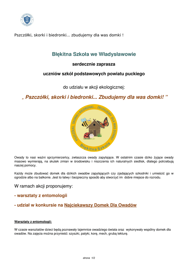 Pszczółki, skorki i biedronki... zbudujemy dla was domki ! Błękitna Szkoła we Władysławowie serdecznie zaprasza uczniów szkół podstawowych powiatu puckiego do udziału w akcji ekologicznej: „ Pszczółki, skorki i biedronki... Zbudujemy dla was domki! ” Owady to nasi ważni sprzymierzeńcy, zwłaszcza owady zapylające. W ostatnim czasie dziko żyjące owady masowo wymierają, na skutek zmian w środowisku i niszczenia ich naturalnych siedlisk, dlatego potrzebują naszej pomocy. Każdy może zbudować domek dla dzikich owadów zapylających czy zjadających szkodniki i umieścić go w ogrodzie albo na balkonie. Jest to łatwy i bezpieczny sposób aby stworzyć im dobre miejsce do rozrodu. W ramach akcji proponujemy: - warsztaty z entomologii - udział w konkursie na Najciekawszy Domek Dla Owadów Warsztaty z entomologii: W czasie warsztatów dzieci będą poznawały tajemnice owadziego świata oraz wykonywały wspólny domek dla owadów. Na zajęcia można przynieść: szyszki, patyki, korę, mech, grubą tekturę. strona 1/2 Wszystkie chętne klasy prosimy o kontakt z Błękitną Szkołą : tel. 58 673 16 43 lub kom. 531 375 224 w celu ustalenia terminu zajęć (od 16 marca do 30 kwietnia br.) Zajęcia będą się odbywały w naszej siedzibie lub szkołach. Konkurs na Najciekawszy Domek Dla Owadów : Aby wziąć udział w konkursie należy zbudować domek dla owadów i do 15 maja br. przysłać 2-3 zdjęcia swojego domku razem z autorem (wymiar dłuższego boku min 1000 pikseli), na adres mailowy Błękitnej Szkoły : [email protected] Prosimy o zamieszczenie pełnych informacji o autorze. (Imię i nazwisko ucznia, klasa, nazwa szkoły, imię, nazwisko i kontakt do nauczyciela koordynującego). Prace będą ocenianie dwóch kategoriach wiekowych: • 1 kategoria: klasy 0-III • 2 kategoria: klasy IV-VI Domki należy wykonać z różnego rodzaju materiałów naturalnych (przyrodniczych) jak np.: trzcina, drewno, glina, siano, szyszki, patyki, kora. Można również wykorzystać surowce wtórne pochodzące np. z opakowań. Instrukcje dotyczące prawidłowego wykonania domków można znaleźć m.in. na stronach: www.greenpeace.org www.pomagamypszczolom.pl Konkurs zostanie rozstrzygnięty do dnia 20 maja br. przez powołaną komisję konkursową. Lista załączników: 1. Regulamin konkursu strona 2/2 Powered by TCPDF (www.tcpdf.org)