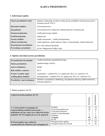 KARTA PRZEDMIOTU 1. Informacje ogólne Nazwa przedmiotu i kod: Handel i marketing wyrobów medycznych, produktów farmaceutycznych i kosmetycznych T.D1.2 Kierunek studiów: Towaroznawstwo Specjalność: Towaroznawstwo medyczne, farmaceutyczne i kosmetyczne Poziom kształcenia: studia pierwszego stopnia Profil kształcenia: praktyczny Forma studiów: studia stacjonarne / studia niestacjonarne Obszar kształcenia: nauki społeczne, nauki rolnicze, leśne i weterynaryjne, nauki techniczne Koordynator przedmiotu: dr n. biol. Henryk Różański Prowadzący przedmiot: dr inż. Małgorzata Źródło-Loda 2. Ogólna charakterystyka przedmiotu Przynależność do modułu: moduł kształcenia specjalnościowego Status przedmiotu: ograniczonego wyboru Język wykładowy: polski Rok studiów, semestr: III, 5 Forma i wymiar zajęć stacjonarne - wykład 30 h, ćw. praktyczne 20 h, ćw. terenowe 5 h według planu studiów: niestacjonarne - wykład 10 h, ćw. praktyczne 10 h, ćw. terenowe 5 h Przedmioty wprowadzające: Podstawy zarządzania, Marketing, Zarządzanie jakością, Opakowalnictwo, Przechowalnictwo 4 A. Liczba godzin wymagających bezpośredniego udziału nauczyciela z podziałem na typy zajęć oraz całkowita liczba punktów ECTS osiąganych na tych zajęciach Wykład Ćwiczenia praktyczne Ćwiczenia terenowe Udział w konsultacjach Egzamin w sumie: ECTS Przygotowanie ogólne Przygotowanie do ćwiczeń B. Poszczególne typy zadań do samokształcenia studenta (niewymagających niestacjonarne Całkowita liczba punktów ECTS stacjonarne 3. Bilans punktów ECTS 30 20 5 2 2 59 2.0 5 15 10 10 5 5 2 32 1.1 16 20 bezpośredniego udziału nauczyciela) wraz z planowaną średnią liczbą godzin na każde i sumaryczną liczbą ECTS C. Liczba godzin praktycznych/laboratoryjnych w ramach przedmiotu oraz związana z tym liczba punktów ECTS Przygotowywanie do kolokwium Przygotowanie sprawozdań z ćwiczeń terenowych Przygotowanie do egzaminu Praca w bibliotece Praca w sieci w sumie: ECTS Ćwiczenia praktyczne Przygotowanie do ćwiczeń Przygotowanie sprawozdań z ćwiczeń terenowych Ćwiczenia terenowe w sumie: ECTS 10 10 5 10 12 5 61 2.0 20 15 10 10 12 10 88 2.9 10 20 5 5 45 1.5 10 5 45 1.5 4. Opis przedmiotu Cel przedmiotu: Celem przedmiotu jest zapoznanie studentów z podstawową wiedzą z handlu i marketingu wyrobów medycznych, produktów farmaceutycznych i kosmetycznych oraz wykształcenie umiejętności praktycznego poruszania się w tej tematyce. Metody dydaktyczne: wykład informacyjny z prezentacją multimedialną, ćwiczenia praktyczne, ćwiczenia terenowe Treści kształcenia: Wykłady: 1. Handel – istota, funkcje, struktura. 2. Handel detaliczny wyrobami medycznymi, produktami farmaceutycznymi i kosmetycznymi – cechy i formy. 3. Handel hurtowy wyrobami medycznymi, produktami farmaceutycznymi i kosmetycznymi – cechy i formy. 4. Organizowanie procesu sprzedaży. Organizacja i funkcjonowanie działu handlowego. 5. Specyfika marketingu wyrobów medycznych, produktów farmaceutycznych i kosmetycznych. 6. Produkt – klasyfikacja wyrobów medycznych, produktów farmaceutycznych i kosmetycznych. 7. Polityka cenowa i dystrybucja w odniesieniu do wyrobów medycznych, produktów farmaceutycznych i kosmetycznych. 8. Promocja wyrobów medycznych, produktów farmaceutycznych i kosmetycznych. 9. Zarządzanie relacjami z klientem CRM. 10. Organizacja marketingu w przedsiębiorstwie. Ćwiczenia praktyczne: 1. Dobór źródeł informacji handlowej i marketingowej na rynku wyrobów medycznych, produktów farmaceutycznych i kosmetycznych. 2. Analiza i ocena strategii wybranych producentów wyrobów medycznych – studium przypadku. 3. Analiza i ocena strategii wybranych producentów produktów farmaceutycznych – studium przypadku. 4. Analiza i ocena strategii wybranych producentów produktów kosmetycznych – studium przypadku. 5. Organizowanie procesu sprzedaży dla wybranego producenta wyrobów medycznych, produktów farmaceutycznych lub kosmetycznych. 6. Wykonanie analizy otoczenia konkurencyjnego dla wybranego producenta wyrobów medycznych, produktów farmaceutycznych lub kosmetycznych. 7. Analiza portfela oferowanych produktów wybranego producenta wyrobów medycznych, produktów farmaceutycznych lub kosmetycznych. 8. Opracowanie propozycji strategii dla wybranego producenta wyrobów medycznych, produktów farmaceutycznych lub kosmetycznych odnośnie: produktu, dystrybucji, ceny i promocji. Ćwiczenia terenowe: 1. Poznanie zastosowania w praktyce działań handlowych i marketingowych podejmowanych przez podmioty gospodarcze w odniesieniu do wyrobów medycznych, produktów farmaceutycznych lub kosmetycznych. 5. Efekty kształcenia i sposoby weryfikacji Efekty kształcenia Efekt przedmiotu Student, który zaliczył przedmiot (spełnił minimum wymagań) Efekt kierunkowy Wiedza: T.D1.2_K_W01 Zna istotę, cechy, strukturę i funkcje różnych form handlu wyrobów medycznych, produktów farmaceutycznych i kosmetycznych T.D1.2_K_W02 Posiada wiedzę odnośnie organizowanie procesu organizacji i funkcjonowania działu handlowego T.D1.2_K_W03 Zna specyfikę marketingu wyrobów farmaceutycznych i kosmetycznych T.D1.2_K_W04 Posiada wiedzę na temat instrumentów marketingu-mix w odniesieniu do wyrobów medycznych, produktów farmaceutycznych i kosmetycznych T.D1.2_K_W05 Posiada wiedzę w zakresie zarządzania relacjami z klientem CRM T.D1.2_K_W06 Ma wiedze odnośnie organizacji marketingu w przedsiębiorstwie sprzedaży oraz medycznych, produktów K_W11 K_W13 K_W15 K_W11 K_W13 K_W15 K_W11 K_W13 K_W04 K_W09 K_W11 K_W13 K_W04 K_W05 K_W14 K_W06 K_W15 Umiejętności: T.D1.12_K_U01 Potrafi zorganizować proces sprzedaży dla wybranego producenta wyrobów medycznych, produktów farmaceutycznych lub kosmetycznych T.D1.2_K_U02 Posiada zdolność doboru metod wykorzystywanych w analizie marketingowej T.D1.2_K_U03 Potrafi formułować wnioski z przeprowadzonych analiz. K_U06 K_U06 K_U01 K_U13 K_U02 T.D1.2_K_U04 