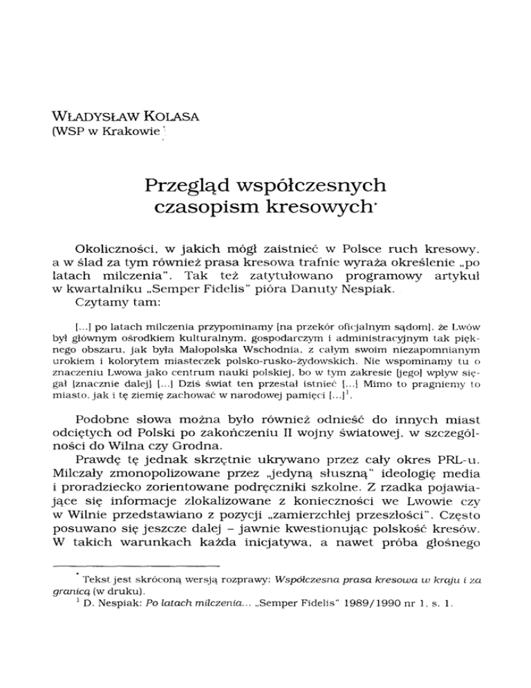 WŁADYSŁAW K O L A S A (WSP w Krakowie' Przegląd współczesnych czasopism kresowych* Okoliczności, w j a k i c h mógł zaistnieć w Polsce ruch kresowy, a w ślad za tym również prasa kresowa trafnie wyraża określenie „po latach milczenia". Tak też zatytułowano programowy artykuł w kwartalniku „Semper Fidelis" pióra Danuty Nespiak. Czytamy tam: [...] po latach milczenia przypominamy [na przekór oficjalnym sądoml, że Lwów był głównym ośrodkiem kulturalnym, gospodarczym i administracyjnym tak pięk nego obszaru, j a k była Małopolska Wschodnia, z całym swoim niezapomnianym urokiem i kolorytem miasteczek polsko-rusko-żydowskich. Nie wspominamy tu o znaczeniu Lwowa jako centrum nauki polskiej, bo w tym zakresie [jego] wpływ się gał [znacznie dalej] [...] Dziś świat ten przestał istnieć [...] Mimo to pragniemy to miasto, j a k i tę ziemię zachować w narodowej pamięci [...j . 1 Podobne słowa można było również odnieść do innych miast odciętych od Polski po zakończeniu II wojny światowej, w szczegól ności do Wilna czy Grodna. Prawdę tę jednak skrzętnie ukrywano przez cały okres PRL-u. Milczały zmonopolizowane przez „jedyną słuszną" ideologię media i proradziecko zorientowane podręczniki szkolne. Z rzadka pojawia jące się informacje zlokalizowane z konieczności we Lwowie czy w Wilnie przedstawiano z pozycji „zamierzchłej przeszłości". Często posuwano się jeszcze dalej - jawnie kwestionując polskość kresów. W takich w a r u n k a c h każda inicjatywa, a nawet próba głośnego Tekst jest skróconą wersją rozprawy: Współczesna prasa kresowa w kraju i za granicą (w druku). D. Nespiak: Po latach milczenia... „Semper Fidelis" 1989/1990 nr 1, s. 1. 1 mówienia o kresach musiała być skazana n a niepowodzenie. Trwały jednak pamiątki utrwalone w dokumentach i przedwojennych publikacjach, a nade wszystko pamięć żyjąca w licznych rzeszach ekspatriowanych po 1944 r., rozsianych w kraju i n a emigracji. Wśród tych ostatnich tradycja „ziomkowskich" spotkań datuje się już do samego początku eksodusu. Były to jednak inicjatywy skromne i poufne, nigdy nie osiągające większego rozmachu. S k u tecznie czuwał nad tym aparat państwowy. W znacznie lepszej sytuacji były środowiska emigracyjne. Dzia łały tam liczne organizacje, by wspomnieć tylko o londyńskim Związku Ziem Wschodnich czy Kole Lwowian, wydającym od 1961 r. interesujący biuletyn (obecnie „Lwów i Kresy"). W kraju stan milczenia trwał niewzruszenie, skutecznie utrwa lając w kolejnych pokoleniach fałszywe przekonania. Nikłe było również zainteresowanie kresami wśród profesjonalnych history ków. C i zajmowali się raczej bezpieczniejszymi obszarami badaw czymi, którymi były odległe epoki czy tereny środkowej Polski . Brak badań z kolei trwale ograniczał liczbę dostępnych publikacji i utwierdzał stan niebytu kresów w rodzimej historiografii. Zmianę sytuacji przyniosły dopiero przeobrażenia, które rozpo czął rok 1989, a które dojrzewały już od początku lat osiemdziesią tych. Nowe elity polityczne szybko zainicjowały pracę nad nowym, demokratycznym systemem prawnym i w iście błyskawicznym tem pie wdrożono go w życie. Zapanowała realna wolność zrzeszania się i wolność wypowiedzi. W myśl znowelizowanej ustawy Prawo Praso we (czerwiec 1989), „każdemu pełnoletniemu i nie karanemu oby watelowi Polski [dozwolono] założyć własną gazetę lub czasopismo". Zlikwidowano monopolistę związanego ze „starym porządkiem" RSW „Prasa-Książka-Ruch" (marzec 1990). W miesiąc później oficjalnie zniesiono cenzurę. W ślad za tym nastąpił bezprecedensowy rozkwit prasy i wszelkiego rodzaju inicjatyw wydawniczych, światło dzienne ujrzały skrywane dotychczas zjawiska i procesy. Rozpoczął się powolny proces transformacji i utrwalania owego ładu medialnego. W obrębie tych wydarzeń, jako jedne z wielu, znalazły się lawi nowo tworzone organizacje kresowe i niezależne ruchy kombatan ckie. Im przede wszystkim zawdzięczać należy żywą pamięć i walkę o prawdę historyczną, którą mocno zdeformowały peerelowskie 2 Jako przełom można uznać rok 1987, gdy podpisano w Moskwie „Deklarację o współpracy w dziedzinie ideologii, nauki i kultury", która zapowiadała m.in. likwidację „białych plam". Szerzej: Deportacje i przemieszczenia ludności polskiej JU głąb ZSRR. Pod red. T. Walichnowskiego. Warszawa 1989, s. 12. 2 massmedia i szkoły poprzez 45 lat konsekwentnej indoktrynacji. Zauważyć należy, że rok 1989 był dla reanimacji pamięci o kresach przysłowiowym „ostatnim dzwonkiem", gdyż nawet najmłodsze pokolenie pamiętające kresową „krainę lat dziecinnych", dawno osiągnęło wiek emerytalny i z wolna kurczyło się coraz bardziej. Z drugiej strony - j a k się wydaje - czas zupełnie wystarczający, by ocalić długo skrywane wspomnienia i dokumenty oraz wzbudzić społeczne zainteresowanie. Motywy, dla których sięgnięto po pióra, były dość zróżnicowane. Dla wielu jawiło się to jako szansa n a odratowanie własnej tożsamo ści, którą przecięło wypędzenie z „małej ojczyzny" i wieloletnia tułaczka. D l a innych realizacja duchowego testamentu ocalenia pamięci rodzin i przyjaciół. Często czysty patriotyzm. W innych przypadkach także chęć odwetu, żądza sławy, doraźne potrzeby polityczne czy ekonomiczne (walka o utracone majątki). Wreszcie względy altruistyczne, j a k pomoc tym, którzy zostali za wschodnią granicą czy prosta chęć działania wśród podobnych sobie. Odpowiednio do wyliczonych tu motywów istnieją różne organi zacje, wydające różne czasopisma i biuletyny, a w nich zawarte są różne teksty i dokumenty. Zatem lektura i ocena czasopism kreso wych wymaga odpowiedniego dystansu, ostrożności i krytycyzmu. Szczególnie zaś świadomości, że wspomnienia są nad wyraz skłonne do idealizacji i uproszczeń, a prawda h