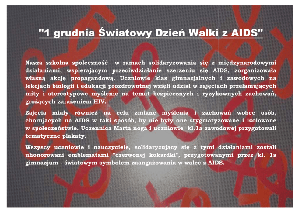 "1 grudnia Światowy Dzień Walki z AIDS" Nasza szkolna społeczność w ramach solidaryzowania się z międzynarodowymi działaniami, wspierającym przeciwdziałanie szerzeniu się AIDS, zorganizowała własną akcję propagandową. Uczniowie klas gimnazjalnych i zawodowych na lekcjach biologii i edukacji pro prozdrowotnej zdrowotnej wzięli udział w zajęciach przełamujących mity i stereotypowe myślenie na temat bezpiecznych i ryzykownych zachowań, groŜących zaraŜeniem HIV. Zajęcia miały równieŜ na celu zmianę myślenia i zachowań wobec osób, chorujących na AIDS w taki sposób, by nie były one stygmatyzowane i izolowane w społeczeństwie. Uczennica Marta noga i uczniowie kl.1a zawodowej przygotowali tematyczne plakaty. Wszyscy uczniowie i nauczyciele, solidaryzujący się z tymi działaniami zostali uhonorowani emblematami "czerwonej kokardki", ", przygotowanymi przez kl. 1a gimnazjum - światowym symbolem zaangaŜowania w walce z AIDS.