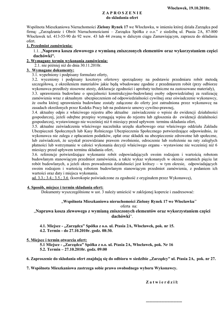 Włocławek, 19.10.2010r. ZAPROSZENIE do składania ofert Wspólnota Mieszkaniowa Nieruchomości Zielony Rynek 17 we Włocławku, w imieniu której działa Zarządca pod firmą: „Zarządzanie i Obrót Nieruchomościami – Zarządca Spółka z o.o.” z siedzibą ul. Ptasia 2A, 87-800 Włocławek tel. 413-55-90 do 92 wew. 43 lub 44 zwaną w dalszym ciągu Zamawiającym, zaprasza do składania ofert. 1. Przedmiot zamówienia: 1.1. „Naprawa kosza zlewowego z wymianą zniszczonych elementów oraz wykorzystaniem części dachówki”. 2. Wymagany termin wykonania zamówienia: 2.1. nie później niż do dnia 30.11.2010r. 3. Wymagane dokumenty: 3.1. wypełniony i podpisany formularz oferty, 3.2. wyceniony i podpisany kosztorys ofertowy sporządzony na podstawie przedmiaru robót metodą szczegółową, z określeniem materiałów jakie będą wbudowane zgodnie z przedmiarem robót (przy odbiorze wykonawca przedłoży stosowne atesty, deklaracje zgodności i aprobaty techniczne na zastosowane materiały), 3.3. uprawnienia budowlane o specjalności konstrukcyjno-budowlanej osoby odpowiedzialnej za realizację zamówienia wraz z aktualnym ubezpieczeniem od odpowiedzialności cywilnej oraz oświadczenie wykonawcy, że osoba której uprawnienia budowlane zostały załączone do oferty jest zatrudniona przez wykonawcę na zasadach określonych przez Kodeks Pracy lub na podstawie umowy cywilno-prawnej, 3.4. aktualny odpis z właściwego rejestru albo aktualne zaświadczenie o wpisie do ewidencji działalności gospodarczej, jeżeli odrębne przepisy wymagają wpisu do rejestru lub zgłoszenia do ewidencji działalności gospodarczej, wystawionego nie wcześniej niż 6 miesięcy przed upływem terminu składania ofert, 3.5. aktualne zaświadczenia właściwego naczelnika urzędu skarbowego oraz właściwego oddziału Zakładu Ubezpieczeń Społecznych lub Kasy Rolniczego Ubezpieczenia Społecznego potwierdzające odpowiednio, że wykonawca nie zalega z opłacaniem podatków, opłat oraz składek na ubezpieczenie zdrowotne lub społeczne, lub zaświadczeń, że uzyskał przewidziane prawem zwolnienie, odroczenie lub rozłożenie na raty zaległych płatności lub wstrzymanie w całości wykonania decyzji właściwego organu - wystawione nie wcześniej niż 6 miesięcy przed upływem terminu składania ofert, 3.6. referencje potwierdzające wykonanie robót odpowiadających swoim rodzajem i wartością robotom budowlanym stanowiącym przedmiot zamówienia, a także wykaz wykonanych w okresie ostatnich pięciu lat robót budowlanych, a jeżeli okres prowadzenia działalności jest krótszy – w tym okresie, odpowiadających swoim rodzajem i wartością robotom budowlanym stanowiącym przedmiot zamówienia, z podaniem ich wartości oraz daty i miejsca wykonania. ad. 3.3.; 3.4.; 3.5.; 3.6 (kserokopie poświadczone za zgodność z oryginałem przez Wykonawcę), 4. Sposób, miejsce i termin składania ofert: Dokumenty wyszczególnione w ust. 3 należy umieścić w zaklejonej kopercie i zaadresować: „Wspólnota Mieszkaniowa nieruchomości Zielony Rynek 17 we Włocławku” oferta na: „Naprawa kosza zlewowego z wymianą zniszczonych elementów oraz wykorzystaniem części dachówki”. 4.1. Miejsce - „Zarządca” Spółka z o.o. ul. Ptasia 2A, Włocławek, pok. nr 15. 4.2. Termin - do 27.10.2010r. godz. 08:30. 5. Miejsce i termin otwarcia ofert: 5.1 Miejsce - „Zarządca” Spółka z o.o. ul. Ptasia 2A, Włocławek, pok. Nr 16 5.2. Termin – 27.10.2010r. godz. 09:00 6. Zaproszenie do składania ofert znajdują się do odbioru w siedzibie „Zarządcy” ul. Ptasia 2A, pok. nr 27. 7. Wspólnota Mieszkaniowa zastrzega sobie prawo swobodnego wyboru Wykonawcy. Z a t w i e r d z i ł: ...................................