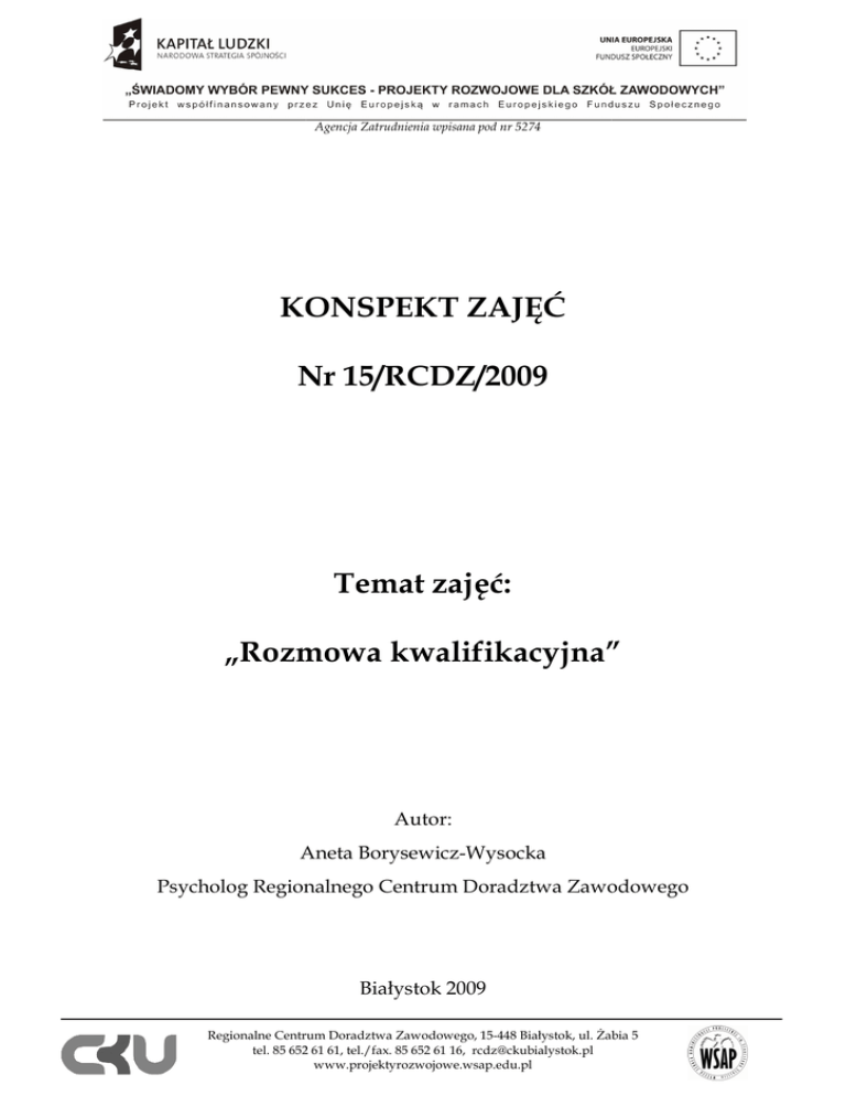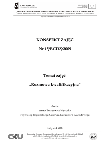 Agencja Zatrudnienia wpisana pod nr 5274 KONSPEKT ZAJĘĆ Nr 15/RCDZ/2009 15 Temat zajęć: „Rozmowa Rozmowa kwalifikacyjna” kwalifikacyjna” Autor: Aneta Borysewicz-Wysocka Borysewicz Psycholog Regionalnego Centrum Doradztwa Zawodowego Białystok 2009 Regionalne Centrum Doradztwa Zawodowego, 15-448 Białystok, ul. śabia 5 tel. 85 652 61 61, tel./fax. tel 85 652 61 16, [email protected] www.projektyrozwojowe.wsap.edu.pl Agencja Zatrudnienia wpisana pod nr 5274 Cele zajęć: 1. Zapoznanie ze specyfiką zachowań podczas rozmowy kwalifikacyjnej. 2. Zaznajomienie z przykładami odpowiedzi na pytania pracodawcy. 3. Zapoznanie z przykładami pytań do pracodawcy. 4. Kształcenie umiejętności rozmowy z pracodawcą. Korzyści (efekty zajęć): W wyniku zajęć uczestnicy: 1. Zapoznają się sytuacjami jakie mogą spotkać ich podczas rozmowy rekrutacyjnej. 2. Będą potrafili odpowiadać na pytania pracodawcy. 3. Uświadomią sobie jakie pytania mogą sami zadać podczas rozmowy rekrutacyjnej. 4. Poznają błędy jakich naleŜy unikać unikać w czasie rozmowy kwalifikacyjnej. Metody pracy: Zajęcia prowadzone będą metodami warsztatowymi, aktywizującymi wszystkich uczestników, z wykorzystaniem róŜnorodnych form i metod, takich jak: burza mózgów, symulacja, odgrywanie ról. Przede wszystkim zajęcia zajęcia składać się będą z zadań praktycznych oraz dyskusji nad problemem. KaŜdy z uczestników będzie miał szansę zaprezentować swoje zdanie na forum grupy. Sposób prowadzenia zajęć zakłada maksymalny i aktywny udział wszystkich uczestników, przy zminimalizowaniu zminimalizowaniu tradycyjnych sposobów przekazywania wiedzy. Wspomagająco zajęcia prowadzone będą z wykorzystaniem laptopa, projektora multimedialnego oraz filmów szkoleniowych. Materiały: Do przeprowadzenia zajęć wykorzystuje się laptop oraz projektor multimedialny, multimedialn filmy szkoleniowe, autorskie prezentacje oraz inne materiały sporządzone na podstawie podręczników dla doradców zawodowych i psychologów. W czasie trwania zajęć wykorzystane zostaną róŜnorodne pomoce, takie jak: flipchart, flamastry, testy i materiały do ćwiczeń. Czas trwania zajęć: 90 minut Regionalne Centrum Doradztwa Zawodowego, 15-448 Białystok, ul. śabia 5 tel. 85 652 61 61, tel./fax. tel 85 652 61 16, [email protected] www.projektyrozwojowe.wsap.edu.pl Agencja Zatrudnienia wpisana pod nr 5274 Zagadnienia: 1. Przebieg standardowego spotkania rekrutacyjnego. 2. Najczęściej zadawane pytania przez osobę rekrutującą i kandydata. 3. Próbne rozmowy kwalifikacyjne. 4. Przeanalizowanie błędów popełnianych podczas rozmów kwalifikacyjnych. Literatura: 1. Kulczycka L., Jak najlepiej zaprezentować się podczas podczas rozmowy kwalifikacyjnej?, kwalifikacyjnej? Wolters Kluwer Polska, Warszawa 2007 2. Yate M. J., Rozmowa kwalifikacyjna. Najlepsze odpowiedzi na trudne pytania, pytania Wydawnictwo Ravi, Łódź 2001 3. Malcolm Peel, Rozmowa ozmowa kwalifikacyjna. Gotowe pytania i wnioski z odpowiedzi, odpowiedzi Wydawnictwo ONE Press, 2004 4. Pocztowski A., Zarządzanie zasobami ludzkimi, Polskie Wydawnictwo ctwo Ekonomiczne, Warszawa 2003 5. Steinmann H.,, Schreyögg G., Zarządzanie: podstawy kierowania przedsiębiorstwem: koncepcje, funkcje, przykłady, przykłady, Oficyna Wydawnicza Politechniki Wrocławskiej, Wrocław 2001 6. M. Armsrtong, Zarządzanie Zasobami Ludzkimi, Ludzkimi Oficyna Wolters Kluwer business, Kraków 2007. Regionalne Centrum Doradztwa Zawodowego, 15-448 Białystok, ul. śabia 5 tel. 85 652 61 61, tel./fax. tel 85 652 61 16, [email protected] www.projektyrozwojowe.wsap.edu.pl