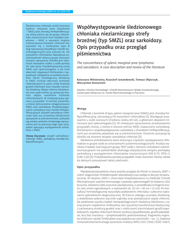 Współczesna Onkologia (2009) vol. 13; 5 (276–279) Śledzionowy chłoniak strefy brzeżnej (splenic marginal zone lymphoma – SMZL) jest chorobą limfoproliferacyjną, którą zalicza się do grupy chłoniaków nieziarniczych (non Hodgkin lymphoma – NHL) o wysokim stopniu zróżnicowania komórek. Chłoniak ten wywodzi się z limfocytów typu B (wg najnowszej klasyfikacji chorób hematologicznych) oraz stanowi ok. 1% wszystkich chłoniaków. Największa zachorowalność dotyczy grupy starszych chorych, opisywana choroba jest natomiast niezwykle rzadka u osób poniżej 30. roku życia. Charakterystyczną cechą SMZL jest splenomegalia, a we krwi obecność atypowych limfocytów z wypustkami cytoplazmy w kształcie kosmków. Obraz histologiczny śledziony w SMZL cechuje obecność komórek chłoniakowych w pasie strefy brzeżnej grudek chłonnych oraz miazdze czerwonej śledziony. Węzły chłonne śledzionowe oraz szpik kostny są zazwyczaj również objęte naciekiem komórek chłoniakowych. W niniejszej pracy opisano przypadek 53-letniej pacjentki, u której jednocześnie zdiagnozowano SMZL oraz sarkoidozę. Współwystępowanie sarkoidozy oraz chorób limfoproliferacyjnych (zespół sarkoidoza–chłoniak) było już wcześniej kilkakrotnie opisywane w piśmiennictwie, jednakże wg wiedzy autorów niniejszego opracowania jest to pierwszy tego typu przypadek opisujący występowanie sarkoidozy z SMZL. Słowa kluczowe: zespół sarkoidoza– chłoniak, SMZL, sarkoidoza, choroby limfoproliferacyjne. Współwystępowanie śledzionowego chłoniaka nieziarniczego strefy brzeżnej (typ SMZL) oraz sarkoidozy. Opis przypadku oraz przegląd piśmiennictwa The concomitance of splenic marginal zone lymphoma and sarcoidosis. A case description and review of the literature Katarzyna Wiśniewska, Krzysztof Lewandowski, Tomasz Olijarczyk, Mieczysław Komarnicki Katedra i Klinika Hematologii i Chorób Rozrostowych Układu Krwiotwórczego, Uniwersytet Medyczny im. Karola Marcinkowskiego w Poznaniu Wstęp Chłoniak z komórek B typu splenic marginal zone (SMZL) jest chorobą limfoproliferacyjną, stanowiącą 1% wszystkich chłoniaków [1]. Występuje przeważnie u osób starszych (mediana wieku 60 lat), a głównym objawem klinicznym jest splenomegalia [2]. W niniejszym opracowaniu przedstawiono przypadek chorej, u której w okresie remisji SMZL rozpoznano sarkoidozę. Doniesienia o współwystępowaniu sarkoidozy z chorobami limfoproliferacyjnymi już wcześniej pojawiały się w piśmiennictwie. Ostatnio asocjację tę określa się mianem zespołu sarkoidoza–chłoniak [3]. Niedawno przedstawiono dane dotyczące częstości występowania chłoniaków w grupie osób ze schorzeniami autoimmunologicznymi. Analiza wyników 6 badań oceniających grupę 7607 osób z różnymi chorobami autoimmunizacyjnymi nie potwierdziła istotnego statystycznie związku pomiędzy sarkoidozą a wystąpieniem chłoniaków nieziarniczych (OR 0,73, 95% CI 0,40–1,32) [4]. Przedstawiony poniżej przypadek może stanowić istotny wkład do dalszych poszukiwań takiej zależności. Opis przypadku Pięćdziesięciotrzyletnia chora została przyjęta do Kliniki w sierpniu 2007 r. celem diagnostyki limfadenopatii obwodowej oraz podjęcia decyzji terapeutycznej. W sierpniu 2003 r. chora była hospitalizowana na Oddziale Chorób Wewnętrznych szpitala terenowego z powodu splenomegalii (w badaniu USG brzucha: śledziona była znacznie powiększona, o prawidłowej echogeniczności, bez zmian ogniskowych, o wymiarach ok. 22 cm × 16 cm × 11 cm). Po konsultacji hematologicznej wysunięto podejrzenie chłoniaka i zalecono wykonanie splenektomii diagnostycznej. W trakcie zabiegu usunięto śledzionę, a dodatkowo pobrano wycinek wątroby oraz powiększone węzły chłonne. Na podstawie wyniku badań histopatologicznych śledziony (śledziona z zaznaczonym rozplemem limfocytów, bez wyraźnej transformacji blastycznej, z zachowaną strukturą grudek oraz z nielicznymi ziarniniakami gruźliczopodobnymi), węzłów chłonnych (liczne struktury gruzełkowate, gruźliczopodobne, lecz bez martwicy – lymphonodulitis granulomatosa), fragmentu wątroby (nieliczne nacieki limfocytów oraz pojedyncze ziarniniaki – ryc. 1.), badania immunohistochemicznego (oceniane markery MPO, CD3, CD10, CD20 i Ki67), Współczesna Onkologia (2009) vol. 13; 5 (276–279) Splenic marginal zone lymphoma (SMZL) is an indolent lymphoproliferative disease, considered as a subtype of B-cell nonHodgkin’s lymphoma (NHL) in the recent classification of haematological diseases, accounting for approximately 1% of all lymphomas. SMZL typically affects older patients and is extremely rare in patients younger than 30 years. The characteristic feature of SMZL is splenomegaly, often accompanied by circulating atypical “villous lymphocytes”. Histologically, the spleen in SMZL is characterised by a nodular infiltrate based on pre-existing white pulp but also involving the red pulp. Usually the splenic lymph nodes and bone marrow are also involved by a vaguely nodular infiltrate of similar nature. This case report concerns a 53-year-old patient suffering from SMZL, who was diagnosed with sarcoidosis simultaneously. An association between sarcoidosis and lymphoproliferative diseases, the sarcoidosislymphoma syndrome, has been previously described, but to our knowledge this is the first publication concerning coexistence of sarcoidosis with SMZL. Key words: sarcoidosis-lymphoma syndrome, SMZL, sarcoidosis, lymphoproliferative diseases. a także analizy wyników całości obrazu klinicznego ustalono rozpoznanie chłoniaka śledzionowego strefy brzeżnej z komórek B (splenic marginal zone lymphoma). Na tym etapie diagnostyki zasugerowano także możliwość współwystępowania sarkoidozy. Na podstawie powyższych danych podjęto decyzję o leczeniu kladrybiną w dawce 5 mg/m2 dożylnie w 3-godzinnym wlewie przez 7 dni w miesiącu. Terapię przeprowadzono od marca 200