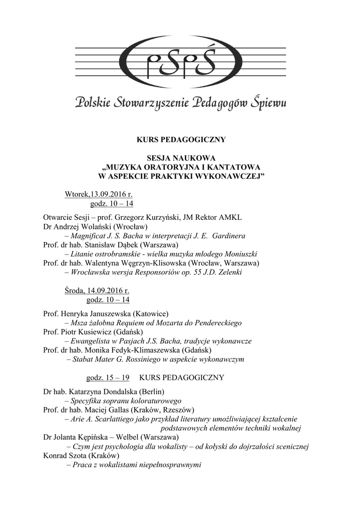 KURS PEDAGOGICZNY SESJA NAUKOWA „MUZYKA ORATORYJNA I KANTATOWA W ASPEKCIE PRAKTYKI WYKONAWCZEJ” Wtorek,13.09.2016 r. godz. 10 – 14 Otwarcie Sesji – prof. Grzegorz Kurzyński, JM Rektor AMKL Dr Andrzej Wolański (Wrocław) – Magnificat J. S. Bacha w interpretacji J. E. Gardinera Prof. dr hab. Stanisław Dąbek (Warszawa) – Litanie ostrobramskie - wielka muzyka młodego Moniuszki Prof. dr hab. Walentyna Węgrzyn-Klisowska (Wrocław, Warszawa) – Wrocławska wersja Responsoriów op. 55 J.D. Zelenki Środa, 14.09.2016 r. godz. 10 – 14 Prof. Henryka Januszewska (Katowice) – Msza żałobna Requiem od Mozarta do Pendereckiego Prof. Piotr Kusiewicz (Gdańsk) – Ewangelista w Pasjach J.S. Bacha, tradycje wykonawcze Prof. dr hab. Monika Fedyk-Klimaszewska (Gdańsk) – Stabat Mater G. Rossiniego w aspekcie wykonawczym godz. 15 – 19 KURS PEDAGOGICZNY Dr hab. Katarzyna Dondalska (Berlin) – Specyfika sopranu koloraturowego Prof. dr hab. Maciej Gallas (Kraków, Rzeszów) – Arie A. Scarlattiego jako przykład literatury umożliwiającej kształcenie podstawowych elementów techniki wokalnej Dr Jolanta Kępińska – Welbel (Warszawa) – Czym jest psychologia dla wokalisty – od kołyski do dojrzałości scenicznej Konrad Szota (Kraków) – Praca z wokalistami niepełnosprawnymi KURS PEDAGOGICZNY SYMPOZJUM NAUKOWE „PROBLEMY PEDAGOGIKI WOKALNEJ” Czwartek, 15.09.2016 r. godz. 10 – 14 Otwarcie Sympozjum – prof. dr hab. Piotr Łykowski, prezes PSPŚ Dr Jolanta Kępińska-Welbel (Warszawa) – Relacja: uczeń – mistrz w ujęciu psychologicznym Prof. dr hab. Bogdan Makal (Wrocław) – Rola konkursów w rozwoju wokalisty Prof. Jan Ballarin (Katowice) – Zaczynam naukę śpiewu klasycznego, wskazówki metodyczne Piątek, 16.09.2016 r. godz. 10 – 13 Dr Roma Owsińska (Kielce) – Lekcja pokazowa śpiewu solowego Prof. Barbara Ewa Werner (Wrocław) – Pieśni w twórczości Artura Malawskiego Adam Czopek (Warszawa) – Wielcy polscy wokaliści w świecie godz. 13.30 Otwarte zebranie Zarządu PSPŚ Sobota, 17.09.2016 r. godz. 10 – 13 Dr hab. Kacper Miklaszewski (Warszawa) – Zdolności, uzdolnienia i talent muzyczny Dr hab. Olga Ksenicz (Wrocław) – Historyczne i współczesne wykonawstwo muzyki dawnej Prof. Eugeniusz Sąsiadek (Wrocław) – Z doświadczeń pedagogicznych: problem intonacji w śpiewie Zakończenie Kursu i Konferencji