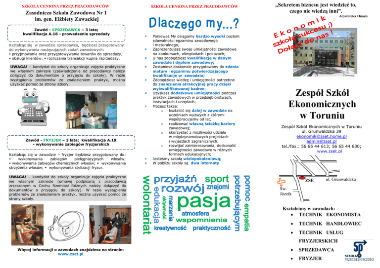SZKOŁA CENIONA PRZEZ PRACODAWCÓW SZKOŁA CENIONA PRZEZ PRACODAWCÓW Zasadnicza Szkoła Zawodowa Nr 1 im. gen. Elżbiety Zawackiej Zawód - SPRZEDAWCA – 3 lata; kwalifikacja A.18 - prowadzenie sprzedaży Kształcąc się w zawodzie sprzedawca, będziesz przygotowany do wykonywania następujących zadań zawodowych: przyjmowania oraz przygotowywania towarów do sprzedaży; obsługi klientów; rozliczania transakcji kupna /sprzedaży. UWAGA! – kandydat do szkoły organizuje zajęcia praktyczne we własnym zakresie (zaświadczenie od pracodawcy należy dołączyć do dokumentów o przyjęciu do szkoły). W razie wystąpienia problemów ze znalezieniem praktyk, można uzyskać pomoc ze strony szkoły. Arystoteles Onasis Zawód - FRYZJER – 3 lata; kwalifikacja A.19 - wykonywanie zabiegów fryzjerskich Kształcąc się w zawodzie – fryzjer będziesz przygotowany do: wykonywania zabiegów pielęgnacyjnych włosów; wykonywania zabiegów chemicznych włosów; wykonywania strzyżenia włosów; wykonywania stylizacji fryzur. UWAGA! – kandydat do szkoły organizuje zajęcia praktyczne we własnym zakresie (umowę podpisaną z pracodawcą zrzeszonym w Cechu Rzemiosł Różnych należy dołączyć do dokumentów o przyjęciu do szkoły). W razie wystąpienia problemów ze znalezieniem praktyk, można uzyskać pomoc ze strony szkoły. „Sekretem biznesu jest wiedzieć to, czego nie wiedzą inni”. Ponieważ My osiągamy bardzo wysoki poziom zdawalności egzaminu zawodowego i maturalnego; Zaprezentujesz swoje umiejętności zawodowe na konkursach, olimpiadach i pokazach; U nas zdobędziesz kwalifikacje w danym zawodzie i dyplom zawodowy; Zostaniesz doskonale przygotowany do zdania matury i egzaminu potwierdzającego kwalifikacje w zawodzie; Zdobędziesz wiedzę i umiejętności potrzebne do znalezienia atrakcyjnej pracy dzięki wykwalifikowanej kadrze; Uzyskasz dodatkowe umiejętności podczas praktyk zawodowych w przedsiębiorstwach, instytucjach i urzędach; Możesz także: o kształcić się dalej w zawodzie na uczelniach wyższych z którymi współpracujemy od lat; o realizować własną ścieżkę kariery zawodowej; o skorzystać z możliwości udziału w międzynarodowych projektach i wyjazdach zagranicznych; o rozwijać zainteresowania, doskonalić umiejętności zawodowe w różnych formach edukacyjnych; Jesteśmy szkołą wielopokoleniową; W pobliżu szkoły są dwa internaty. Zespół Szkół Ekonomicznych w Toruniu Zespół Szkół Ekonomicznych w Toruniu ul. Grunwaldzka 39 [email protected] [email protected] tel./fax.: 56 65 44 613; 56 65 44 630; www.zset.pl ZSE ul. Grunwaldzka Św. Józefa Kształcimy w zawodach: TECHNIK EKONOMISTA TECHNIK HANDLOWIEC TECHNIK USŁUG FRYZJERSKICH Więcej informacji o zawodach znajdziesz na stronie: www.zset.pl SPRZEDAWCA FRYZJER SZKOŁA CENIONA PRZEZ PRACODAWCÓW SZKOŁA CENIONA PRZEZ PRACODAWCÓW Technikum Nr 1 im. gen. Elżbiety Zawackiej Zawód – TECHNIK EKONOMISTA– 4 lata kwalifikacje: planowanie i prowadzenie działalności w organizacji (A.35), prowadzenie rachunkowości (A.36) Jeśli chcesz dowiedzieć się znacznie więcej o „Ekonomiku” to przyjdź na „Drzwi otwarte” - 21 marca 2016r. (1120-1400) Uzyskując zawód – technik ekonomista, będziesz specjalistą od analizowania podstawowych zjawisk ekonomicznych oraz procesów społeczno – gospodarczych z zakresu administracji, prawa i finansów. Możesz pracować jako: doradca klienta, asystent dyrektora, księgowy, agent ubezpieczeniowy, agent celny, regionalny kierownik sprzedaży, specjalista ds. kadr i płac, planowania i analiz lub prowadzić własną firmę. Możesz pracować w: - 23 kwietnia 2016r. (1000-1300) Program „Drzwi otwartych” przewiduje wiele atrakcji: prezentację multimedialną naszej szkoły, projekcję filmu nakręconego przez uczniów, spotkanie z młodzieżą, zwiedzanie szkoły, gry ekonomiczne, krzyżówkę ekonomiczną, pokaz umiejętności uczniów klas fryzjerskich, możliwość wykonania efektownej i modnej fryzury, pokazy aerobic i wiele, wiele innych. SZKOŁA CENIONA PRZEZ PRACODAWCÓW Zawód – TECHNIK USŁUG FRYZJERSKICH – 4 lata; kwalifikacje: wykonywanie zabiegów fryzjerskich (A.19), projektowanie fryzur (A.23) Uzyskując zawód – technik usług fryzjerskich, będziesz przygotowany do: wykonywania typowych usług fryzjerskich, prowadzenia salonu fryzjerskiego oraz posiadał wiedzę i umiejętności w zakresie rynku i marketingu usług. Możesz pracować jako: fryzjer, stylista - wizażysta, zarządzać salonem lub kompleksem fryzjersko – kosmetycznym. UWAGA! NOWOŚĆ ! Dla uczniów technikum – możliwość zdobycia dodatkowego zawodu – instruktor rekreacji ruchowej o specjalności fitness – nowoczesne formy gimnastyki DOKUMENTY NALEŻY ZŁOŻYĆ WEDŁUG ZASAD I TERMINÓW OBOWIĄZUJĄCYCH W ELEKTRONICZNYM NABORZE harmonogram rekrutacji: www.zset.pl/rekrutacja Zawód – TECHNIK HANDLOWIEC– 4 lata kwalifikacje: prowadzenie sprzedaży(A.18), prowadzenie działalności handlowej (A.22) Uzyskując zawód technik handlowiec, będziesz specjalistą w zakresie: organizacji działalności handlowej, w przedsiębiorstwach produkcyjno – usługowych i funkcjonowania firm handlowych. Możesz pracować jako: menadżer sprzedaży, specjalista ds. zaopatrzenia, specjalista ds. marketingu, przedstawiciel handlowy, kierownik działu handlowego oraz prowadzić własny sklep lub hurtownię. PRZEDMIOTY PUNKTOWANE PRZY NABORZE DO SZKOŁY PONADGIMNAZJALNEJ: a) do technikum - w zawodzie technik ekonomista, technik handlowiec: j. polski, matematyka, geografia, język obcy nowożytny; - w zawodzie technik usług fryzjerskich: j. polski, matematyka, plastyka, język obcy nowożytny; b) do szkoły zasadniczej - w zawodzie sprzedawca: j. polski, matematyka, geografia, język obcy nowożytny; - w zawodzie fryzjer: j. polski, matematyka, plastyka, język obcy nowożytny. JAKIE PRZEDMIOTY DO WYBORU NA POZIOMIE ROZSZERZONYM? technik ekonomista, tech
