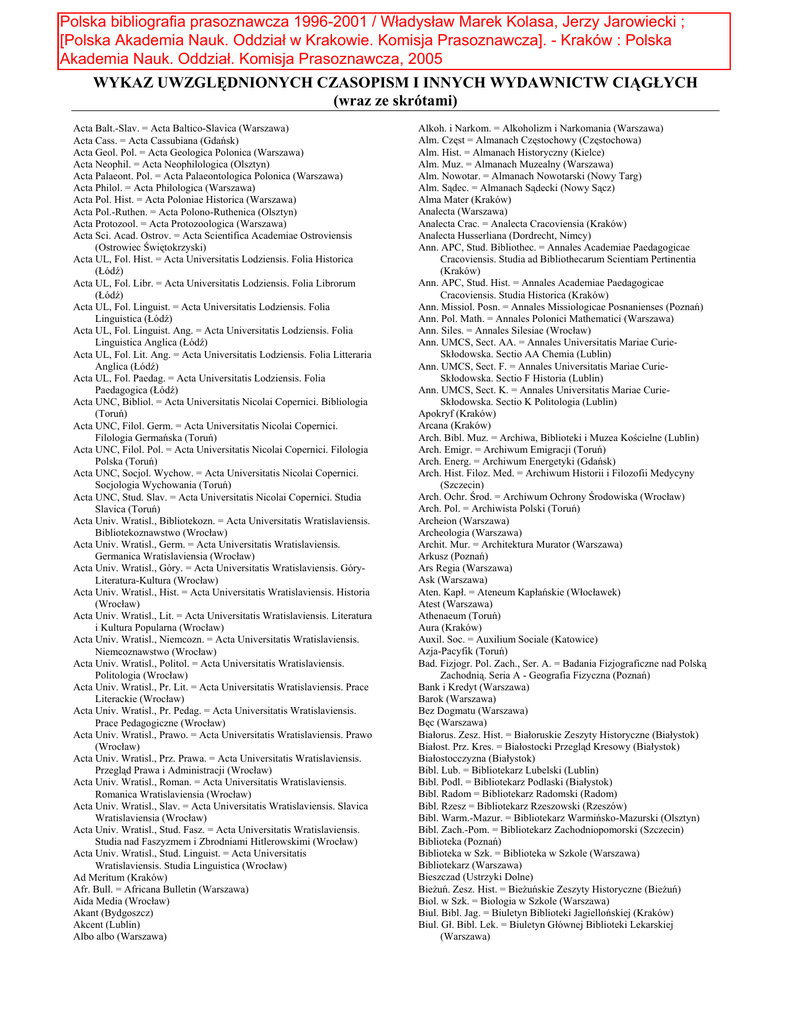 Polska bibliografia prasoznawcza 1996-2001 / Władysław Marek Kolasa, Jerzy Jarowiecki ; [Polska Akademia Nauk. Oddział w Krakowie. Komisja Prasoznawcza]. - Kraków : Polska 2 2005 Akademia Nauk. Oddział. Komisja Prasoznawcza, WYKAZ UWZGLĘDNIONYCH CZASOPISM I INNYCH WYDAWNICTW CIĄGŁYCH (wraz ze skrótami) Acta Balt.-Slav. = Acta Baltico-Slavica (Warszawa) Acta Cass. = Acta Cassubiana (Gdańsk) Acta Geol. Pol. = Acta Geologica Polonica (Warszawa) Acta Neophil. = Acta Neophilologica (Olsztyn) Acta Palaeont. Pol. = Acta Palaeontologica Polonica (Warszawa) Acta Philol. = Acta Philologica (Warszawa) Acta Pol. Hist. = Acta Poloniae Historica (Warszawa) Acta Pol.-Ruthen. = Acta Polono-Ruthenica (Olsztyn) Acta Protozool. = Acta Protozoologica (Warszawa) Acta Sci. Acad. Ostrov. = Acta Scientifica Academiae Ostroviensis (Ostrowiec Świętokrzyski) Acta UL, Fol. Hist. = Acta Universitatis Lodziensis. Folia Historica (Łódź) Acta UL, Fol. Libr. = Acta Universitatis Lodziensis. Folia Librorum (Łódź) Acta UL, Fol. Linguist. = Acta Universitatis Lodziensis. Folia Linguistica (Łódź) Acta UL, Fol. Linguist. Ang. = Acta Universitatis Lodziensis. Folia Linguistica Anglica (Łódź) Acta UL, Fol. Lit. Ang. = Acta Universitatis Lodziensis. Folia Litteraria Anglica (Łódź) Acta UL, Fol. Paedag. = Acta Universitatis Lodziensis. Folia Paedagogica (Łódź) Acta UNC, Bibliol. = Acta Universitatis Nicolai Copernici. Bibliologia (Toruń) Acta UNC, Filol. Germ. = Acta Universitatis Nicolai Copernici. Filologia Germańska (Toruń) Acta UNC, Filol. Pol. = Acta Universitatis Nicolai Copernici. Filologia Polska (Toruń) Acta UNC, Socjol. Wychow. = Acta Universitatis Nicolai Copernici. Socjologia Wychowania (Toruń) Acta UNC, Stud. Slav. = Acta Universitatis Nicolai Copernici. Studia Slavica (Toruń) Acta Univ. Wratisl., Bibliotekozn. = Acta Universitatis Wratislaviensis. Bibliotekoznawstwo (Wrocław) Acta Univ. Wratisl., Germ. = Acta Universitatis Wratislaviensis. Germanica Wratislaviensia (Wrocław) Acta Univ. Wratisl., Góry. = Acta Universitatis Wratislaviensis. GóryLiteratura-Kultura (Wrocław) Acta Univ. Wratisl., Hist. = Acta Universitatis Wratislaviensis. Historia (Wrocław) Acta Univ. Wratisl., Lit. = Acta Universitatis Wratislaviensis. Literatura i Kultura Popularna (Wrocław) Acta Univ. Wratisl., Niemcozn. = Acta Universitatis Wratislaviensis. Niemcoznawstwo (Wrocław) Acta Univ. Wratisl., Politol. = Acta Universitatis Wratislaviensis. Politologia (Wrocław) Acta Univ. Wratisl., Pr. Lit. = Acta Universitatis Wratislaviensis. Prace Literackie (Wrocław) Acta Univ. Wratisl., Pr. Pedag. = Acta Universitatis Wratislaviensis. Prace Pedagogiczne (Wrocław) Acta Univ. Wratisl., Prawo. = Acta Universitatis Wratislaviensis. Prawo (Wrocław) Acta Univ. Wratisl., Prz. Prawa. = Acta Universitatis Wratislaviensis. Przegląd Prawa i Administracji (Wrocław) Acta Univ. Wratisl., Roman. = Acta Universitatis Wratislaviensis. Romanica Wratislaviensia (Wrocław) Acta Univ. Wratisl., Slav. = Acta Universitatis Wratislaviensis. Slavica Wratislaviensia (Wrocław) Acta Univ. Wratisl., Stud. Fasz. = Acta Universitatis Wratislaviensis. Studia nad Faszyzmem i Zbrodniami Hitlerowskimi (Wrocław) Acta Univ. Wratisl., Stud. Linguist. = Acta Universitatis Wratislaviensis. Studia Linguistica (Wrocław) Ad Meritum (Kraków) Afr. Bull. = Africana Bulletin (Warszawa) Aida Media (Wrocław) Akant (Bydgoszcz) Akcent (Lublin) Albo albo (Warszawa) Alkoh. i Narkom. = Alkoholizm i Narkomania (Warszawa) Alm. Częst = Almanach Częstochowy (Częstochowa) Alm. Hist. = Almanach Historyczny (Kielce) Alm. Muz. = Almanach Muzealny (Warszawa) Alm. Nowotar. = Almanach Nowotarski (Nowy Targ) Alm. Sądec. = Almanach Sądecki (Nowy Sącz) Alma Mater (Kraków) Analecta (Warszawa) Analecta Crac. = Analecta Cracoviensia (Kraków) Analecta Husserliana (Dordrecht, Nimcy) Ann. APC, Stud. Bibliothec. = Annales Academiae Paedagogicae Cracoviensis. Studia ad Bibliothecarum Scientiam Pertinentia (Kraków) Ann. APC, Stud. Hist. = Annales Academiae Paedagogicae Cracoviensis. Studia Historica (Kraków) Ann. Missiol. Posn. = Annales Missiologicae Posnanienses (Poznań) Ann. Pol. Math. = Annales Polonici Mathematici (Warszawa) Ann. Siles. = Annales Silesiae (Wrocław) Ann. UMCS, Sect. AA. = Annales Universitatis Mariae CurieSkłodowska. Sectio AA Chemia (Lublin) Ann. UMCS, Sect. F. = Annales Universitatis Mariae CurieSkłodowska. Sectio F Historia (Lublin) Ann. UMCS, Sect. K. = Annales Universitatis Mariae CurieSkłodowska. Sectio K Politologia (Lublin) Apokryf (Kraków) Arcana (Kraków) Arch. Bibl. Muz. = Archiwa, Biblioteki i Muzea Kościelne (Lublin) Arch. Emigr. = Archiwum Emigracji (Toruń) Arch. Energ. = Archiwum Energetyki (Gdańsk) Arch. Hist. Filoz. Med. = Archiwum Historii i Filozofii Medycyny (Szczecin) Arch. Ochr. Środ. = Archiwum Ochrony Środowiska (Wrocław) Arch. Pol. = Archiwista Polski (Toruń) Archeion (Warszawa) Archeologia (Warszawa) Archit. Mur. = Architektura Murator (Warszawa) Arkusz (Poznań) Ars Regia (Warszawa) Ask (Warszawa) Aten. Kapł. = Ateneum Kapłańskie (Włocławek) Atest (Warszawa) Athenaeum (Toruń) Aura (Kraków) Auxil. Soc. = Auxilium Sociale (Katowice) Azja-Pacyfik (Toruń) Bad. Fizjogr. Pol. Zach., Ser. A. = Badania Fizjograficzne nad Polską Zachodnią. Seria A - Geografia Fizyczna (Poznań) Bank i Kredyt (Warszawa) Barok (Warszawa) Bez Dogmatu (Warszawa) Bęc (Warszawa) Białorus. Zesz. Hist. = Białoruskie Zeszyty Historyczne (Białystok) Białost. Prz. Kres. = Białostocki Przegląd Kresowy (Białystok) Białostocczyzna (Białystok) Bibl. Lub. = Bibliotekarz Lubelski (Lublin) Bibl. Podl. = Bibliotekarz Podlaski (Białystok) Bibl. Radom = Bibliotekarz Radomski (Radom) Bibl. Rzesz = Bibliotekarz Rzeszowski (Rzeszów) Bibl. Warm.-Mazur. = Bibliotekarz Warmińsko-Mazurski (Olsztyn) Bibl. Zach.-Pom. = Bibliotekarz Zachodniopomorski (Szczecin) Biblioteka (Poznań) Biblioteka w Szk. = Biblioteka w Szkole (Warszawa) Bibl