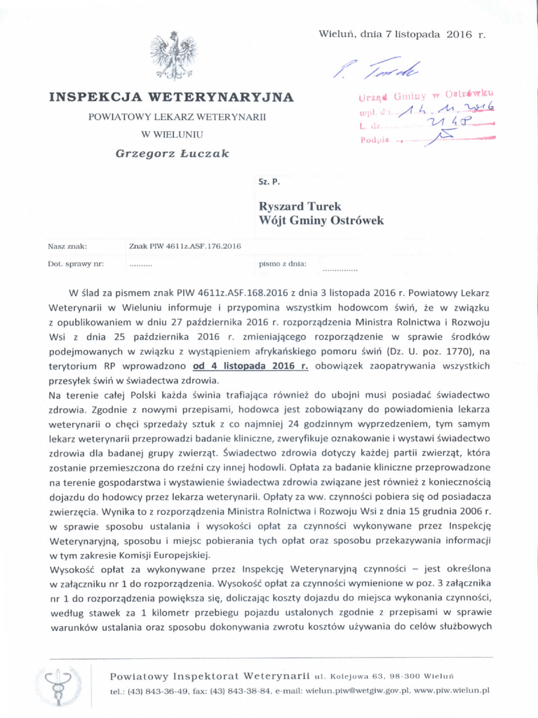 Wieluri, dnia 7 lislopada 2016 r. INSPEKCJA WETERYNARYJNA POWIATOWY LEKARZ WETERYNARII W WIELUNIU Grzegorz Luczak Sz.P. Ryszard Turek Wojt Gminy Ostrowek Nasz znak: Dot. sprawy nr: Ziiak P1W4611/..ASF.176.201G pismo z clnia: W slad za pismem znak PIW 4611z.ASF.168.2016 z dnia 3 listopada 2016 r. Powiatowy Lekarz Weterynarii w Wieluniu informuje i przypomina wszystkim hodowcom swiri, ze w zwiqzku z opublikowaniem w dniu 27 pazdziernika 2016 r. rozporzqdzenia Ministra Rolnictwa i Rozwoju Wsi z dnia 25 pazdziernika 2016 r. zmieniajqcego rozporzqdzenie w sprawie srodkow podejmowanych w zwiqzku z wystqpieniem afrykariskiego pomoru swiri (Dz. U. poz. 1770), na terytorium RP wprowadzono od 4 listopada 2016 r. obowia_zek zaopatrywania wszystkich przesytek swiri w swiadectwa zdrowia. Na terenie catej Polski kazda swinia trafiaja_ca rowniez do ubojni musi posiadac swiadectwo zdrowia. Zgodnie z nowymi przepisami, hodowca jest zobowia.zany do powiadomienia lekarza weterynarii o ch^ci sprzedazy sztuk z co najmniej 24 godzinnym wyprzedzeniem, tym samym lekarz weterynarii przeprowadzi badanie kliniczne, zweryfikuje oznakowanie i wystawi swiadectwo zdrowia dla badanej grupy zwierzqt. Swiadectwo zdrowia dotyczy kazdej partii zwierzqt, ktora zostanie przemieszczona do rzezni czy innej hodowli. Optata za badanie kliniczne przeprowadzone na terenie gospodarstwa i wystawienie swiadectwa zdrowia zwiqzane jest rowniez z koniecznoscia. dojazdu do hodowcy przez lekarza weterynarii. Optaty za ww. czynnosci pobiera si^ od posiadacza zwierz^cia. Wynika to z rozporzqdzenia Ministra Rolnictwa i Rozwoju Wsi z dnia 15 grudnia 2006 r. w sprawie sposobu ustalania i wysokosci optat za czynnosci wykonywane przez Inspekcje. Weterynaryjna^ sposobu i miejsc pobierania tych optat oraz sposobu przekazywanta informacji wtym zakresie Komisji Europejskiej. Wysokosc optat za wykonywane przez Inspekcje, Weterynaryjna. czynnosci -- jest okreslona w zatqczniku nr 1 do rozporzqdzenia. Wysokosc optat za czynnosci wymienione w poz. 3 zatqcznika nr 1 do rozporza_dzenia powi^ksza sie., doliczaja.c koszty dojazdu do miejsca wykonania czynnosci, wedtug stawek za 1 kilometr przebiegu pojazdu ustalonych zgodnie z przepisami w sprawie warunkow ustalania oraz sposobu dokonywania zwrotu kosztow uzywania do celow stuzbowych Powiatowy Inspektorat Weterynarii ui. Koiejowa 63. 98 300 wieiun tel.: (43) 843-36-49. fax.: (43) 843-38-84, e-mail: [email protected], www.piw.wlolun.pl samochodow osobowych, motocykli i motorowerow niebe_dqcych wtasnoscig pracodawcy, zwanych dalej ,,kosztami dojazdu"; Zata_cznik 1 poz. 3 brzmi - przeprowadzenie kontroli zwierza_t, w miejscu ich pochodzenia, umieszczanych na rynku krajowym wraz z wystawieniem wymaganych swiadectw zdrowia, o ktorych mowa w przepisach o ochronie zdrowia zwierza_t oraz zwalczaniu chorob zakaznych zwierz^t: swini a) do 10 sztuk zwierzqt 10,00 b) od 11 do 20 sztuk zwierza_t - za kazde nast^pne zwierze, 1,00 c) od 21 do 50 sztuk zwierzqt - za kazde naste_pne zwierze, 0,75 d) powyzej 50 sztuk zwierza.t - za kazde nast^pne zwierzQ 0,50 + koszty dojazdu {stawka za 1 km = 0,8358 zt) W celu uzyskania swiadectwa zdrowia przez hodowcow na terenie gminy Ostrowek nalezy zgtosic si$ do urze_dowego lekarza weterynarii lek. wet. Piotr Paciorkiewicz, tel. 605 584 810 Uprzejmie prosze, o umieszczenie powyzszych informacji na tablicach ogtoszeri oraz powiadomic hodowcow swiri drogq zwyczajowo przyjtjtq na terenie Paristwa Gminy. POWIATOWY LEKARZ WETERYNARH W WIELWNIU tek. wet, GrzeitirzLuczak Powiatowy Inspektorat Weterynarii ui. Koiejowa 63. 98-300 wieiun tel.: (43) 843-36-49, fax: (43) 843-38-84, e-mail: [email protected], www.piw.wielun.pl -2-