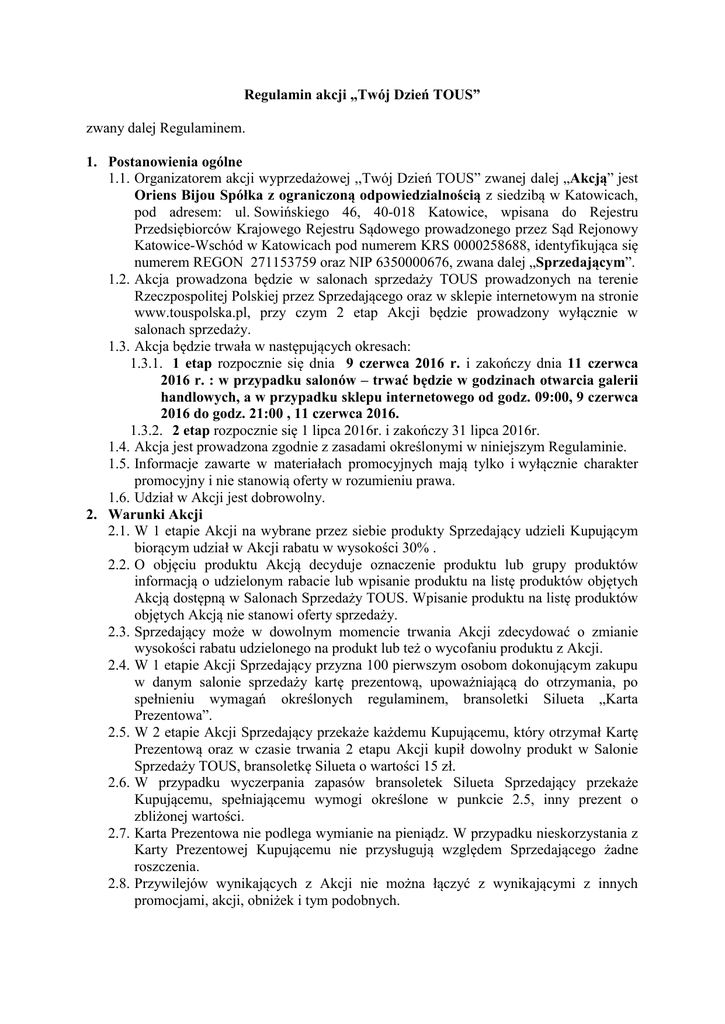 Regulamin akcji „Twój Dzień TOUS” zwany dalej Regulaminem. 1. Postanowienia ogólne 1.1. Organizatorem akcji wyprzedażowej ,,Twój Dzień TOUS” zwanej dalej „Akcją” jest Oriens Bijou Spółka z ograniczoną odpowiedzialnością z siedzibą w Katowicach, pod adresem: ul. Sowińskiego 46, 40-018 Katowice, wpisana do Rejestru Przedsiębiorców Krajowego Rejestru Sądowego prowadzonego przez Sąd Rejonowy Katowice-Wschód w Katowicach pod numerem KRS 0000258688, identyfikująca się numerem REGON 271153759 oraz NIP 6350000676, zwana dalej „Sprzedającym”. 1.2. Akcja prowadzona będzie w salonach sprzedaży TOUS prowadzonych na terenie Rzeczpospolitej Polskiej przez Sprzedającego oraz w sklepie internetowym na stronie www.touspolska.pl, przy czym 2 etap Akcji będzie prowadzony wyłącznie w salonach sprzedaży. 1.3. Akcja będzie trwała w następujących okresach: 1.3.1. 1 etap rozpocznie się dnia 9 czerwca 2016 r. i zakończy dnia 11 czerwca 2016 r. : w przypadku salonów – trwać będzie w godzinach otwarcia galerii handlowych, a w przypadku sklepu internetowego od godz. 09:00, 9 czerwca 2016 do godz. 21:00 , 11 czerwca 2016. 1.3.2. 2 etap rozpocznie się 1 lipca 2016r. i zakończy 31 lipca 2016r. 1.4. Akcja jest prowadzona zgodnie z zasadami określonymi w niniejszym Regulaminie. 1.5. Informacje zawarte w materiałach promocyjnych mają tylko i wyłącznie charakter promocyjny i nie stanowią oferty w rozumieniu prawa. 1.6. Udział w Akcji jest dobrowolny. 2. Warunki Akcji 2.1. W 1 etapie Akcji na wybrane przez siebie produkty Sprzedający udzieli Kupującym biorącym udział w Akcji rabatu w wysokości 30% . 2.2. O objęciu produktu Akcją decyduje oznaczenie produktu lub grupy produktów informacją o udzielonym rabacie lub wpisanie produktu na listę produktów objętych Akcją dostępną w Salonach Sprzedaży TOUS. Wpisanie produktu na listę produktów objętych Akcją nie stanowi oferty sprzedaży. 2.3. Sprzedający może w dowolnym momencie trwania Akcji zdecydować o zmianie wysokości rabatu udzielonego na produkt lub też o wycofaniu produktu z Akcji. 2.4. W 1 etapie Akcji Sprzedający przyzna 100 pierwszym osobom dokonującym zakupu w danym salonie sprzedaży kartę prezentową, upoważniającą do otrzymania, po spełnieniu wymagań określonych regulaminem, bransoletki Silueta „Karta Prezentowa”. 2.5. W 2 etapie Akcji Sprzedający przekaże każdemu Kupującemu, który otrzymał Kartę Prezentową oraz w czasie trwania 2 etapu Akcji kupił dowolny produkt w Salonie Sprzedaży TOUS, bransoletkę Silueta o wartości 15 zł. 2.6. W przypadku wyczerpania zapasów bransoletek Silueta Sprzedający przekaże Kupującemu, spełniającemu wymogi określone w punkcie 2.5, inny prezent o zbliżonej wartości. 2.7. Karta Prezentowa nie podlega wymianie na pieniądz. W przypadku nieskorzystania z Karty Prezentowej Kupującemu nie przysługują względem Sprzedającego żadne roszczenia. 2.8. Przywilejów wynikających z Akcji nie można łączyć z wynikającymi z innych promocjami, akcji, obniżek i tym podobnych. 3. Wymiana towaru nabytego w ramach Akcji 3.1. Do nabycia produktu po obniżonej cenie nie jest uprawniona osoba, która korzysta z przyznanego przez Sprzedającego umownego prawa do wymiany towaru na inny towar o tej samej lub wyższej cenie. 3.2. Jeżeli Kupujący korzysta z przyznanego przez Sprzedającego umownego prawa do wymiany towaru na inny towar o tej samej lub wyższej cenie, podstawą ustalenia dopuszczalności wymiany oraz wysokości ewentualnej dopłaty jest cena, za którą kupujący nabył towar w trakcie trwania Akcji. 4. Reklamacje 4.1. W przypadku zastrzeżenia Uczestnika co do zgodności przebiegu Akcji z niniejszym Regulaminem przysługuje mu prawo zgłoszenia reklamacji na piśmie lub listem poleconym na adres Sprzedającego. 4.2. Reklamacja powinna zawierać imię, nazwisko oraz dokładny adres zamieszkania składającego reklamację, jak też treść reklamacji. 4.3. Reklamacje będą rozpatrywane w terminie 30 dni od daty otrzymania reklamacji. 5. Postanowienia końcowe 5.1. Postanowienia Regulaminu nie wyłączają ani nie ograniczają uprawnień Konsumenta z tytułu rękojmi wynikających z ustawy z dnia 23 kwietnia 1964 roku Kodeks cywilny (Dz. U. z 2014 poz. 121 z późn. zm.) ani z ustawy z dnia 30 maja 2014 r. o prawach konsumenta (Dz.U. 2014 poz. 827 z późn. zm.) 5.2. Wszyscy uczestnicy Akcji podlegają niniejszemu Regulaminowi. Udział w Akcji jest równoznaczny z akceptacją zasad niniejszego Regulaminu. 5.3. Organizator zastrzega sobie prawo do zakończenia Akcji w dowolnym momencie jej trwania, bez podawania przyczyn. 5.4. Organizator zastrzega sobie prawo do zmiany Regulaminu. Wszelkie zmiany w niniejszym Regulaminie będą obowiązywały od dnia ich ogłoszenia. 5.5. Niniejszy Regulamin będzie dostępny na stronie internetowej Organizatora, pod adresem: www.touspolska.pl oraz w Salonach Sprzedaży TOUS. Niniejsza 2. wersja regulaminu obowiązuje od dnia 1 lipca 2016.