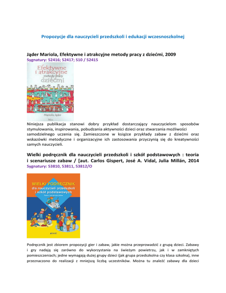 Propozycje dla nauczycieli przedszkoli i edukacji wczesnoszkolnej Jąder Mariola, Efektywne i atrakcyjne metody pracy z dziedmi, 2009 Sygnatury: 52416; 52417; S10 / 52415 Niniejsza publikacja stanowi dobry przykład dostarczający nauczycielom sposobów stymulowania, inspirowania, pobudzania aktywności dzieci oraz stwarzania możliwości samodzielnego uczenia się. Zamieszczone w książce przykłady zabaw z dziedmi oraz wskazówki metodyczne i organizacyjne ich zastosowania przyczynią się do kreatywności samych nauczycieli. Wielki podręcznik dla nauczycieli przedszkoli i szkół podstawowych : teoria i scenariusze zabaw / [aut. Carlos Gispert, José A. Vidal, Julia Millán, 2014 Sygnatury: 53810, 53811, 53812/O Podręcznik jest zbiorem propozycji gier i zabaw, jakie można przeprowadzid z grupą dzieci. Zabawy i gry nadają się zarówno do wykorzystania na świeżym powietrzu, jak i w zamkniętych pomieszczeniach; jedne wymagają dużej grupy dzieci (jak grupa przedszkolna czy klasa szkolna), inne przeznaczono do realizacji z mniejszą liczbą uczestników. Można tu znaleźd zabawy dla dzieci przedszkolnych, a także dla uczniów szkoły podstawowej, a wiele z nich podlega modyfikacjom w zależności od wieku graczy. W książce uwzględniono zabawy różnego typu – ruchowe, językowe, matematyczne, dwiczące umiejętnośd logicznego myślenia, rozwijające pamięd, uczące współdziałania itp. Wspomaganie rozwoju mowy i przygotowanie do nauki czytania i pisania : jak wspomagad rozwój przedszkolaka / red. prowadząca Krystyna Zielioska, Beata Krysiak ; zespół aut. Alicja Gołoś [et 2014] Sygnatury: 52831, 52832, 52950, 52951, 52953, S 9/52830 Zbiór kart pracy na zajęcia wspomagające rozwój przedszkolaków (3-, 4- i 5-latków). W zeszycie znajdują się materiały wspomagające rozwój mowy m.in. zabawy oddechowe, dwiczenia ortofoniczne, wspomagające rozwój umiejętności porozumiewania się oraz przygotowujące do nauki czytania i pisania m.in. dwiczenia doskonalące wrażliwośd słuchową, propozycje działao plastycznokonstrukcyjnych, dwiczenia graficzne. Wspomaganie rozwoju społeczno-emocjonalnego : jak wspomagad rozwój przedszkolaka / red. prowadząca Krystyna Zielioska, Beata Krysiak ; zespół aut. Beata Krysiak , 2014 Sygnatury: 52837, 52838, S10 II/52836 Zbiór kart pracy na zajęcia wspomagające rozwój przedszkolaków (3-, 4- i 5-latków). W zeszycie znajdują się materiały wspomagające rozwój emocjonalny m.in.: zabawy i dwiczenia rozbudzające poczucie własnej wartości, przygotowujące do radzenia sobie w trudnych sytuacjach, uodparniające na trudności oraz rozwój społeczny m.in. zabawy i działania ułatwiające naukę samodzielności, odpowiedzialności, umiejętności bycia w grupie, poznawania praw i obowiązków. Waloszek, Danuta , Między przedszkolem a szkołą : rozważania o gotowości dzieci do podjęcia nauki w szkole , 2014 Sygnatura: 373 / 53435 Zagadnienia poruszane w książce: 1. Spojrzenie wstecz, czyli sugestie z przeszłości. 2. Konteksty zadao edukacyjnych, czyli krótko o pedagogiach. 3. Istota edukacji w dzieciostwie. 4. Wybrane rozwiązania edukacji przedszkolno-szkolnej. 5. Umiejętności tzw. szkolne, podstawowe a gotowośd dzieci do ich uczenia się. 6. Przygotowanie dzieci do wejścia w przestrzeo i czas szkoły. 7. Obraz dziecka "gotowego" do wejścia w przestrzeo i czas szkoły. 8. Warunki formalne startu szkolnego. Podhájecká Mária, Gra edukacyjna oknem do poznawania dziecięcego świata, 2013 Sygnatury: 53004, 53005, S10 II/53003 Spis treści: 1. Gra jako okno do poznawania dziecięcego świata; 2. Gra edukacyjna; 3. Menedżment gier edukacyjnych; 4. Gra w kontekście procesu edukacyjnego; 5. Program edukacyjny "Dziecko i świat"; 6. Powiązanie diagnozy pedagogicznej z programem edukacyjnym i grą; 7. Rozwiązania praktyczne w zakresie rocznego programu edukacyjnego; 8. Propozycje gier edukacyjnych; 9. Unikalnośd gry w edukacji przedszkolnej; 10. Kompetencja nauczyciela w dziedzinie gier. Publikacja zawiera załączniki z narzędziami badawczymi: arkusz obserwacji KM37/1/6 dla dzieci w wieku 2-4 lat i arkusz obserwacji KM37/2/6 dla dzieci w wieku 5-6 lat, za pomocą których można prowadzid ewaluację gry. Wiatrowska, Leokadia. Dziecko u progu szkoły : dojrzałośd szkolna dzieci a ich gotowośd do nauki, 2013 Sygnatura: 52213 Spis treści: I. Dylematy wokół podstawowych pojęd. 1. Ujęcie definicyjne podstawowych pojęd; 2. Gotowośd dziecka; 3. Gotowośd instytucji; 4. Gotowośd rodziców. II. Współczesny sześciolatek. 1. Sylwetka i rozwój; 2. Sfera fizyczna; 3. Sfera poznawcza; 4. Sfera społeczno-emocjonalna; 5. Empatia. III. Rozważania o podmiotowości dziecka. 1. Istota dziecięcej podmiotowości; 2. Zabawa jako istotny czynnik budowania autonomii dziecka; 3. Przygotowanie do nauki jako świadomej działalności; 4. Kształtowanie nastawieo i obowiązkowości. IV. Rodzice sześciolatka. 1. Postawy rodzicielskie; 2. Tworzenie warunków sprzyjających kształtowaniu systemu wartości dzieci w wieku przedszkolnym; 3. Różnice indywidualne a deficyty rozwojowe. V. Sześciolatek w przedszkolu i w szkole. 1. Modyfikacje funkcji przedszkola; 2. Nastawienie szkoły wobec sześcio-, siedmioletniego ucznia. VI. Obszary działao diagnostycznych. 1. Sens diagnozy pedagogicznej; 2. Kompetencje diagnostyczne nauczyciela; 3. Narzędzia badao gotowości szkolnej; 4. Trudności z wyborem diagnostycznych instrumentów. Podsumowanie.