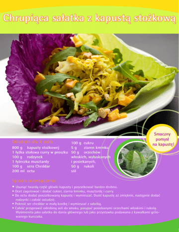 Chrupiąca sałatka z kapustą stożkową Składniki dla 4 osób 800 g kapusty stożkowej 1 łyżka stołowa curry w proszku 100 g rodzynek 1 łyżeczka musztardy 100 g sera Cheddar 200 ml octu 100 g cukru 5g ziaren kminku 50 g orzechów włoskich, wyłuskanych i posiekanych, 50 g rukoli sól Smaczny pomysł na kapustę! Sposób przyrządzenia: • Usunąć twardą część główki kapusty i poszatkować bardzo drobno. • Ocet zagotować i dodać cukier, ziarna kminku, musztardę i curry. • Do octu dodać poszatkowaną kapustę i wymieszać. Dusić kapustę aż zmięknie, następnie dodać rodzynki i całość ostudzić. • Pokroić ser cheddar w małą kostkę i wymieszać z sałatką. • Całość przyprawić odrobiną soli do smaku, posypać posiekanymi orzechami włoskimi i rukolą. Wyśmienita jako sałatka do dania głównego lub jako przystawka podawana z kawałkami grilowanego kurczaka.