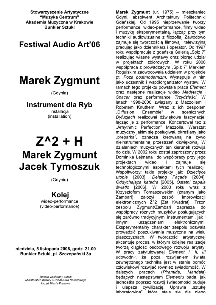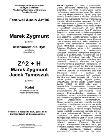 Stowarzyszenie Artystyczne “Muzyka Centrum” Akademia Muzyczna w Krakowie Bunkier Sztuki Festiwal Audio Art’06 Marek Zygmunt (Gdynia) Instrument dla Ryb instalacja (installation) Z^2 + H Marek Zygmunt Jacek Tymoszuk (Gdynia) Kolej wideo-performance (video-performance) niedziela, 5 listopada 2006, godz. 21.00 Bunkier Sztuki, pl. Szczepański 3a koncert wspierany przez: Ministerstwo Kultury i Dziedzictwa Narodowego Urząd Miasta Krakowa Marek Zygmunt (ur. 1975) – mieszkaniec Gdyni, absolwent Architektury Politechniki Gdańskiej. Od 1995 nieprzerwanie tworzy performance, wideo-performance, filmy wideo i muzykę eksperymentalną, łącząc przy tym techniki audiowizualne z filozofią. Zawodowo zajmuje się twórczością filmową i telewizyjną pracując jako dziennikarz i operator. Od 1997 roku współpracuje z gdańską Galerią „Spiż 7” realizując własne wystawy oraz biorąc udział w projektach zbiorowych. W roku 2000 współpraca z prowadzącym „Spiż 7” Markiem Rogulskim zaowocowała udziałem w projekcie pt. Poza postmodernizm. Występuje w nim jako uczestnik i współorganizator wystaw. W ramach tego projektu powstała praca Element oraz następne realizacje wideo Medytacje i Spacer oraz performance Trzydzieści. W latach 1998-2000 związany z Mazzollem i Robetem Knuthem. Wraz z ich zespołem „Diffusion Ensemble“ w scenicznych Dyfuzjach realizował dźwiękowe fascynacje, łącząc je z performance. Koncertował też z „Arhythmic Perfection” Mazzolla. Warsztat muzyczny jakim się posługiwał, określany jako „preparka”, oznacza kreowaną na żywo nieinstrumentalną przestrzeń dźwiękową. W działaniach muzycznych ten kierunek rozwija do dziś. W 2002 roku został zaproszony przez Dominika Lejmana do współpracy przy jego projektach wideo i zajmuje się technologicznymi aspektami tych realizacji. Współtworzył takie projekty jak: Dziecięce utopie [2003], Delaing Façade [2004], Oddychająca katedra [2005], Ostatni zapala światło [2006]. W 2003 roku wraz z Krzysztofem Tomaszewskim (znanym jako Zambari) założył zespół improwizacji elektronicznych Z^2 [Zet Kwadrat]. Trzon zespołu Zygmunt/Zambari zaprasza do współpracy różnych muzyków posługujących się zarówno tradycyjnymi instrumentami, jak i innymi urządzeniami elektronicznymi. Eksperymentalny charakter zespołu pozwala prowadzić poszukiwania muzyczne na wielu płaszczyznach. W twórczości artystycznej akcentuje proces, w którym kolejne realizacje tworzą ciągłość osobowego rozwoju artysty. W pracy zatytułowanej Element I, II, III udowodnił, że poza rozwijaniem świata zewnętrznego technika jest w stanie pomóc człowiekowi rozwijać również świadomość. W dalszych pracach (Piramida, Mandala) będących następstwem Elementu bada, jak jednostka poprzez rozwój świadomości buduje i ulepsza cywilizację. Uprawia „sztukę laboratoryjną”, która staje się dla niego poligonem doświadczalnym do wypracowywania nowych celów, wartości i znaczeń. Przez działania i realizacje sprawdza, udowadnia i konfrontuje stawiane przez siebie tezy, traktując sztukę jako jedno z narzędzi w procesie przenoszenia cywilizacji do innych wymiarów. Twierdzi, iż cywilizacja zmierza do modelu społeczeństwa technologicznego. W tym nadchodzącym modelu społeczeństwa (którego być może nie umiemy sobie nawet wyobrazić, przeczuwając jedynie instynktownie jego kształt) to co dziś nazywamy religią, filozofią, nauką i sztuką da nowy kształt dla materialnej obecności człowieka na ziemi i w kosmosie. Natomiast istota procesu transformacji cywilizacyjnej, poza osiągnięciami technologicznymi, leży w doskonaleniu świadomości poszczególnej jednostki tworzącej społeczność. Artysta prowadzi dokumentację działań dostępną pod adresem: www.marekzygmunt.art.pl Instrument dla ryb. „Poprzez tę realizację zmierzam do stworzenia instalacji, która umożliwi mi wykonanie kompozycji muzycznej w duecie z rybą. Wejście w interakcję z istotą, z którą do tej pory nie było możliwości komunikacji na płaszczyźnie muzycznej. Instrument dla ryb to połączenie instrumentuinstalacji oraz koncertu muzyki elektronicznej z użyciem tej instalacji. Instrument-instalacja składa się z kamery wideo śledzącej ruch ryby umieszczonej w akwarium oraz urządzeń elektronicznych, które transponują algorytm ruchu na kompozycję dźwiękową. Pełen zestaw składa się z akwarium, kamery, komputera, wzmacniacza i głośników. Koncert, w którym opisana instalacja zostanie wykorzystana do wykonania kompozycji, to koncert muzyki elektronicznej w którym udział bierze ryba wraz z instalacją oraz ja z własnym instrumentarium prowadzący wykonanie utworu wraz z rybą.“ [Marek Zygmunt] Opis instalacji. Instalacja składa się z akwarium, za którym znajduje się czarne tło, i w którym pływa ryba. Powinna ona być w miarę duża i jasna, z gatunku tych charakteryzujących się ruchliwością i dążeniem do penetrowania środkowych partii zbiornika. Akwarium z umieszczoną w nim rybą obserwowane jest z zewnątrz przez kamerę wideo. Sygnał z kamery przekazany jest na komputer i dalej do urządzeń nagłośnieniowych. Podstawę instalacji stanowi specjalny program zamieniający obraz ruchu ryby w kompozycję dźwiękową. Akwarium jest czyste (bez roślinności i z minimalną ilością urządzeń podtrzymujących funkcje życiowe: grzałka, termometr, natleniacz). Ciemne tło akwarium kontrastuje z jasną barwą ryby. Dzięki temu jest ona dla kamery poruszającym się punktem w płaszczyźnie bocznej akwarium. Ruch ryby obserwowany z zewnątrz przez kamerę wideo przekazany zostaje na komputer. Specjalny program zamienia obraz ruchu ryby w kompozycję dźwiękową. Zamienia on także informację o zmianie współrzędnych położenia ryby na algorytm dźwiękowy, w którym wysokość położenia ryby odpowiada wysokości dźwięku, a szybkość ruchu częstotliwości jego p