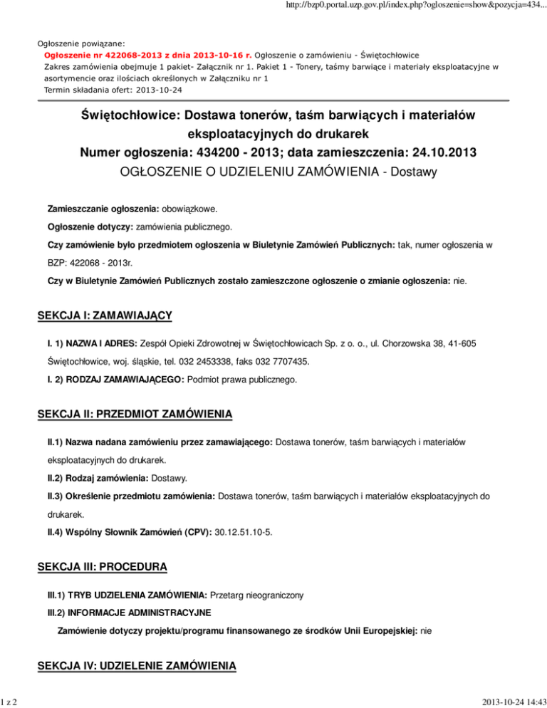 1z2 http://bzp0.portal.uzp.gov.pl/index.php?ogloszenie=show&pozycja=434... Ogłoszenie powiązane: Ogłoszenie nr 422068-2013 z dnia 2013-10-16 r. Ogłoszenie o zamówieniu - Świętochłowice Zakres zamówienia obejmuje 1 pakiet- Załącznik nr 1. Pakiet 1 - Tonery, taśmy barwiące i materiały eksploatacyjne w asortymencie oraz ilościach określonych w Załączniku nr 1 Termin składania ofert: 2013-10-24 Świętochłowice: Dostawa tonerów, taśm barwiących i materiałów eksploatacyjnych do drukarek Numer ogłoszenia: 434200 - 2013; data zamieszczenia: 24.10.2013 OGŁOSZENIE O UDZIELENIU ZAMÓWIENIA - Dostawy Zamieszczanie ogłoszenia: obowiązkowe. Ogłoszenie dotyczy: zamówienia publicznego. Czy zamówienie było przedmiotem ogłoszenia w Biuletynie Zamówień Publicznych: tak, numer ogłoszenia w BZP: 422068 - 2013r. Czy w Biuletynie Zamówień Publicznych zostało zamieszczone ogłoszenie o zmianie ogłoszenia: nie. SEKCJA I: ZAMAWIAJĄCY I. 1) NAZWA I ADRES: Zespół Opieki Zdrowotnej w Świętochłowicach Sp. z o. o., ul. Chorzowska 38, 41-605 Świętochłowice, woj. śląskie, tel. 032 2453338, faks 032 7707435. I. 2) RODZAJ ZAMAWIAJĄCEGO: Podmiot prawa publicznego. SEKCJA II: PRZEDMIOT ZAMÓWIENIA II.1) Nazwa nadana zamówieniu przez zamawiającego: Dostawa tonerów, taśm barwiących i materiałów eksploatacyjnych do drukarek. II.2) Rodzaj zamówienia: Dostawy. II.3) Określenie przedmiotu zamówienia: Dostawa tonerów, taśm barwiących i materiałów eksploatacyjnych do drukarek. II.4) Wspólny Słownik Zamówień (CPV): 30.12.51.10-5. SEKCJA III: PROCEDURA III.1) TRYB UDZIELENIA ZAMÓWIENIA: Przetarg nieograniczony III.2) INFORMACJE ADMINISTRACYJNE Zamówienie dotyczy projektu/programu finansowanego ze środków Unii Europejskiej: nie SEKCJA IV: UDZIELENIE ZAMÓWIENIA 2013-10-24 14:43 2z2 http://bzp0.portal.uzp.gov.pl/index.php?ogloszenie=show&pozycja=434... Część NR: 1 Nazwa: Dostawa tonerów, taśm barwiących i materiałów eksploatacyjnych do drukarekIV.1) DATA UDZIELENIA ZAMÓWIENIA: 24.10.2013. IV.2) LICZBA OTRZYMANYCH OFERT: 5. IV.3) LICZBA ODRZUCONYCH OFERT: 0. IV.4) NAZWA I ADRES WYKONAWCY, KTÓREMU UDZIELONO ZAMÓWIENIA: Copy.Net.pl Piotr Sójka, ul. Cypryjska 70/U2, 02-761 Warszawa, kraj/woj. mazowieckie. IV.5) Szacunkowa wartość zamówienia (bez VAT): 75000,00 PLN. IV.6) INFORMACJA O CENIE WYBRANEJ OFERTY ORAZ O OFERTACH Z NAJNIśSZĄ I NAJWYśSZĄ CENĄ Cena wybranej oferty: 61561,50 Oferta z najniŜszą ceną: 61561,50 / Oferta z najwyŜszą ceną: 107337,01 Waluta: PLN. 2013-10-24 14:43