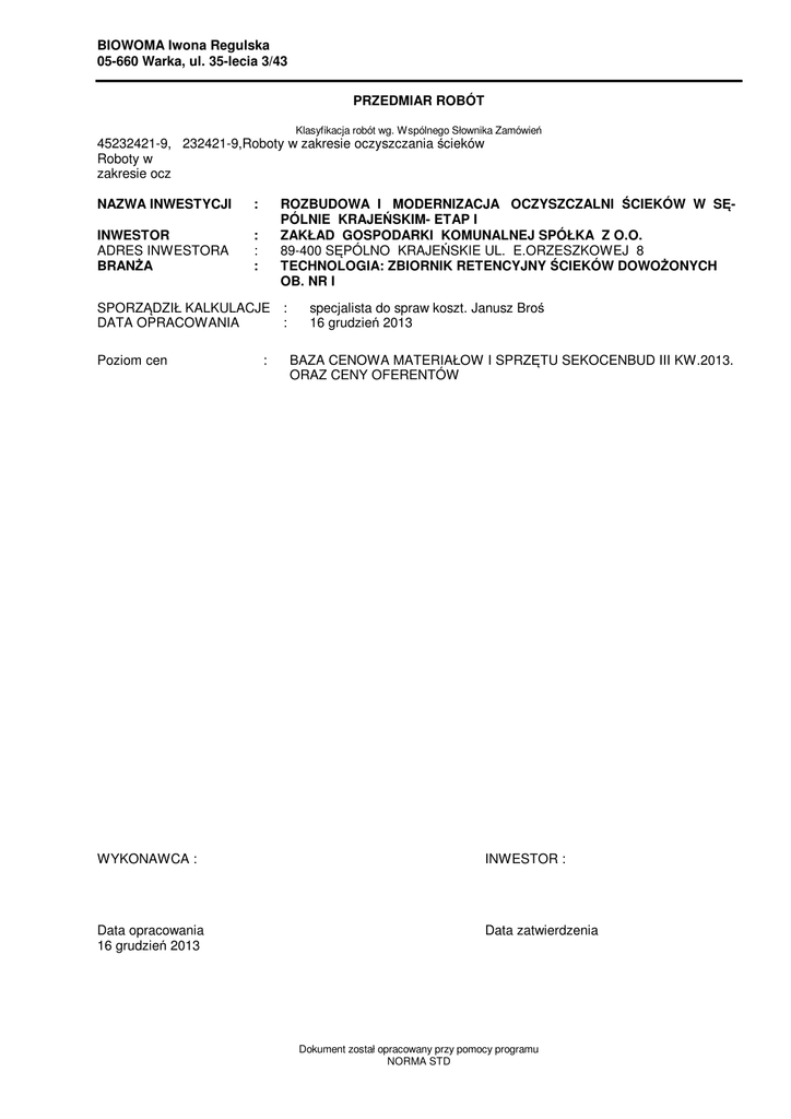 BIOWOMA Iwona Regulska 05-660 Warka, ul. 35-lecia 3/43 PRZEDMIAR ROBÓT Klasyfikacja robót wg. Wspólnego Słownika Zamówień 45232421-9, 232421-9,Roboty w zakresie oczyszczania ścieków Roboty w zakresie ocz NAZWA INWESTYCJI : INWESTOR ADRES INWESTORA BRANŻA : : : ROZBUDOWA I MODERNIZACJA OCZYSZCZALNI ŚCIEKÓW W SĘPÓLNIE KRAJEŃSKIM- ETAP I ZAKŁAD GOSPODARKI KOMUNALNEJ SPÓŁKA Z O.O. 89-400 SĘPÓLNO KRAJEŃSKIE UL. E.ORZESZKOWEJ 8 TECHNOLOGIA: ZBIORNIK RETENCYJNY ŚCIEKÓW DOWOŻONYCH OB. NR I SPORZĄDZIŁ KALKULACJE : DATA OPRACOWANIA : Poziom cen : specjalista do spraw koszt. Janusz Broś 16 grudzień 2013 BAZA CENOWA MATERIAŁOW I SPRZĘTU SEKOCENBUD III KW.2013. ORAZ CENY OFERENTÓW WYKONAWCA : INWESTOR : Data opracowania 16 grudzień 2013 Data zatwierdzenia Dokument został opracowany przy pomocy programu NORMA STD OGÓLNA CHARAKTERYSTYKA OBIEKTU Zbiornik retencji dla ścieków dowożonych - obiekt nr I - ETAP I Dla retencji ścieków dowożonych proponuje się wykorzystanie podziemnej części obecnej przepompowni ścieków. Posiada ona średnicę 7,5m i głębokość do terenu około 5,7m. Stąd przy założeniu użytkowej głębokości 4,5m mamy pojemność użytkową równa: V = 3,14 x 3,75 x 3,75 x 5 = 221m3 Zbiornik retencyjny ścieków dowożonych powstanie przez adaptację do tych celów istniejącej pompowni głównej po usunięciu budowlanej części nadziemnej, wyremontowaniu zbiornika podziemnego z usunięciem wyposażenia i elementów budowlanych nie będących elementami konstrukcyjnymi. Wyposażenie: a) Przykrycie zbiornika kopułą laminatową wyposażoną w system wentylacji grawitacyjnej i odprowadzenia wód opadowych. W przykrywie laminatowej przewiduje się kominek antyodorowy b) Pompy P1 i P2 zatapialne do współpracy z falownikiem każda z silnikiem 1,9 kW i oprzyrządowaniem stacjonarnym (kolano stopowe, zaczep, górny uchwyt prowadnicy 2-rurowej). - wydajność 20 m3/h = 5,6 dm3/sek, - wysokość podnoszenia 5,0m sł. wody - rurociąg tłoczny o średnicy 90mm - podwójne uszczelnienie mechaniczne, - korpus żeliwo szare EN-JL1040 - wirnik żeliwo twarde EN-JN 3029 - wał Stal nierdzewna EN-1.4021+QT800 - śruby, nakrętki Stal nierdzewna EN-1.4301 - klasa ochrony IP68 c) Mieszadła M1, M2 mechaniczne każde z silnikiem o mocy 2,5 kW z zestawem montażowym i żurawikiem do podnoszenia. Zestaw montażowy dla każdego mieszadła złożony z : - uchwyt do zamocowania agregatu w pozycji poziomej, - uchwyt prowadnicy, - górne mocowanie prowadnicy rurowej, - dolne mocowanie prowadnicy rurowej, - prowadnica rurowa 60x60x3, L=6m. d) Zasuwy nożowe z napędem ręcznym ZNR 4 - D=80mm, na rurociągu tłocznym pompy P1 ZNR 5 - D=80mm, na rurociągu tłocznym pompy P2 e) Zasuwa nożowa z napędem elektrycznym ZNE1 napęd umożliwiający częściowe otwarcie - D=90mm, spust ze zbiornika retencyjnego ścieków dowożonych do przepompowni głównej f) Zaworu kątowe ZZK 1 - na rurociągu tłocznym do P1 ZZK 2 - na rurociągu tłocznym do P2 -2- Norma STD Wersja 4.39a Nr seryjny: 9568 Użytkownik: BIOWOMA - projektowanie oczyszczalni ścieków TABELA WARTOŚCI ELEMENTÓW SCALONYCH Lp. Pozycje kosztorysowe 1 Nazwa Wartość 3 ZBIORNIK RETENCYJNY ŚCIEKÓW DOWOŻONYCH 1.1 1-4 Urządzenia 1.2 5 - 19 Wyposażenie technologiczne 1.3 20 - 20 Przykrycie zbiornika - laminat RAZEM Wartość kosztorysowa robót bez podatku VAT 1 2 1 - 20 4 Słownie: -3- Norma STD Wersja 4.39a Nr seryjny: 9568 Użytkownik: BIOWOMA - projektowanie oczyszczalni ścieków Jedn. mia- Ilość jedn. Wskaźnik ry na jednostkę 5 6 7 Udzia ł procentowy 8 OBMIAR Lp. Podstawa 1 1.1 1 KNR 7-07 d.1.1 0107-01 Opis i wyliczenia j.m. ZBIORNIK RETENCYJNY ŚCIEKÓW DOWOŻONYCH Urządzenia Montaż pomp odśrodkowych, zatapianych ze stopą sprzęgającą z podwodnym sil- kpl nikiem elektrycznym o mocy 1,9kW o masie 0,1t Q=20m3/h wys. pod. 5,0msł. wody P1,P2 2 kpl 2 KNR 7-07 d.1.1 0103-01 Montaż mieszadła moc 2,5k W M1,M2, kpl 2 kpl 3 KNR 7-09 d.1.1 2619-04 Montaż zasuw kołnierzowych nożowych z napędem elektrycznym o średnicy nomi- szt nalnej 80mm wg.projektu 1 szt 4 KNR 7-03 d.1.1 0101-01 Montaż żurawika do wciągania mieszadła - analogia szt 2 szt 1.2 5 KNR 7-09 d.1.2 2619-04 Wyposażenie technologiczne Montaż zasuw kołnierzowych z klinem wygumowanym o średnicy nominalnej 80mm wg.projektu 2 6 KNR 7-09 d.1.2 2207-05 Montaż rurociągów stalowych łączonych na kołnierze, na ciśnienie nominalne 1, 6MPa stal KO 304 DN 80/2,0mm 16 m 7 KNR 7-09 d.1.2 2114-05 Montaż kształtek stalowych stal K.O. 304 spawanych DN 80/2 - trójnik szt 1 szt 8 KNR 7-09 d.1.2 2606-04 Montaż zaworów zwrotnych kołnierzowych na ciśnienie nominalne do 1,6MPa o średnicy nominalnej 80mm 2 szt 9 KNR 7-09 d.1.2 2201-03 Materiały do połączeń kołnierzowych na ciśnienie nominalne do 1,6MPa DN 80 śruba M16x80 -stal kwasoodporna,tuleje wywijki K.O.,kołnierze aluminiowe luźne, 14 styk 10 KNR 7-09 d.1.2 0305-05 Spawanie ręczne łukowe stali austenitycznych-spoiny nie bad.radiologicznie, ruro- złącze ciągi DN 80/2 20 złącze 11 KNNR 4 d.1.2 1009-03 Rurociągi z rur polietylenowych PE o średnicy zewnętrznej 90mm m 3 m 12 KNNR 4 d.1.2 1010-03 Połączenia rur polietylenowych, ciśnieniowych PE o średnicy zewnętrznej rur 90mm metodą zgrzewania czołowego 3 złącze 13 KNNR 4 d.1.2 1012-01 Montaż tulei kołnierzowych PE o średnicy zewnętrznej 90mm o połączeniach zgrzewano-kołnierzowych (PE-stal) 2 szt 14 KNR 7-09 d.1.2 2201-03 Materiały do połączeń kołnierzowych na ciśnienie nominalne do 1,6MPa DN 80 śruba M16x80 -stal kwasoodporna,tuleje wywijki K.O.,kołnierze aluminiowe luźne, 2 styk 15 KNNR 4 d.1.2 1009-09 Rurociągi z rur polietylenowych (PE,PEHD) o średnicy zewnętrznej 200mm m 3 m 16 KNNR 4 d.1.2 1010-09 Połączenia rur polietylenowych, ciśnieniowych PE, o średnicy zewnętrznej rur 200mm metodą zgrzewania czołowego 3 złącze 17 KNR 7-09 d.1.2 2216-08 Montaż łańcucha uszczelniające