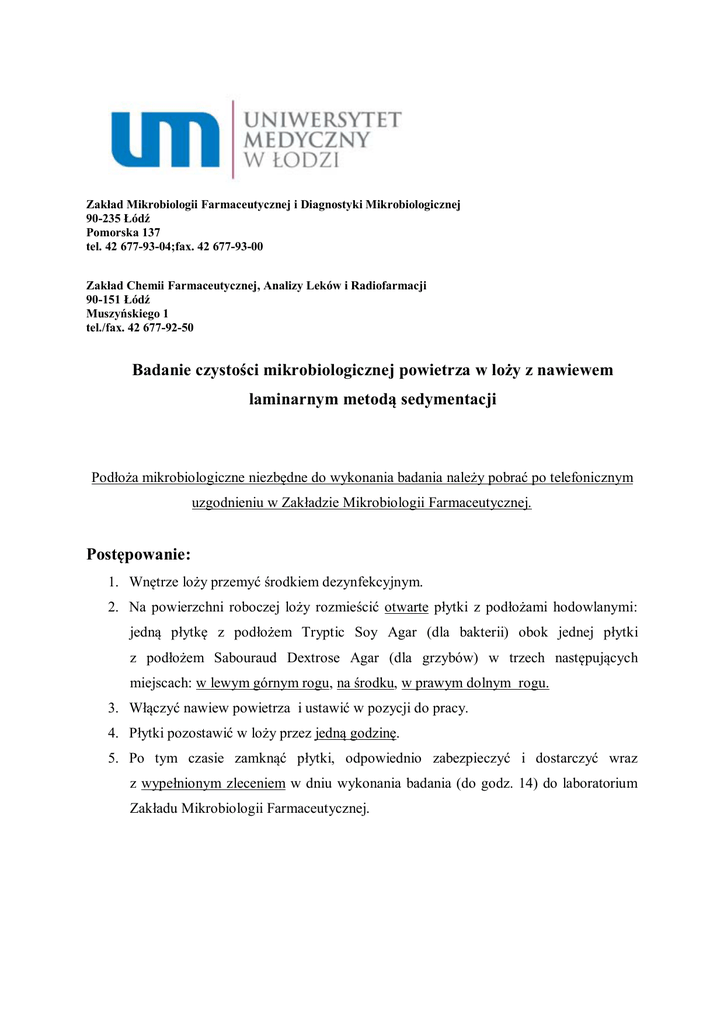 Zakład Mikrobiologii Farmaceutycznej i Diagnostyki Mikrobiologicznej 90-235 Łódź Pomorska 137 tel. 42 677-93-04;fax. 42 677-93-00 Zakład Chemii Farmaceutycznej, Analizy Leków i Radiofarmacji 90-151 Łódź Muszyńskiego 1 tel./fax. 42 677-92-50 Badanie czystości mikrobiologicznej powietrza w loży z nawiewem laminarnym metodą sedymentacji Podłoża mikrobiologiczne niezbędne do wykonania badania należy pobrać po telefonicznym uzgodnieniu w Zakładzie Mikrobiologii Farmaceutycznej. Postępowanie: 1. Wnętrze loży przemyć środkiem dezynfekcyjnym. 2. Na powierzchni roboczej loży rozmieścić otwarte płytki z podłożami hodowlanymi: jedną płytkę z podłożem Tryptic Soy Agar (dla bakterii) obok jednej płytki z podłożem Sabouraud Dextrose Agar (dla grzybów) w trzech następujących miejscach: w lewym górnym rogu, na środku, w prawym dolnym rogu. 3. Włączyć nawiew powietrza i ustawić w pozycji do pracy. 4. Płytki pozostawić w loży przez jedną godzinę. 5. Po tym czasie zamknąć płytki, odpowiednio zabezpieczyć i dostarczyć wraz z wypełnionym zleceniem w dniu wykonania badania (do godz. 14) do laboratorium Zakładu Mikrobiologii Farmaceutycznej.