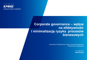 Corporate governance – wpływ na efektywność i minimalizację ryzyka procesów biznesowych Seminarium Podkomisji ds. Audytu i Kontroli Wewnętrznej Polskiej Izby Ubezpieczeń 21 maja 2015 Beata Szeląg Agenda Czym jest nadzór korporacyjny Nadzór korporacyjny a wymogi Solvency II Role funkcji w ramach nadzoru korporacyjnego Audyt wewnętrzny Compliance Zarządzanie ryzykiem Aktuariat Współpraca między funkcjami Model RACI © 2015 KPMG Sp. z o.o., a Polish limited liability company and a member firm of the KPMG network of independent member firms affiliated with KPMG International Cooperative (“KPMG International”), a Swiss entity. All rights reserved. Czym jest nadzór korporacyjny? “Procedury i procesy definiujące sposób zarządzania organizacją i jej kontrolę. Struktura nadzoru korporacyjnego narzuca podział praw i obowiązków pomiędzy poszczególne jednostki organizacji – Zarząd, Menedżerów, Akcjonariuszy i Interesariuszy – oraz określa zasady i procedury dotyczące podejmowania decyzji w organizacji.” Zasady nadzoru korporacyjnego OECD, 2004. Zakres odpowiedzialności Zarządu Rola Interesariuszy w procesach nadzoru korporacyjnego Fundamentalne zasady Jawność i przejrzystość © 2015 KPMG Sp. z o.o., a Polish limited liability company and a member firm of the KPMG network of independent member firms affiliated with KPMG International Cooperative (“KPMG International”), a Swiss entity. All rights reserved. Prawa i równoprawne traktowanie Wspólników / Akcjonariuszy Nadzór korporacyjny Wytyczne KNF lipiec 2014 Struktura organizacyjna Relacje z udziałowcami Organ zarządzający - Zarząd Organ nadzorujący - Rada Nadzorcza Polityka wynagradzania Polityka informacyjna Działalność promocyjna i relacje z klientami Kluczowe systemy i funkcje wewnętrzne • Kontrola wewnętrzna • Zapewnienie zgodności • Zarządzanie ryzykiem • Audyt wewnętrzny Wykonywanie uprawnień nabytych na ryzyko klienta © 2015 KPMG Sp. z o.o., a Polish limited liability company and a member firm of the KPMG network of independent member firms affiliated with KPMG International Cooperative (“KPMG International”), a Swiss entity. All rights reserved. Wymogi Solvency II Źródło: „Audyt – Compliance – Zarządzenie Ryzykiem –Aktuariat. Modele współpracy w zakładach ubezpieczeń” autorstwa członków Podkomisji ds. Audytu i Kontroli Wewnętrznej PIU, pracowników firmy KPMG oraz przedstawicieli Urzędu Komisji Nadzoru Finansowego, Listopad 2013 © 2015 KPMG Sp. z o.o., a Polish limited liability company and a member firm of the KPMG network of independent member firms affiliated with KPMG International Cooperative (“KPMG International”), a Swiss entity. All rights reserved. Solvency II – System Zarządzania (art. 41-49) Art.. Zakres Kluczowe wymagania 41 Ogólne wymogi w zakresie zarządzania ■ Jasna i przejrzysta struktura organizacyjna zapewniająca odpowiedni rozdział odpowiedzialności. ■ Spisane polityki dotyczące co najmniej: zarządzania ryzykiem, kontroli wewnętrznej oraz, jeśli występuje, outsourcingu. 42 Wymogi dotyczące kompetencji i reputacji ■ Osoby zarządzające spółką lub pełniące kluczowe funkcje muszą posiadać odpowiednie kwalifikacje zawodowe, wiedzę oraz doświadczenie, konieczne dla zapewnienia prawidłowego i ostrożnego zarządzania (kompetencje); oraz muszą charakteryzować się nieposzlakowaną opinią i uczciwością (reputacja). 43 Dowody poświadczające reputację ■ Wskazanie jakie dowody poświadczające są akceptowalne w przypadku obywateli Państw Członkowskich. 44 Zarządzanie ryzykiem ■ Wymogi dotyczące systemu zarządzania ryzykiem (np. procesy i procedury bieżącego raportowania konieczne dla identyfikacji, pomiaru, monitoringu, zarządzania i raportowania w zakresie ryzyka). ■ Wskazanie funkcji zarządzania ryzykiem na modelu wewnętrznym. 45 Własna ocena ryzyka i wypłacalności ■ Własna ocena ryzyka i wypłacalności jest istotnym elementem procesów nadzoru, szczególnie ważnym z punktu widzenia Zarządu spółki. 46 Kontrola wewnętrzna ■ System kontroli wewnętrznej powinien obejmować co najmniej procedury administracyjne i księgowe, ramy kontroli wewnętrznej, odpowiednie ustalenia w zakresie sprawozdawczości na wszystkich szczeblach oraz funkcję ciągłej zgodności z przepisami. 47 Audyt wewnętrzny ■ Wymóg określający funkcję audytu wewnętrznego jako obiektywną i niezależną od funkcji operacyjnych. 48 Funkcja aktuarialna ■ Szczegółowe wymogi dotyczące roli funkcji aktuarialnej i jej interakcji z Zarządem, jak również innych funkcji (np. funkcji ryzyka). 49 Outsourcing ■ Identyfikacja przypadków, kiedy kluczowe lub istotne funkcje nie mogą być outsourcowane. ■ Wymóg informowania organów nadzorczych o outsourcingu kluczowych funkcji. © 2015 KPMG Sp. z o.o., a Polish limited liability company and a member firm of the KPMG network of independent member firms affiliated with KPMG International Cooperative (“KPMG International”), a Swiss entity. All rights reserved. Rola funkcji zarządzania ryzykiem Zadania funkcji zarządzania ryzykiem: koordynacja zadań związanych z zarządzaniem ryzykiem przedstawienie ogólnej sytuacji ryzyka w zakładzie ubezpieczeń rozpoznawanie ryzyka i odpowiednie eskalowanie w organizacji propagowanie wewnątrz organizacji zarządzania ryzykiem doradztwo dla zarządu monitorowanie skuteczności systemu zarządzania ryzykiem UWAGA funkcja zarządzania ryzykiem nie jest właścicielem ryzyk i mechanizmów kontroli – jest koordynatorem procesu/ systemu zarządzania ryzykiem © 2015 KPMG Sp. z o.o., a Polish limited liability company and a member firm of the KPMG network of independent member firms affiliated with KPMG International Cooperative (“KPMG International”), a Swiss entity. All rights reserved. Rola funkcji compliance Zadania funkcji compliance: Identyfikacja i monitorowanie ryzyka wynikające