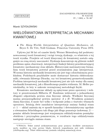 RECENZJE ZAGADNIENIA FILOZOFICZNE W NAUCE IV / 1982, s. 76–80∗ Marek SZYDŁOWSKI WIELOŚWIATOWA INTERPRETACJA MECHANIKI KWANTOWEJ • The Many–Worlds Interpretation of Quantum Mechanics, ed. Bryce S. De Vitt, Neill Graham. Princeton University Press 1973. Upływa już 56 lat od czasów kiedy Werner Heisenberg dał podstawy nowoczesnej teorii kwantowej i wciąż trwają dyskusje, co właściwie z tej teorii wynika. Przejście od teorii klasycznej do kwantowej zostało osiągnięte za ceną utraty naoczności. Dyskusja koncentruje się głównie wokół problemu opisu obserwacji, interpretacji funkcji falowej przedstawiającej kwantowo–mechaniczny stan układu. Historycznie matematyczny formalizm teorii kwantowej powstał przed zrozumieniem jego interpretacji. Wczesna historia mechaniki kwantowej nie jest tego odosobnionym przykładem. Podobnych przykładów może dostarczyć historia elektrodynamiki, równania falowego Diracka, czy też kwantowej geometrodynamiki. Problem interpretacji mechaniki kwantowej jest nie tyle ważny dla samej mechaniki kwantowej, jak z filozoficznego punktu widzenia. M. Heller powiedziałby, że leży w zakresie wewnętrznej metodologii fizyki. Kwantowo–mechaniczne układy są opisywane przez operatory i wektory w przestrzeniach Hilberta H. Każdemu wektorowi o jednostkowej długości odpowiada pewien stan fizyczny układu. Wielkości fizycznej można przyporządkować pewien operator A z H. Wynikiem pomiaru danej fizycznej A może być tylko i wyłącznie jedna z wartości własnych operatora. Istnieją dwie zasadnicze interpretacje zmiany funkcji stanu ψ: 1 — układ zmienia się w sposób kauzalny i deterministyczny zgodnie z równaniem Schrödingera tak długo jak długo pozostaje izolowany, 2 — pomiar układu kwantowego jest wzajemnym oddziaływaniem pomiędzy obiektem i przyrządem pomiarowym, w rezultacie tego oddziaływania następuje nieciągła zmiana stanu. ∗ UWAGA: Tekst został zrekonstruowany przy pomocy środków automatycznych; możliwe są więc pewne błędy, których sygnalizacja jest mile widziana ([email protected]). Tekst elektroniczny posiada odrębną numerację stron. 2 Marek SZYDŁOWSKI Nasuwa się następujące pytanie: Czy z punktu widzenia teorii kwantowej statystyczny charakter naszych odkryć eksperymentalnych stanowi wyłącznie rezultat oddziaływania na system z zewnątrz, podczas gdy systemy same w sobie opisywane są za pomocą funkcji ψ w sposób deterministyczny? Albo inaczej: czy funkcję ψ winniśmy traktować jako całkowity opis rzeczywistości, a tylko oddziaływanie na system z zewnątrz przez obserwację winniśmy obarczać odpowiedzialnością za to, iż nasze przewidywania mają charakter tylko statystyczny? W kontekście odpowiedzi na te pytania pojawiają się różne interpretacje mechaniki kwantowej. Spróbujmy je usystematyzować: 1. Interpretacja popularna: ψ — jest traktowana jako obiektywna charakterystyka pojedynczego obiektu. Układ sam w sobie jest zmienny statystycznie, nieciągłości powstają w wyniku obserwacji. Taki punkt widzenia prowadzi do licznych paradoksów np. Einsteina–Rosena–Podolskiego. 2. Interpretacja kopenhaska: Została ona rozwinięta przez Bohra. Funkcja ψ jest tutaj traktowana nie jako umożliwiająca całościowy, obiektywny opis stanu, ale jako pewne narzędzie umożliwiające statystyczne predykcje. Nie ma nic takiego jak całkowity opis, a możliwy jest jedynie statystyczny opis układów. Zrozumienie rzeczywistości uzyskujemy przez stosowanie różnych komplementarnych modeli. 3. Interpretacja zmiennych ukrytych: Interpretacja ta była prezentowana w różnych odmianach przez Einsteina, Bohma, Wienera i Siegala. Według tej interpretacji całkowity opis układu zawiera pewne parametry ukryte, których uwzględnienie prowadzi do teorii deterministycznej. Z nieznajomości tych exstra–parametrów wynika statystyczny charakter teorii kwantowej. Funkcja falowa ψ nie opisuje pojedynczego układu, ale pewien ensemble stanów. 4. Interpretacja stochastyczna: Według tej interpretacji fundamentalne procesy fizyczne mają naturę procesów stochastycznych (losowych). Układy fizyczne w dowolnej chwili znajdują się w pewnym stanie który w sposób ciągły i losowy przechodzi w inny stan. Nieciągła zmiana ψ nie wynika z zaburzenia wywołanego obserwacją, lecz z zachowania się samego układu. Taka interpretacja była reprezentowana przez Boppa, który analizował probabilistyczne prawo ruchu cząstki kwantowej. WIELOŚWIATOWA INTERPRETACJA... 3 5. Interpretacja falowa: Funkcja falowa ψ umożliwia obiektywny, jednoznaczny opis układu, spełnia deterministyczne równania falowe. Probabilistyczna interpretacja wynika z tej teorii jako subiektywne zjawisko dla obserwatorów (podobnie jak w klasycznej mechanice statystycznej), którzy są traktowani jako podmioty układów fizycznych stosujących taki sam opis i nie posiadający uprzywilejowanej pozycji. Ta ostatnia interpretacja jest chyba najbardziej nieznana chociaż została sformułowana już w 1957 roku przez Everetta. Prezentowana tutaj książka stanowi wykład tej niesłusznie zapomnianej wieloświatowej interpretacji mechaniki kwantowej. H. Everett sformułował ją w oparciu o tzw. teorię uniwersalnej funkcji falowej w pracy: “Relative State” Formulation of Quantum Mechanics (Revs. Modern. Phys. 29, 454 (1957)). Na treść omawianej książki składają się prace Everetta oraz znanych fizyków: J. A. Whellera, B. S. De Vitta, L. N. Coopera i van Vechtena, znacznie uzupełniające doktrynę Everetta. Spróbuję bliżej scharakteryzować koncepcję Everetta. To, co jest chyba najbardziej interesujące w tej doktrynie, to fakt że wynika ona z samego formalizmu mechaniki kwantowej. W tej interpretacji jest sens mówić o wektorze stanu dla całego wszechświata. Wektor stanu nigdy nie zapada się (Is never recolapsing) skutkiem czego rzeczywistość jest ściśle deterministyczna. Nie jest to