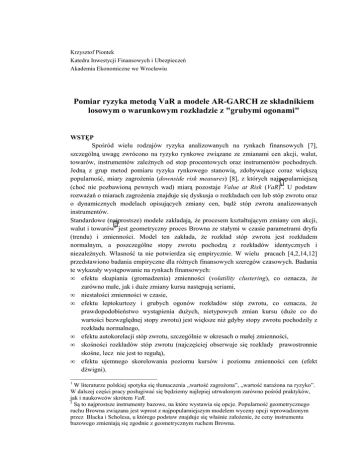 Krzysztof Piontek Katedra Inwestycji Finansowych i Ubezpieczeń Akademia Ekonomiczne we Wrocławiu Pomiar ryzyka metodą VaR a modele AR-GARCH ze składnikiem losowym o warunkowym rozkładzie z "grubymi ogonami" WSTĘP Spośród wielu rodzajów ryzyka analizowanych na rynkach finansowych [7], szczególną uwagę zwrócono na ryzyko rynkowe związane ze zmianami cen akcji, walut, towarów, instrumentów zależnych od stop procentowych oraz instrumentów pochodnych. Jedną z grup metod pomiaru ryzyka rynkowego stanowią, zdobywające coraz większą popularność, miary zagrożenia (downside risk measures) [8], z których najpopularniejszą (choć nie pozbawioną pewnych wad) miarą pozostaje Value at Risk (VaR)1. U podstaw rozważań o miarach zagrożenia znajduje się dyskusja o rozkładach cen lub stóp zwrotu oraz o dynamicznych modelach opisujących zmiany cen, bądź stóp zwrotu analizowanych instrumentów. Standardowe (najprostsze) modele zakładają, że procesem kształtującym zmiany cen akcji, walut i towarów2 jest geometryczny proces Browna ze stałymi w czasie parametrami dryfu (trendu) i zmienności. Model ten zakłada, że rozkład stóp zwrotu jest rozkładem normalnym, a poszczególne stopy zwrotu pochodzą z rozkładów identycznych i niezależnych. Własność ta nie potwierdza się empirycznie. W wielu pracach [4,2,14,12] przedstawiono badania empiryczne dla różnych finansowych szeregów czasowych. Badania te wykazały występowanie na rynkach finansowych: • efektu skupiania (gromadzenia) zmienności (volatility clustering), co oznacza, że zarówno małe, jak i duże zmiany kursu następują seriami, • niestałości zmienności w czasie, • efektu leptokurtozy i grubych ogonów rozkładów stóp zwrotu, co oznacza, że prawdopodobieństwo wystąpienia dużych, nietypowych zmian kursu (duże co do wartości bezwzględnej stopy zwrotu) jest większe niż gdyby stopy zwrotu pochodzily z rozkładu normalnego, • efektu autokorelacji stóp zwrotu, szczególnie w okresach o małej zmienności, • skośności rozkładów stóp zwrotu (najczęściej obserwuje się rozkłady prawostronnie skośne, lecz nie jest to regułą), • efektu ujemnego skorelowania poziomu kursów i poziomu zmienności cen (efekt dźwigni). 1 W literaturze polskiej spotyka się tłumaczenia „wartość zagrożona”, „wartość narażona na ryzyko”. W dalszej części pracy posługiwać się będziemy najlepiej utrwalonym zarówno pośród praktyków, jak i naukowców skrótem VaR. 2 Są to najprostsze instrumenty bazowe, na które wystawia się opcje. Popularność geometrycznego ruchu Browna związana jest wprost z najpopularniejszym modelem wyceny opcji wprowadzonym przez Blacka i Scholesa, u którego podstaw znajduje się właśnie założenie, że ceny instrumentu bazowego zmieniają się zgodnie z geometrycznym ruchem Browna. Są to jedynie podstawowe efekty zaobserwowane w szeregach stóp zwrotu i zmienności instrumentów finansowych. Oprócz tych, można by też wyróżnić np. efekt długoterminowej zależności stóp zwrotu, efekt korelacji pomiędzy stopami zwrotu różnych instrumentów lub wręcz różnych segmentów rynku, bądź rynków (volatilities comovement) oraz całą gamę tzw. efektów kalendarzowych związanych z odmiennymi rozkładami stóp zwrotu dla niektórych dni tygodnia lub dla niektórych miesięcy. Niezbędne stało się więc poszukiwanie modeli lepiej opisujących zachowanie się szeregów cen i stóp zwrotu (uwzględniających przynajmniej niektóre z wymienionych powyżej efektów), które można by wykorzystać w wyznaczaniu miary VaR. W niniejszej pracy, jako potencjalne modele umożliwiające opis kształtowania się stóp zwrotu, przyjęte zostały modele AR(1)-GARCH(1,1) ze składnikiem losowym, którego warunkowy rozkład jest rozkładem normalnym, symetrycznym rozkładem t-Studenta lub rozkładem GED (General Error Distribution). Procesy te umożliwiają modelowanie szeregów z autokorelacją, leptokurtozą rozkładów stóp zwrotu oraz z efektem gromadzenia zmienności. Dokonano weryfikacji przydatności poszczególnych modeli do opisu dziennych logarytmicznych stóp zwrotu z indeksu WIG (stopy zwrotu z okresu 16.04.199116.05.2002, 2315 obserwacji), indeksu SP500 (stopy zwrotu z okresu 05.01.1970 – 15.05.2002, 8172 obserwacje) oraz indeksu DJIA (stopy zwrotu z okresu 23.08.1962 – 20.05.2002, 10000 obserwacji). 1. Analizowane modele szeregów stop zwrotu Jak już zostało zasygnalizowane, rozważania o pomiarze ryzyka rynkowego metodą VaR rozpocząć należy od wyboru (i uzasadnienia) modeli dynamiki stop zwrotu. Od wyboru modelu stóp zwrotu zależy późniejszy pomiar wartości VaR. Ograniczenie się do klasy modeli AR(1)-GARCH(1,1) [4,2] podyktowane zostało wcześniejszymi badaniami przeprowadzonymi dla indeksu WIG [12]oraz faktem, że w większości przypadków analizowanych w literaturze przedmiotu wybór rzędu procesu autoregresji na poziomie AR(1) oraz procesu GARCH na poziomie GARCH(1,1) jest wystarczający dla uchwycenia efektu autoregresji oraz heteroskedastyczności. Poniżej na rys. 1 i rys. 2 przedstawione zostały (w ramach uzasadnienia wyboru modelu) autokorelacje szeregu stóp zwrotu dla indeksu WIG oraz autokorelacje kwadratów stóp zwrotu. Obserwujemy znaczącą autokorelacje rzędu pierwszego oraz znaczące autokorelacje kwadratów stóp zwrotu, co jest uzasadnieniem wykorzystania modelu umożliwiającego modelowanie zmiennej w czasie wariancji procesu (modelu GARCH). Dokładniejszą weryfikację hipotez o występowanie efektu autokorelacji stop zwrotu oraz o występowaniu efektu GARCH dla indeksu WIG przedstawiono w pracy [12]. Do testowania efektu autoregresji wykorzystano test istotności współczynnika autokorelacji [13], istotność pozostałych autokorelacji wyższych rzędów zbadano testem Q Ljunga-BoxaPierce’a [3]3. Współczynnik autokorelacji rzędu pierwszego okazał się istotny, natomiast w 3 W wiel