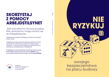 Tryk GP-Tryk Design BystedFFW Udgivet December 2015 Jeśli pracodawca narusza przepisy bhp, pracownicy mogą zwrócić się do Arbejdstilsynet. Polsk SKORZYSTAJ Z POMOCY ARBEJDSTILSYNET NIE YZYKUJ R Arbejdstilsynet jest organem nadzorującym warunki pracy na placach budowy w Danii. Arbejdstilsynet przyjmuje zgłoszenia dotyczące wątpliwości w kwestii zachowania bhp w miejscu pracy. Pracownik ma prawo pozostać anonimowy – to znaczy, że ani pracodawca ani współpracownicy nie dowiedzą się, że skontaktował się z Arbejdstilsynet. Z Arbejdstilsynet można skontaktować się telefonicznie pod numerem 70 12 12 88, pocztą elektroniczną pod adresem [email protected] lub za pomocą elektronicznego formularza skargi w witrynie www.at.dk/klage. Arbejdstilsynet Postboks 1228 · 0900 København C Tlf. 70 12 12 88 · [email protected] www.arbejdstilsynet.dk swojego bezpieczeństwa na placu budowy ODPOWIEDZIALNOŚĆ PRACODAWCY Pracodawca jest odpowiedzialny za zapewnienie pracownikom bezpieczeństwa pracy na placu budowy. Pracodawca musi między innymi zagwarantować: NIE RYZYKUJ swojego bezpieczeństwa na placu budowy UPADKI Z WYSOKOŚCI aby plac budowy był tak urządzony, by nie istniało na nim ryzyko np. upadku z wysokości, potknięcia się i spadnięcia na niższy poziom czy zawalenia się konstrukcji, – Prace na wysokości wolno wykonywać tylko po zapewnieniu zabezpieczenia przed upadkiem z wysokości. – Po drabinach i schodach nie wolno wnosić przedmiotów trzymając ich obiema rękami. – Należy unikać bałaganu na placu budowy. aby maszyny, rusztowania i inne pomoce techniczne były używane w bezpieczny sposób, SPADAJĄCE LUB ZEŚLIZGUJĄCE SIĘ PRZEDMIOTY aby pracownicy nosili kaski, obuwie ochronne i inne środki ochrony indywidualnej, gdy praca bez nich nie jest bezpieczna, aby do podnoszenia i przenoszenia ciężkich materiałów były używane odpowiednie pomoce techniczne, aby pracownicy zostali przeszkoleni i poinstruowani w kwestiach pracy bez ryzyka, aby prowadzona był skuteczna kontrola tego, czy pracownicy pracują w sposób bezpieczny i czy postępują zgodnie z otrzymanymi instrukcjami. OBOWIĄZKI PRACOWNIKA NA PLACU BUDOWY Obowiązkiem pracownika jest przyczyniać się do zapewnienia bezpiecznych warunków pracy na placu budowy. Oznacza to między innymi, że: należy informować pracodawcę lub przedstawiciela ds. bhp o wszelkich problemach na placu budowy, których pracownicy nie są w stanie rozwiązać we własnym zakresie, należy stosować wydane środki ochrony indywidualnej, maszyny, rusztowania i inne pomoce techniczne należy stosować zgodnie z instrukcja obsługi (na przykład nie wolno demontować osłon maszyn), należy postępować zgodnie z instrukcjami otrzymanymi od pracodawcy. – Należy uważać na materiały, które mogą się przewrócić, np. pod wpływem wiatru lub uderzenia przez maszynę. – Należy zadbać o to, aby używane materiały i narzędzia nie mogły spaść z wysokości – na przykład z rusztowania lub podnośnika – na osoby znajdujące się poniżej. WYPADKI ZWIĄZANE Z NARZĘDZIAMI – Należy zachować ostrożność przy pracy z ręcznymi narzędziami tnącymi i przebijającymi, np. piłami tarczowymi, szlifierkami kątowymi czy nożami. – Należy przestrzegać instrukcji obsługi wszystkich używanych narzędzi. WYPADKI ZWIĄZANE Z PODNOSZENIEM I PRZENOSZENIEM – Do podnoszenia i przenoszenia ciężkich materiałów i maszyn należy zawsze używać odpowiednich pomocy technicznych. – Przy podnoszeniu lżejszych ciężarów należy unikać nienaturalnych pozycji ciała i stawania na nierównym podłożu. – Nie wolno podnosić ciężarów o nieznanej masie lub środku ciężkości. WYPADKI NA WEWNĘTRZNYCH CIĄGACH KOMUNIKACYJNYCH – Przy korzystaniu z wózków jezdniowych, żurawi i innych środków transportu należy dbać o bezpieczeństwo własne i współpracowników. – Należy dbać o prawidłowy załadunek materiałów.