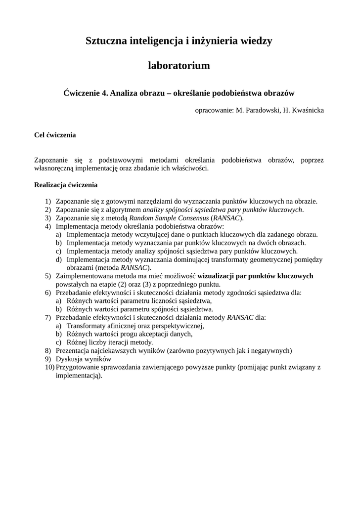 Sztuczna inteligencja i inżynieria wiedzy laboratorium Ćwiczenie 4. Analiza obrazu – określanie podobieństwa obrazów opracowanie: M. Paradowski, H. Kwaśnicka Cel ćwiczenia Zapoznanie się z podstawowymi metodami określania podobieństwa obrazów, poprzez własnoręczną implementację oraz zbadanie ich właściwości. Realizacja ćwiczenia 1) 2) 3) 4) Zapoznanie się z gotowymi narzędziami do wyznaczania punktów kluczowych na obrazie. Zapoznanie się z algorytmem analizy spójności sąsiedztwa pary punktów kluczowych. Zapoznanie się z metodą Random Sample Consensus (RANSAC). Implementacja metody określania podobieństwa obrazów: a) Implementacja metody wczytującej dane o punktach kluczowych dla zadanego obrazu. b) Implementacja metody wyznaczania par punktów kluczowych na dwóch obrazach. c) Implementacja metody analizy spójności sąsiedztwa pary punktów kluczowych. d) Implementacja metody wyznaczania dominującej transformaty geometrycznej pomiędzy obrazami (metoda RANSAC). 5) Zaimplementowana metoda ma mieć możliwość wizualizacji par punktów kluczowych powstałych na etapie (2) oraz (3) z poprzedniego punktu. 6) Przebadanie efektywności i skuteczności działania metody zgodności sąsiedztwa dla: a) Różnych wartości parametru liczności sąsiedztwa, b) Różnych wartości parametru spójności sąsiedztwa. 7) Przebadanie efektywności i skuteczności działania metody RANSAC dla: a) Transformaty afinicznej oraz perspektywicznej, b) Różnych wartości progu akceptacji danych, c) Różnej liczby iteracji metody. 8) Prezentacja najciekawszych wyników (zarówno pozytywnych jak i negatywnych) 9) Dyskusja wyników 10) Przygotowanie sprawozdania zawierającego powyższe punkty (pomijając punkt związany z implementacją). Ogólny schemat metody z wykorzystaniem analizy zgodności sąsiedztwa WEJŚCIE: Obrazy I oraz J 1. Wyznacz punkty kluczowe dla obrazów I i J. 2. Dla każdego punktu kluczowego na obrazach I i J wyznacz jego sąsiedztwo. 3. Wyznacz pary punktów kluczowych metodą wzajemnego najbliższego sąsiada. 4. Zweryfikuj wszystkie pary punktów kluczowych przy użyciu metody analizy spójności sąsiedztwa, odrzuć pary punktów niespełniające kryterium spójności. WYJŚCIE: Zbiór spójnych par punktów kluczowych. Ogólny schemat metody z wykorzystaniem RANSAC WEJŚCIE: Obrazy I oraz J 5. Wyznacz punkty kluczowe dla obrazów I i J 6. Wyznacz pary punktów kluczowych metodą wzajemnego najbliższego sąsiada 7. Wyznacz dominujące przekształcenie geometryczne na znalezionych parach punktów kluczowych przy użyciu metody RANSAC 8. Zweryfikuj, które pary punktów kluczowych pasują do znalezionego przekształcenia geometrycznego WYJŚCIE: Zbiór par punktów kluczowych pasujący do przekształcenia geometrycznego. Gotowe narzędzia do wyznaczania punktów kluczowych na obrazie Punkty kluczowe (określane również terminem regiony kluczowe) opisują lokalną charakterystykę wizualną danego obrazu. Mają one najczęściej postać elips lub okręgów. Każdy punkt kluczowy opisany jest pojedynczym wektorem cech wyznaczonym dla obszaru obrazu, który ten punkt obejmuje. W Internecie dostępne jest bardzo wiele narzędzi do wyznaczania różnego rodzaju punktów kluczowych na obrazie. W przypadku tego ćwiczenia najbardziej interesujące są punkty kluczowe wykryte detektorem Harris-Affine oraz opisane deskryptorem SIFT. Gotowe narzędzie do wyznaczania tego typu punktów kluczowych można znaleźć pod adresem: http://www.robots.ox.ac.uk/~vgg/research/affine/det_eval_files/extract_features2.tar.gz Wyznaczenie punktów kluczowych na obrazie „obraz.png” uzyskujemy poprzez wywołanie następującego polecenia (Linux): ./extract_features_32bit.ln -haraff -sift -i obraz.png -DE Na stronie WWW podanej w spisie literatury dostępna jest również wersja aplikacji pod Windows. Jej uruchomienie wymaga jednak pobrania dodatkowych bibliotek Cygwin. Należy zwrócić jednak uwagę na fakt, iż wskazana aplikacja to najnowsza wersja zalecanego detektora punktów kluczowych. W wyniku tego wywołania otrzymujemy plik „obraz.png.haraff.sift” zawierający wykryte punkty kluczowe. Parametr -DE jest opcjonalny i odpowiada za rysowanie wyznaczonych punktów kluczowych. Wyznaczone punkty kluczowe mają postać eliptyczną. Przykłady wyznaczonych punktów kluczowych przedstawione zostały na poniższych obrazach: Pliki *.haraff.sift mają następującą postać: [liczba cech dla każdego punktu kluczowego, zawsze 128 dla .haraff.sift] [liczba punktów kluczowych] [współrzędna x] [współrzędna y] [param A] [param B] [param C] [cecha 1] [cecha 2] ... [cecha 128] [współrzędna x] [współrzędna y] [param A] [param B] [param C] [cecha 1] [cecha 2] ... [cecha 128] ... [współrzędna x] [współrzędna y] [param A] [param B] [param C] [cecha 1] [cecha 2] ... [cecha 128] Parametry „współrzędna x” oraz „współrzędna y” określają współrzędne środka punktu kluczowego (elipsy) na obrazie. Dla uproszczenia doboru parametrów metody współrzędne można znormalizować do przedziału (0, 1). Parametry „A”, „B” oraz „C” określają kształt punktu kluczowego (elipsy) i są w naszym przypadku pomijalne. Parametry „cecha n” stanowią reprezentację wizualną danego punktu kluczowego i służą do wyznaczania par punktów kluczowych. Wyznaczanie par punktów kluczowych Do wyznaczania par punktów kluczowych zastosować należy algorytm wzajemnego najbliższego sąsiada. Dla każdego punktu kluczowego na obrazie A wyznaczany jest jego najbliższy sąsiad (w sensie reprezentacji wizualnej punktów kluczowych – a więc wszystkie wartości „cecha n”) na obrazie B. Następnie dla każdego punktu na obrazie B wyznaczamy najbliższego sąsiada (również w sensie wizualnym) na obrazie A. Para punktów kluczowych jest generowana tylko wtedy, gdy punkt A wskazuje na punkt B oraz punkt B wskazuje na punkt A (wzajemność). Przykład