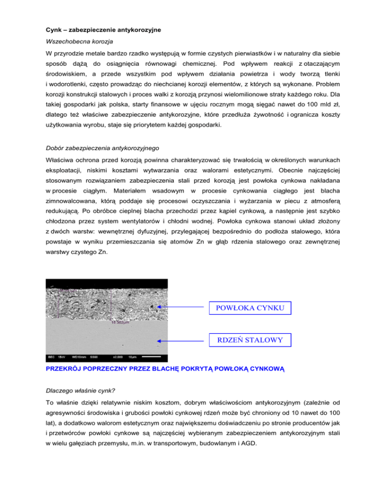 Cynk – zabezpieczenie antykorozyjne Wszechobecna korozja W przyrodzie metale bardzo rzadko występują w formie czystych pierwiastków i w naturalny dla siebie sposób dążą do osiągnięcia równowagi chemicznej. Pod wpływem reakcji z otaczającym środowiskiem, a przede wszystkim pod wpływem działania powietrza i wody tworzą tlenki i wodorotlenki, często prowadząc do niechcianej korozji elementów, z których są wykonane. Problem korozji konstrukcji stalowych i proces walki z korozją przynosi wielomilionowe straty każdego roku. Dla takiej gospodarki jak polska, starty finansowe w ujęciu rocznym mogą sięgać nawet do 100 mld zł, dlatego też właściwe zabezpieczenie antykorozyjne, które przedłuża żywotność i ogranicza koszty użytkowania wyrobu, staje się priorytetem każdej gospodarki. Dobór zabezpieczenia antykorozyjnego Właściwa ochrona przed korozją powinna charakteryzować się trwałością w określonych warunkach eksploatacji, niskimi kosztami wytwarzania oraz walorami estetycznymi. Obecnie najczęściej stosowanym rozwiązaniem zabezpieczenia stali przed korozją jest powłoka cynkowa nakładana w procesie ciągłym. Materiałem wsadowym w procesie cynkowania ciągłego jest blacha zimnowalcowana, którą poddaje się procesowi oczyszczania i wyżarzania w piecu z atmosferą redukującą. Po obróbce cieplnej blacha przechodzi przez kąpiel cynkową, a następnie jest szybko chłodzona przez system wentylatorów i chłodni wodnej. Powłoka cynkowa stanowi układ złożony z dwóch warstw: wewnętrznej dyfuzyjnej, przylegającej bezpośrednio do podłoża stalowego, która powstaje w wyniku przemieszczania się atomów Zn w głąb rdzenia stalowego oraz zewnętrznej warstwy czystego Zn. POWŁOKA CYNKU RDZEŃ STALOWY PRZEKRÓJ POPRZECZNY PRZEZ BLACHĘ POKRYTĄ POWŁOKĄ CYNKOWĄ Dlaczego właśnie cynk? To właśnie dzięki relatywnie niskim kosztom, dobrym właściwościom antykorozyjnym (zależnie od agresywności środowiska i grubości powłoki cynkowej rdzeń może być chroniony od 10 nawet do 100 lat), a dodatkowo walorom estetycznym oraz największemu doświadczeniu po stronie producentów jak i przetwórców powłoki cynkowe są najczęściej wybieranym zabezpieczeniem antykorozyjnym stali w wielu gałęziach przemysłu, m.in. w transportowym, budowlanym i AGD. Jak chroni powłoka cynkowa? Cynk posiada niższy potencjał elektrochemiczny niż żelazo, co oznacza, że pierwsza koroduje powłoka cynku, a dopiero po jej zużyciu pojawia się korozja żelaza. Dzięki połączeniu żelaza z cynkiem w jedno ogniwo w razie pojawienia się rysy lub na krawędzi cięcia tworzy się ogniwo, w którym katodą jest żelazo zaś anodą cynk. W obecności wilgoci do roztworu przechodzą jony cynku, a nie jony żelaza, chroniąc tym samym rdzeń. Nakładana powłoka musi też mieć stosunkowo niską temperaturę topnienia, która nie wpływa na właściwości fizyko-mechaniczne materiału pokrywanego, a cynk z z temperaturą topnienia 419°C ten warunek spełnia. Powłoka cynk owa ma też jeszcze jedną zaletę: pod wpływem składników atmosfery (tlen, dwutlenek węgla, woda) tworzy cienką, powierzchniową warstwę nierozpuszczalnego w wodzie węglanu cynku, zwaną potocznie patyną, który tworzy na powierzchni tzw. ochronę barierową. Raz prawidłowo wytworzona patyna, skutecznie zapobiega dalszym reakcjom cynku, hamując jego korozję. Czas jej powstawania zależy od warunków atmosferycznych i trwa od sześciu miesięcy do dwóch lat. Malowanie cynkowanych konstrukcji zaleca się dopiero po ok. 2 latach, gdy warstwa patyny jest prawidłowo utworzona. Polska myśl technologiczna Niewielu z nas wie, że pierwszą na świecie linię do ciągłego cynkowania blach ze stali niskowęglowej zaprojektował i uruchomił nasz rodak - Tadeusz Sendzimir. W roku 1933 w Katowicach Kostuchnie uruchomił on pierwszy na świecie zakład, który na skalę przemysłową umożliwiał ciągłe cynkowanie blach i drutów w sposób, który nie powodował zanieczyszczenia środowiska. Proces Sendzimira zrewolucjonizował metody walki z korozją i doczekał się szeregu wdrożeń i ulepszeń w wielu krajach. Najnowsze technologie wykorzystują wieloskładnikowe stopy, gdzie do kąpieli cynkowej dodaje się aluminium i magnezu, stosowanej w przypadku powłoki Magnelis®, znacznie wydłużając żywotność chronionych konstrukcji. KRĄG OCYNKOWANY OCZEKUJĄCY NA ZAPAKOWANIE