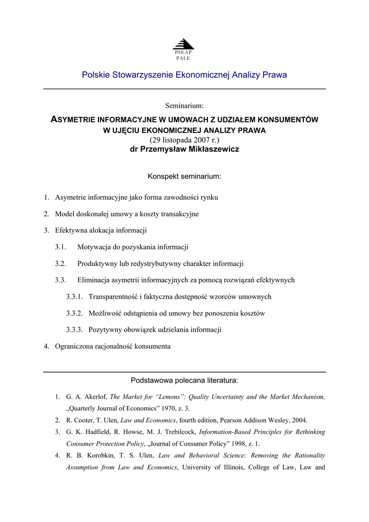 PSEAP PALE Polskie Stowarzyszenie Ekonomicznej Analizy Prawa Seminarium: ASYMETRIE INFORMACYJNE W UMOWACH Z UDZIAŁEM KONSUMENTÓW W UJĘCIU EKONOMICZNEJ ANALIZY PRAWA (29 listopada 2007 r.) dr Przemysław Mikłaszewicz Konspekt seminarium: 1. Asymetrie informacyjne jako forma zawodności rynku 2. Model doskonałej umowy a koszty transakcyjne 3. Efektywna alokacja informacji 3.1. Motywacja do pozyskania informacji 3.2. Produktywny lub redystrybutywny charakter informacji 3.3. Eliminacja asymetrii informacyjnych za pomocą rozwiązań efektywnych 3.3.1. Transparentność i faktyczna dostępność wzorców umownych 3.3.2. Możliwość odstąpienia od umowy bez ponoszenia kosztów 3.3.3. Pozytywny obowiązek udzielania informacji 4. Ograniczona racjonalność konsumenta Podstawowa polecana literatura: 1. G. A. Akerlof, The Market for “Lemons”: Quality Uncertainty and the Market Mechanism, „Quarterly Journal of Economics” 1970, z. 3. 2. R. Cooter, T. Ulen, Law and Economics, fourth edition, Pearson Addison Wesley, 2004. 3. G. K. Hadfield, R. Howse, M. J. Trebilcock, Information-Based Principles for Rethinking Consumer Protection Policy, „Journal of Consumer Policy” 1998, z. 1. 4. R. B. Korobkin, T. S. Ulen, Law and Behavioral Science: Removing the Rationality Assumption from Law and Economics, University of Illinois, College of Law, Law and Economics Research Papers Series. Research Paper No. 00-01, September 2000, http://ssrn.com/abstract=229937. 5. R. A. Posner, Economic Analysis of Law, 2d edition, Little, Brown and Company, Boston – Toronto 1977. 6. P. Rekaiti, R. Van den Bergh, Cooling-Off Periods in the Consumer Laws of the EC Member States. A Comparative Law and Economics Approach, „Journal of Consumer Policy” 2000. 7. R. T. Stroiński, Wprowadzenie do analizy ekonomicznej prawa (law and economics), (w:) Ekonomia dla prawników i nie tylko, red. M. Bednarski, J. Wilkin, Wydawnictwo Prawnicze LexisNexis, Warszawa 2003.