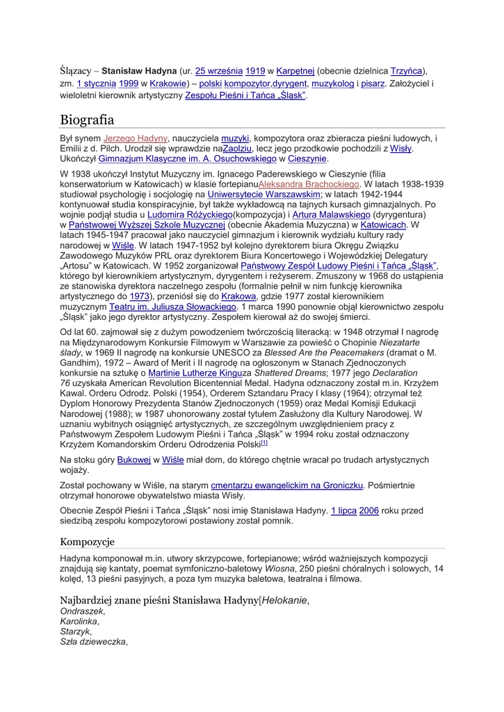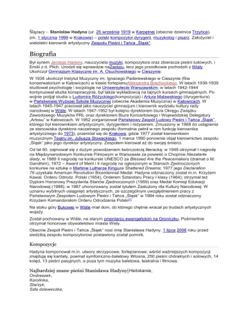 Ślązacy – Stanisław Hadyna (ur. 25 września 1919 w Karpętnej (obecnie dzielnica Trzyńca), zm. 1 stycznia 1999 w Krakowie) – polski kompozytor,dyrygent, muzykolog i pisarz. Założyciel i wieloletni kierownik artystyczny Zespołu Pieśni i Tańca „Śląsk”. Biografia Był synem Jerzego Hadyny, nauczyciela muzyki, kompozytora oraz zbieracza pieśni ludowych, i Emilii z d. Pilch. Urodził się wprawdzie naZaolziu, lecz jego przodkowie pochodzili z Wisły. Ukończył Gimnazjum Klasyczne im. A. Osuchowskiego w Cieszynie. W 1938 ukończył Instytut Muzyczny im. Ignacego Paderewskiego w Cieszynie (filia konserwatorium w Katowicach) w klasie fortepianuAleksandra Brachockiego. W latach 1938-1939 studiował psychologię i socjologię na Uniwersytecie Warszawskim; w latach 1942-1944 kontynuował studia konspiracyjnie, był także wykładowcą na tajnych kursach gimnazjalnych. Po wojnie podjął studia u Ludomira Różyckiego(kompozycja) i Artura Malawskiego (dyrygentura) w Państwowej Wyższej Szkole Muzycznej (obecnie Akademia Muzyczna) w Katowicach. W latach 1945-1947 pracował jako nauczyciel gimnazjum i kierownik wydziału kultury rady narodowej w Wiśle. W latach 1947-1952 był kolejno dyrektorem biura Okręgu Związku Zawodowego Muzyków PRL oraz dyrektorem Biura Koncertowego i Wojewódzkiej Delegatury „Artosu” w Katowicach. W 1952 zorganizował Państwowy Zespół Ludowy Pieśni i Tańca „Śląsk”, którego był kierownikiem artystycznym, dyrygentem i reżyserem. Zmuszony w 1968 do ustąpienia ze stanowiska dyrektora naczelnego zespołu (formalnie pełnił w nim funkcję kierownika artystycznego do 1973), przeniósł się do Krakowa, gdzie 1977 został kierownikiem muzycznym Teatru im. Juliusza Słowackiego. 1 marca 1990 ponownie objął kierownictwo zespołu „Śląsk” jako jego dyrektor artystyczny. Zespołem kierował aż do swojej śmierci. Od lat 60. zajmował się z dużym powodzeniem twórczością literacką: w 1948 otrzymał I nagrodę na Międzynarodowym Konkursie Filmowym w Warszawie za powieść o Chopinie Niezatarte ślady, w 1969 II nagrodę na konkursie UNESCO za Blessed Are the Peacemakers (dramat o M. Gandhim), 1972 – Award of Merit i II nagrodę na ogłoszonym w Stanach Zjednoczonych konkursie na sztukę o Martinie Lutherze Kinguza Shattered Dreams; 1977 jego Declaration 76 uzyskała American Revolution Bicentennial Medal. Hadyna odznaczony został m.in. Krzyżem Kawal. Orderu Odrodz. Polski (1954), Orderem Sztandaru Pracy I klasy (1964); otrzymał też Dyplom Honorowy Prezydenta Stanów Zjednoczonych (1959) oraz Medal Komisji Edukacji Narodowej (1988); w 1987 uhonorowany został tytułem Zasłużony dla Kultury Narodowej. W uznaniu wybitnych osiągnięć artystycznych, ze szczególnym uwzględnieniem pracy z Państwowym Zespołem Ludowym Pieśni i Tańca „Śląsk” w 1994 roku został odznaczony Krzyżem Komandorskim Orderu Odrodzenia Polski[1] Na stoku góry Bukowej w Wiśle miał dom, do którego chętnie wracał po trudach artystycznych wojaży. Został pochowany w Wiśle, na starym cmentarzu ewangelickim na Groniczku. Pośmiertnie otrzymał honorowe obywatelstwo miasta Wisły. Obecnie Zespół Pieśni i Tańca „Śląsk” nosi imię Stanisława Hadyny. 1 lipca 2006 roku przed siedzibą zespołu kompozytorowi postawiony został pomnik. Kompozycje Hadyna komponował m.in. utwory skrzypcowe, fortepianowe; wśród ważniejszych kompozycji znajdują się kantaty, poemat symfoniczno-baletowy Wiosna, 250 pieśni chóralnych i solowych, 14 kolęd, 13 pieśni pasyjnych, a poza tym muzyka baletowa, teatralna i filmowa. Najbardziej znane pieśni Stanisława Hadyny[Helokanie, Ondraszek, Karolinka, Starzyk, Szła dzieweczka, Hej tam w dolinie, Gdybym to ja miała. Dzieła literackie Niezatarte ślady („Śląsk”, 1960), powieść Na podbój kontynentu (Iskry, 1964), seria: „Naokoło świata”, zbiór reportaży W słońcu Hellady (PAX, 1968), zbiór reportaży Pod niebem Allacha („Śląsk”, 1969), zbiór reportaży Błogosławieni pokój czyniący („Blessed Are the Peacemakers”, 1969), dramat o życiu Mahatmy Gandhiego Zdruzgotane sny (1972), dramat o życiu Martina Luthera Kinga Droga do hymnu (PAX, 1976), literacko-naukowe studium o Mazurku Dąbrowskiego, Deklaracja 76 (1977), dramat z okazji 200. lecia Deklaracji niepodległości Stanów Zjednoczonych Gdzie niebo z ziemią graniczy (PAX, 1981), szkic literacko-filozoficzny W pogoni za wiosną („Śląsk” 1983, reedycja 2009), pamiętnik (kronika narodzin zespołu „Śląsk”) Dwa ognie” (PIW, 1988), powieść oparta na historii Rewolucji francuskiej O Ludomirze Różyckim (WBP Katowice, 1990), wspomnienia Przez okna czasu: jasnowidząca z Wisły (Inst. Ekologii i Zdrowia, Kraków 1993), biografia Agnieszki Pilchowej O czwartym Mędrcu ze Wschodu: opowieść (Koszęcin, 2008), opowiadanie Dramat o Gandhim „Blessed Are the Peacemakers” otrzymał II Nagrodę na Międzynarodowym Konkursie Teatralnym UNESCO (1969); inny dramat, „Zdruzgotane sny”, zdobył II nagrodę Międzynarodowego Biennale Teatralnego w USA (1972). Pełny tytuł debiutu literackiego Hadyny brzmi Niezatarte ślady: opowieść z życia Szopena nagrodzona na Międzynarodowym Konkursie Filmowym 1949 (m.in. na podstawie tej książki Aleksander Ford zrealizował w 1951 film Młodość Chopina). http://pl.wikipedia.org/wiki/Stanis%C5%82aw_Hadyna