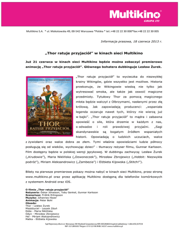 Multikino S.A. * ul. Mokotowska 49, 00-542 Warszawa *Polska * tel.:+48 22 22 30 000*fax:+48 22 22 30 005 Informacja prasowa, 18 czerwca 2013 r. „Thor ratuje przyjaciół” w kinach sieci Multikino Już 21 czerwca w kinach sieci Multikino będzie można zobaczyć premierowo animację „Thor ratuje przyjaciół”. Głównego bohatera dubbinguje Lesław Żurek. „Thor ratuje przyjaciół” to wycieczka do niezwykłej krainy Wikingów, gdzie wszystko jest możliwe. Historia przekonuje, że Wikingowie wiedzą nie tylko jak wytresować smoka, ale także jak oswoić magiczne przedmioty. Tytułowy Thor za pomocą magicznego młota będzie walczył z Olbrzymami, nasłanymi przez złą królową. Jak zapowiadają producenci: „wspaniała legenda oczaruje nawet tych, którzy nie wierzą już w bajki”. „Thor ratuje przyjaciół” to mądra i zabawna opowieść o sile, która drzemie w każdym z nas, o odwadze i skandynawskie historii. roli są Opowiadają prawdziwej bogatym o przyjaźni. źródłem ludzkich „Sagi wspaniałych uczuciach, walce z żywiołami oraz walce dobra ze złem. Tymi właśnie opowieściami ludzie północy posługują się od wieków, wychowując dzieci” - tłumaczy reżyser filmu, Gunnar Karlsson. Film dostępny będzie w polskiej wersji językowej. W dubbingu zachwycą: Lesław Żurek („Krudowie”), Maria Niklińska („Dzwoneczek”), Mirosław Zbrojewicz („Hobbit: Niezwykła podróż”), Miriam Aleksandrowicz („Zambezia”) i Elżbieta Kijowska („Stitch!”). Bilety na pierwsze premierowe pokazy można nabyć w kinach sieci Multikino, przez stronę www.multikino.pl oraz przez aplikację Multikino dostępną dla telefonów komórkowych z systemem Android oraz iOS. O filmie „Thor ratuje przyjaciół” Reżyseria: Óskar Jónasson, Toby Genkel, Gunnar Karlsson Scenariusz: Friðrik Erlingsson Muzyka: Johannes Hezer Animacja: Peter Bohl Obsada: Thor - Lesław Żurek Miażdżyciel - Leszek Zduń Edda - Maria Niklińska Odyn - Mirosław Zbrojewicz Hel - Miriam Aleksandrowicz Matka - Elżbieta Kijowska *** Informacje o spółce Multikino: Multikino jest pierwszym operatorem, który w 1998 roku uruchomił w Polsce kino wieloekranowe (multipleks). Od tego czasu Multikino wyznacza najwyższe standardy w budowie i prowadzeniu kin. Grupa prowadzi działalność w segmencie kinowym i dystrybucji filmów. Multikino jest operatorem 28 kin w 22 miastach Polski z łączną liczbą 231 ekranów i 50 340 miejscami. W sierpniu 2007 r. Multikino otworzyło wyjątkowe kino w centrum handlowym Złote Tarasy w Warszawie. Obiekt składa się z 8 nowoczesnych sal, w tym Sali Premierowej na 777 osób, wyposażonej w projektory cyfrowe Barco DP 4K, fenomenalny system dźwięku Martin Audio i największy w Europie ekran przystosowany do projekcji cyfrowej (prawie 300 m2). W sierpniu 2010 roku Grupa otworzyła pierwsze kino za granicą w Rydze (8 ekranów i 1620 miejsc), a we wrześniu w Wilnie (7 ekranów i 1547 miejsca). Multikino to więcej niż kino! To największe premiery filmowe oraz koncerty, maratony, transmisje sportowe, Opery HD, Kino na obcasach, Multibabykino i wiele więcej. Multikino to także oryginalna sieć kawiarni Cavablanca Cinema Cafe. Od lat Multikino jest partnerem najważniejszych festiwali filmowych w Polsce w tym Festiwalu Polskich Filmów Fabularnych w Gdyni, Camerimage i Warszawskiego Festiwalu Filmowego. Multikino jest w gronie światowych liderów kinowej cyfryzacji, dzięki wyposażeniu sal kinowych w projektory cyfrowe Dolby 3D Digital Cinema. Sieć z powodzeniem prezentuje w technologii 3D: filmy, koncerty, wydarzenia sportowe, opery oraz balet. Multikino jest liderem cyfryzacji w Europie czyli technologicznego i jakościowego przełomu w branży kinowej. Kontakt dla mediów: Natalia Kaleta, Specjalista ds. PR e-mail: [email protected] tel.: +48 519 520 984