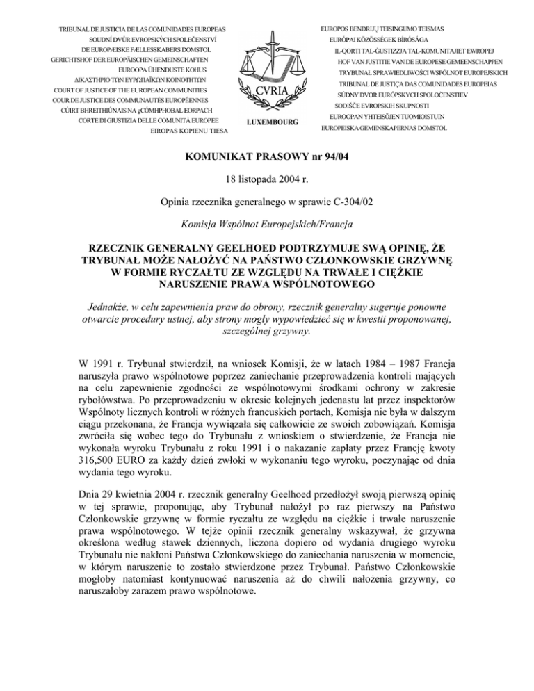 TRIBUNAL DE JUSTICIA DE LAS COMUNIDADES EUROPEAS SOUDNÍ DVŮR EVROPSKÝCH SPOLEČENSTVÍ EUROPOS BENDRIJŲ TEISINGUMO TEISMAS EURÓPAI KÖZÖSSÉGEK BÍRÓSÁGA DE EUROPÆISKE FÆLLESSKABERS DOMSTOL IL-QORTI TAL-ĠUSTIZZJA TAL-KOMUNITAJIET EWROPEJ GERICHTSHOF DER EUROPÄISCHEN GEMEINSCHAFTEN HOF VAN JUSTITIE VAN DE EUROPESE GEMEENSCHAPPEN EUROOPA ÜHENDUSTE KOHUS TRYBUNAŁ SPRAWIEDLIWOŚCI WSPÓLNOT EUROPEJSKICH ∆ΙΚΑΣΤΗΡΙΟ ΤΩΝ ΕΥΡΩΠΑΪΚΩΝ ΚΟΙΝΟΤΗΤΩΝ TRIBUNAL DE JUSTIÇA DAS COMUNIDADES EUROPEIAS COURT OF JUSTICE OF THE EUROPEAN COMMUNITIES SÚDNY DVOR EURÓPSKYCH SPOLOČENSTIEV COUR DE JUSTICE DES COMMUNAUTÉS EUROPÉENNES SODIŠČE EVROPSKIH SKUPNOSTI CÚIRT BHREITHIÚNAIS NA gCÓMHPHOBAL EORPACH EUROOPAN YHTEISÖJEN TUOMIOISTUIN CORTE DI GIUSTIZIA DELLE COMUNITÀ EUROPEE EIROPAS KOPIENU TIESA EUROPEISKA GEMENSKAPERNAS DOMSTOL KOMUNIKAT PRASOWY nr 94/04 18 listopada 2004 r. Opinia rzecznika generalnego w sprawie C-304/02 Komisja Wspólnot Europejskich/Francja RZECZNIK GENERALNY GEELHOED PODTRZYMUJE SWĄ OPINIĘ, ŻE TRYBUNAŁ MOŻE NAŁOŻYĆ NA PAŃSTWO CZŁONKOWSKIE GRZYWNĘ W FORMIE RYCZAŁTU ZE WZGLĘDU NA TRWAŁE I CIĘŻKIE NARUSZENIE PRAWA WSPÓLNOTOWEGO Jednakże, w celu zapewnienia praw do obrony, rzecznik generalny sugeruje ponowne otwarcie procedury ustnej, aby strony mogły wypowiedzieć się w kwestii proponowanej, szczególnej grzywny. W 1991 r. Trybunał stwierdził, na wniosek Komisji, że w latach 1984 – 1987 Francja naruszyła prawo wspólnotowe poprzez zaniechanie przeprowadzenia kontroli mających na celu zapewnienie zgodności ze wspólnotowymi środkami ochrony w zakresie rybołówstwa. Po przeprowadzeniu w okresie kolejnych jedenastu lat przez inspektorów Wspólnoty licznych kontroli w różnych francuskich portach, Komisja nie była w dalszym ciągu przekonana, że Francja wywiązała się całkowicie ze swoich zobowiązań. Komisja zwróciła się wobec tego do Trybunału z wnioskiem o stwierdzenie, że Francja nie wykonała wyroku Trybunału z roku 1991 i o nakazanie zapłaty przez Francję kwoty 316,500 EURO za każdy dzień zwłoki w wykonaniu tego wyroku, poczynając od dnia wydania tego wyroku. Dnia 29 kwietnia 2004 r. rzecznik generalny Geelhoed przedłożył swoją pierwszą opinię w tej sprawie, proponując, aby Trybunał nałożył po raz pierwszy na Państwo Członkowskie grzywnę w formie ryczałtu ze względu na ciężkie i trwałe naruszenie prawa wspólnotowego. W tejże opinii rzecznik generalny wskazywał, że grzywna określona według stawek dziennych, liczona dopiero od wydania drugiego wyroku Trybunału nie nakłoni Państwa Członkowskiego do zaniechania naruszenia w momencie, w którym naruszenie to zostało stwierdzone przez Trybunał. Państwo Członkowskie mogłoby natomiast kontynuować naruszenia aż do chwili nałożenia grzywny, co naruszałoby zarazem prawo wspólnotowe. W związku z tym, że w opinii zwrócono uwagę na nowe zagadnienia dotyczące wykładni art. 228 Traktatu, które nie były poruszane w trakcie postępowania, Trybunał postanowił o ponownym otwarciu procedury ustnej w celu wysłuchania poglądów stron i innych Państw Członkowskich w kwestii, czy Trybunał może nałożyć ryczałt lub jednocześnie ryczałt i okresową karę pieniężną, jeżeli Komisja wniosła do Trybunału jedynie o nałożenie grzywny obliczonej według stawek dziennych. W dniu dzisiejszym rzecznik generalny Geelhoed przedłożył swą drugą opinię w przedmiotowej sprawie. Na wstępie rzecznik generalny podkreśla, że celem regulacji art. 228 jest zapewnienie przestrzegania prawa wspólnotowego przez Państwo Członkowskie. Na tym tle, sankcje przewidziane w tym artykule mają dwojaki charakter. Po pierwsze, powinny one posiadać zniechęcający, prewencyjny skutek polegający na ekonomicznej nieopłacalności naruszenia prawa wspólnotowego przez Państwo Członkowskie. Po drugie, posiadają one specyficzny skutek przekonywujący, polegający na nałożeniu odpowiedniego ciężaru na Państwo Członkowskie w celu zapewnienia przestrzegania prawa wspólnotowego po stwierdzeniu naruszenia przez Trybunał. Ponadto, rzecznik generalny podkreśla, że sankcje te są charakterystyczne dla porządku prawnego Wspólnoty i nie mogą być porównywane do instytucji sankcji istniejących na szczeblu krajowym. W przedmiocie kompetencji Trybunału do odstąpienia od proponowanej kary, o którą wniosła Komisja i nałożenia ryczałtu, rzecznik generalny Geelhoed po pierwsze wskazuje, że w poprzednich wyrokach Trybunał jasno stwierdził, że wnioski Komisji nie mogą wiązać Trybunału, co wynika bezpośrednio z brzmienia i systematyki art. 228. Ponadto, jako że Państwo Członkowskie ma zostać ukarane za brak wykonania wyroku Trybunału, rzecznik generalny uważa, że to Trybunał jest najbardziej właściwy do oceny zakresu przestrzegania prawa wspólnotowego, jak i wagi kontynuowanego naruszenia. Konieczność nałożenia sankcji może być określona jedynie w świetle ustaleń Trybunału w jego wyroku i orzeczenie tego rodzaju nie może zależeć od opinii Komisji. Rzecznik generalny wskazuje, że Państwa Członkowskie podniosły trzy potencjalne ograniczenia kompetencji Trybunału w zakresie nakładania sankcji: zasadę równego traktowania, zasadę pewności prawa oraz prawo Państwa Członkowskiego do obrony. W odniesieniu do zasady równego traktowania, rzecznik generalny Geelhoed stwierdza, że stan faktyczny przedmiotowej sprawy nie jest porównywalny do poprzednich dwóch spraw, w których Trybunał nałożył grzywnę. Uważa on, że naruszenie prawa popełnione przez Francję jest poważne i wywołało konsekwencje nie tylko we Francji, ale niekorzystnie wpłynęło również na inne Państwa Członkowskie i rybaków z tych Państw. Nałożenie sankcji różnego rodzaju jest wobec tego uzasadnione odmiennym charakterem i skutkami naruszenia. Jeśli chodzi o zasadę pewności prawa, rzecznik