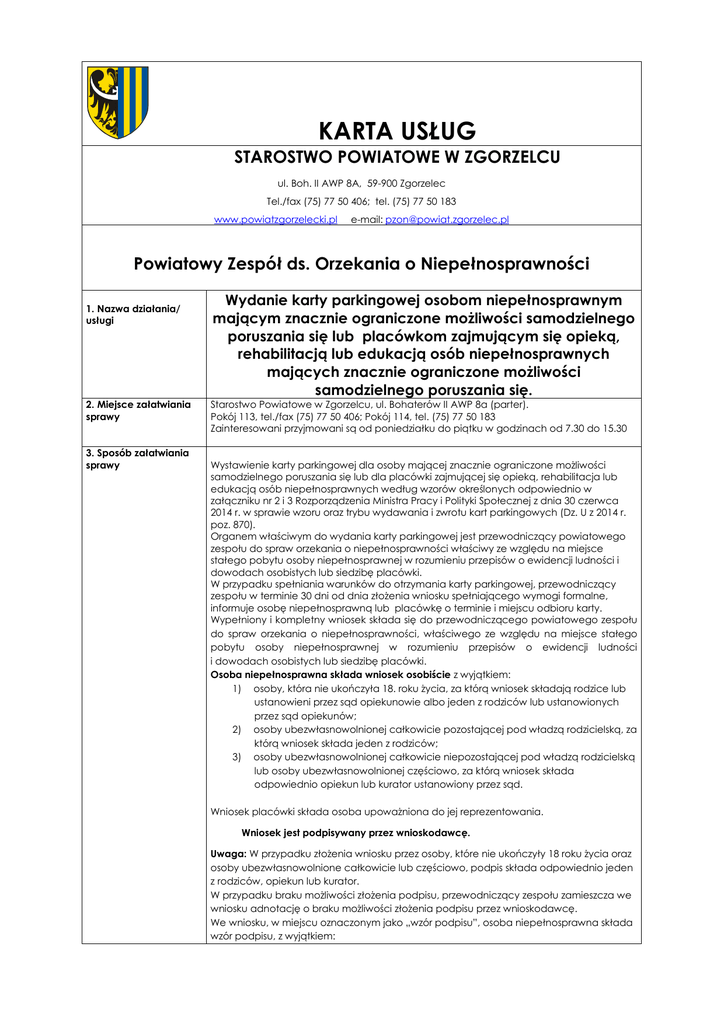KARTA USŁUG STAROSTWO POWIATOWE W ZGORZELCU ul. Boh. II AWP 8A, 59-900 Zgorzelec Tel./fax (75) 77 50 406; tel. (75) 77 50 183 www.powiatzgorzelecki.pl e-mail: [email protected] Powiatowy Zespół ds. Orzekania o Niepełnosprawności 1. Nazwa działania/ usługi 2. Miejsce załatwiania sprawy 3. Sposób załatwiania sprawy Wydanie karty parkingowej osobom niepełnosprawnym mającym znacznie ograniczone możliwości samodzielnego poruszania się lub placówkom zajmującym się opieką, rehabilitacją lub edukacją osób niepełnosprawnych mających znacznie ograniczone możliwości samodzielnego poruszania się. Starostwo Powiatowe w Zgorzelcu, ul. Bohaterów II AWP 8a (parter). Pokój 113, tel./fax (75) 77 50 406; Pokój 114, tel. (75) 77 50 183 Zainteresowani przyjmowani są od poniedziałku do piątku w godzinach od 7.30 do 15.30 Wystawienie karty parkingowej dla osoby mającej znacznie ograniczone możliwości samodzielnego poruszania się lub dla placówki zajmującej się opieką, rehabilitacja lub edukacją osób niepełnosprawnych według wzorów określonych odpowiednio w załączniku nr 2 i 3 Rozporządzenia Ministra Pracy i Polityki Społecznej z dnia 30 czerwca 2014 r. w sprawie wzoru oraz trybu wydawania i zwrotu kart parkingowych (Dz. U z 2014 r. poz. 870). Organem właściwym do wydania karty parkingowej jest przewodniczący powiatowego zespołu do spraw orzekania o niepełnosprawności właściwy ze względu na miejsce stałego pobytu osoby niepełnosprawnej w rozumieniu przepisów o ewidencji ludności i dowodach osobistych lub siedzibę placówki. W przypadku spełniania warunków do otrzymania karty parkingowej, przewodniczący zespołu w terminie 30 dni od dnia złożenia wniosku spełniającego wymogi formalne, informuje osobę niepełnosprawną lub placówkę o terminie i miejscu odbioru karty. Wypełniony i kompletny wniosek składa się do przewodniczącego powiatowego zespołu do spraw orzekania o niepełnosprawności, właściwego ze względu na miejsce stałego pobytu osoby niepełnosprawnej w rozumieniu przepisów o ewidencji ludności i dowodach osobistych lub siedzibę placówki. Osoba niepełnosprawna składa wniosek osobiście z wyjątkiem: 1) osoby, która nie ukończyła 18. roku życia, za którą wniosek składają rodzice lub ustanowieni przez sąd opiekunowie albo jeden z rodziców lub ustanowionych przez sąd opiekunów; 2) osoby ubezwłasnowolnionej całkowicie pozostającej pod władzą rodzicielską, za którą wniosek składa jeden z rodziców; 3) osoby ubezwłasnowolnionej całkowicie niepozostającej pod władzą rodzicielską lub osoby ubezwłasnowolnionej częściowo, za którą wniosek składa odpowiednio opiekun lub kurator ustanowiony przez sąd. Wniosek placówki składa osoba upoważniona do jej reprezentowania. Wniosek jest podpisywany przez wnioskodawcę. Uwaga: W przypadku złożenia wniosku przez osoby, które nie ukończyły 18 roku życia oraz osoby ubezwłasnowolnione całkowicie lub częściowo, podpis składa odpowiednio jeden z rodziców, opiekun lub kurator. W przypadku braku możliwości złożenia podpisu, przewodniczący zespołu zamieszcza we wniosku adnotację o braku możliwości złożenia podpisu przez wnioskodawcę. We wniosku, w miejscu oznaczonym jako „wzór podpisu”, osoba niepełnosprawna składa wzór podpisu, z wyjątkiem: 1) osoby, która nie ukończyła 18. roku życia; 2) osoby ubezwłasnowolnionej całkowicie lub częściowo; 3) osoby, która nie ma możliwości złożenia podpisu. W przypadku osoby która nie ukończyła 18 roku życia, osoby ubezwłasnowolnionej całkowicie lub częściowo, a także osoby, która nie ma możliwości złożenia podpisu oraz wniosku placówki miejsce oznaczone we wniosku jako „wzór podpisu” pozostawia się niewypełnione. UWAGA! Kartę parkingową osoba niepełnosprawna odbiera osobiście, po okazaniu dokumentu potwierdzającego tożsamość albo przez ustanowionego pełnomocnika po okazaniu przez niego dokumentu potwierdzającego jego tożsamość oraz pisemnego pełnomocnictwa do odbioru karty. Kartę parkingową wydaną: 1) osobie, która nie ukończyła 18. roku życia, odbiera jeden z rodziców lub ustanowionych przez sąd opiekunów, 2) osobie ubezwłasnowolnionej całkowicie pozostającej pod władzą rodzicielską, odbiera jeden z rodziców, 3) osobie ubezwłasnowolnionej całkowicie niepozostającej pod władzą rodzicielską lub osobie ubezwłasnowolnionej częściowo, odbiera odpowiednio opiekun lub kurator ustanowiony przez sąd – po okazaniu dokumentu potwierdzającego tożsamość i oświadczeniu o prawie do sprawowania odpowiednio władzy rodzicielskiej, opieki lub kurateli. Osoba odbierająca kartę parkingową potwierdza jej odbiór. W przypadku braku możliwości złożenia podpisu, przewodniczący zespołu zamieszcza we wniosku adnotację o braku możliwości złożenia podpisu. Osoba upoważniona do reprezentowania placówki odbiera kartę parkingową osobiście po okazaniu dokumentu potwierdzającego tożsamość i oświadczeniu o posiadaniu upoważnienia do reprezentowania placówki oraz potwierdza odbiór karty parkingowej. W przypadku braku możliwości złożenia podpisu, przewodniczący zespołu zamieszcza we wniosku adnotację o braku możliwości złożenia podpisu. 4. Wymagane dokumenty, załączniki (wymagane ksero/ oryginał) 1. 2. 3. 4. 5. Opłaty 6. Termin załatwiania sprawy wniosek o wydanie karty parkingowej według wzoru zgodnego z załącznikiem nr 1 Rozporządzenia Ministra Pracy i Polityki Społecznej z dnia 25 czerwca 2014 r. w sprawie wzoru oraz trybu wydawania i zwrotu kart parkingowych (Dz. U z 2014 r. poz. 870)dostępnego w sekretariacie zespołu (pok. 113) lub na stronie internetowej Starostwa Powiatowego w Zgorzelcu. Oryginał (do wglądu) ważnego prawomocnego orzeczenia: - o niepełnosprawności, - o stopniu niepełnosprawności, - o wskazaniach do ulg i uprawnień wydanego na podstawie art. 5a ustawy z dnia 27 sier