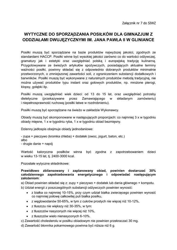 Załącznik nr 7 do SIWZ WYTYCZNE DO SPORZĄDZANIA POSIŁKÓW DLA GIMNAZJUM Z ODDZIAŁAMI DWUJĘZYCZNYMI IM. JANA PAWŁA II W GLINIANCE Posiłki muszą być sporządzane na bazie produktów najwyższej jakości, zgodnych ze standardami HACCP. Posiłki winne być wysokiej jakości zarówno co do wartości odżywczej, gramatury jak i estetyki oraz uwzględniać polską i europejską tradycję kulinarną. Przygotowywane ze świeżych artykułów spożywczych, posiadających aktualne terminy ważności posiłki, powinny składać się z odpowiednio dobranych produktów minimalnie przetworzonych, o zmniejszonej zawartości soli, z ograniczeniem substancji dodatkowych i barwników. Posiłki muszą być wykonywane z naturalnych produktów metodą tradycyjną, nie można używać produktów typu instant oraz gotowych produktów, np. mrożone pierogi, klopsy, gołąbki itp. Posiłki muszą uwzględniać wiek dzieci: od 13 do 15 lat, oraz uwzględniać potrzeby dietetyczne (przekazywane przez Zamawiającego w składanym zamówieniu) i niepełnosprawność ruchową (posiłki łatwe w rozdrobnieniu). Posiłki muszą być sporządzane na świeżo w zakładzie Wykonawcy. Obiady muszą być skomponowane w następujących proporcjach: co najmniej 3 x w tygodniu obiady mięsne, 1 x w tygodniu ryba, 1 x w tygodniu obiad bezmięsny. Dzienny jadłospis obejmuje obiady jednodaniowe: - zupa + pieczywo (kromka chleba) + dodatek (owoc, jogurt, baton, etc.) albo - drugie danie + napój Wartość kaloryczna posiłków winna w wieku 13-15 lat, tj. 2400-3000 kcal. być zgodna z zapotrzebowaniem dzieci Pozostałe wytyczne składnikowe: Prawidłowo zbilansowany i zaplanowany obiad, powinien dostarczać 30% całodziennego zapotrzebowania energetycznego i odpowiadać następującym założeniom: a) Obiad powinien składać się z: zupy + pieczywo + dodatek lub dania głównego + kompotu. b) Udział energii z poszczególnych substancji odżywczych powinien wynosić: z białka co najmniej 10-15%, przy czym udział białka zwierzęcego powinien wynosić co najmniej połowę całkowitej puli białka posiłku, z węglowodanów 50-65%, w tym z cukrów prostych nie więcej niż 10-12%, z tłuszczu nie większy niż 30-35%, w tym: z tłuszczów nasyconych nie więcej niż 10%, z tłuszczów wielo nienasyconych 6-10%. c) Zawartość cholesterolu w posiłku obiadowym nie powinien przekraczać 30 mg. d) Zawartość błonnika pokarmowego powinna być niższa niż 6 g. e) Zawartość soli kuchennej nie powinna przekraczać 1,5-2 g. f) Witaminy i składniki mineralne – co najmniej 30% zaleceń na przestrzeni dekady. Zasady stosowania produktów skrobiowych: Potrawy będące źródłem skrobi stanowią ważny składnik całodziennej diety. Zgodnie z zaleceniami żywienia zawartość węglowodanów w diecie powinna zapewniać 50-65% zapotrzebowania energetycznego. Produkty skrobiowe powinny stanowić około 1/3 posiłku. Potrawy te można sporządzać z następujących surowców: ziemniaki, najlepiej gotowane, także w „mundurkach” lub pieczone, kasze: gryczana, jęczmienna, jaglana, kukurydziana, płatki zbożowe: owsiane, jęczmienne, pszenne (najlepiej nieekstrudowane), ryż, makarony, pieczywo najlepiej z pełnego przemiału. Zasady stosowania produktów białkowych: Potrawy wysokobiałkowe powinny stanowić niewielką część posiłków. Należy pamiętać, że białko z diety powinno dostarczać ok. 10-15% energii. Co najmniej połowa do ¾ białka diety powinno stanowić białko pochodzenia zwierzęcego. Potrawy będące źródłem białka można sporządzić z: a) Mięsa, najlepiej drobiu, cielęciny, chudej wołowiny i wieprzowiny. W celu obniżenia w potrawach z mięsa zawartości tłuszczu należy: usuwać widoczny tłuszcz, wybierać metody obróbki cieplnej bez dodatku tłuszczu lub z możliwie jego najmniejszą ilością: gotowanie, duszenie bez tłuszczu lub z niewielką ilością tłuszczu, pieczenie, grillowanie, zapiekanie, z drobiu usuwać skórę, odsączać tłuszcz, zwłaszcza z mielonych i siekanych kotletów, po obróbce termicznej (np. na papierowych ręcznikach), część mięsa zastępować nasionami roślin strączkowych. Potrawy z mięsa należy podawać z warzywami i produktami skrobiowymi. b) Mleka i produktów mlecznych, które powinny stanowić składnik pożywienia każdego dnia. Sery można wykorzystywać nie tylko jako doskonały składnik: kanapek, twarożków podawanych na słodko lub słono, ale także sałatek, surówek, zapiekanek warzywnych i mięsno-warzywnych. Jadłospisy powinny także uwzględniać różnorodne zupy i napoje mleczne, jak: kefiry, jogurty, maślanka, mleko acidofilne oraz desery mleczne. c) Ryb - przygotowując potrawy z ryb zaleca się stosowanie metod obróbki termicznej niewymagających dodatku tłuszczu, a tam gdzie potrzebne jest jego użycie, ilość ta powinna być jak najmniejsza. Potrawy z ryb można sporządzać w oparciu o różne metody obróbki termicznej, jak gotowanie, pieczenie, grillowanie, duszenie, smażenie bez tłuszczu. Ryby mogą stanowić doskonałą podstawę dań głównych, jak i składnik sałatek, sosów, past do kanapek, zapiekanek. Ryby powinny się znaleźć w diecie, co najmniej raz w tygodniu. Najlepiej, aby były to tłuste ryby morskie, jak np.: łosoś, makrela, śledzie, sardele, sardynki. Wykorzystywać można ryby świeże, mrożone, ale również wędzone i konserwowane (rzadziej). d) Nasion roślin strączkowych do których zalicza się fasolę, groch, soję, soczewicę, ciecierzycę. Są to doskonałe produkty wysokobiałkowe, jakkolwiek nie zawierają pełnowartościowego białka – bogate w witaminy z grupy B oraz niektóre składniki mineralne. Rośliny strączkowe mogą być składnikiem samodzielnych dań oraz dań mącznych stanowiąc nadzienie pierogów, krokietów, itp. Zasady stosowania produktów zawierających tłuszcz: a) Tłuszcz, w diecie dzieci i młodzieży szkolnej, powinien dostarczać nie więcej niż 30-