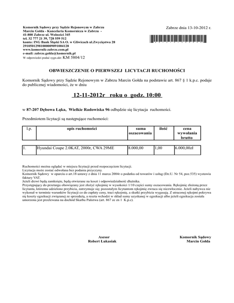 Komornik Sądowy przy Sądzie Rejonowym w Zabrzu Marcin Gołda - Kancelaria Komornicza w Zabrzu 41-800 Zabrze ul. Wolności 345 tel. 32 777 21 39, 728 559 512 konto: ING Bank Śląski SA O. w Gliwicach ul.Zwycięstwa 28 29105012981000009091004128 www.komornik-zabrze.com.pl e-mail: [email protected] W odpowiedzi podać sygn.akt: KM Zabrze dnia 13-10-2012 r. *9012101300046* 5804/12 OBWIESZCZENIE O PIERWSZEJ LICYTACJI RUCHOMOŚCI Komornik Sądowy przy Sądzie Rejonowym w Zabrzu Marcin Gołda na podstawie art. 867 § 1 k.p.c. podaje do publicznej wiadomości, że w dniu 12-11-2012r roku o godz. 10:00 w 87-207 Dębowa Łąka, Wielkie Radowiska 96 odbędzie się licytacja ruchomości. Przedmiotem licytacji są następujące ruchomości: l.p. 1. opis ruchomości Hyundai Coupe 2.0KAT, 2000r, CWA 29ME suma oszacowania 8.000,00 ilość 1,00 cena wywołania brutto 6.000,00zł Ruchomości można oglądać w miejscu licytacji przed rozpoczęciem licytacji. Licytacja może zostać odwołana bez podania przyczyny. Komornik Sądowy w oparciu o art.18 ustawy z dnia 11 marca 2004r o podatku od towarów i usług (Dz.U. Nr 54, poz.535) wystawia faktury VAT. Jeżeli drzwi będą zamknięte, będą otwierane na koszt i odpowiedzialność dłużnika. Przystępujący do przetargu obowiązany jest złożyć rękojmię w wysokości 1/10 części sumy oszacowania. Rękojmię złożoną przez licytanta, któremu udzielono przybicia, zatrzymuje się; pozostałym licytantom rękojmię zwraca się niezwłocznie. Jeżeli nabywca nie wykonał w terminie warunków licytacji co do zapłaty ceny, traci rękojmię, a skutki przybicia wygasają. Z utraconej rękojmi pokrywa się koszty egzekucji związanej ze sprzedażą, a reszta wchodzi w skład sumy uzyskanej w egzekucji albo jeżeli egzekucja została umorzona jest przelewana na dochód Skarbu Państwa (art. 867 ze zn 1 K.p.c). Asesor Robert Łukasiak Komornik Sądowy Marcin Gołda