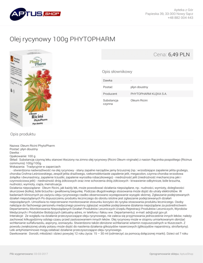 Apteka z Gór Papieska 39, 33-300 Nowy Sącz +48 882 004 443 Olej rycynowy 100g PHYTOPHARM Cena: 6,49 PLN Opis słownikowy Dawka - Postać płyn doustny Producent PHYTOPHARM KLĘKA S.A. Substancja czynna Oleum Ricini Opis produktu Nazwa: Oleum Ricini PhytoPharm Postać: płyn doustny Dawka: Opakowanie: 100 g Skład: Substancję czynną leku stanowi tłoczony na zimno olej rycynowy (Ricini Oleum virginale) z nasion Rącznika pospolitego (Ricinus communis) 100g/100g. Wskazania: Tradycyjnie w zaparciach : - stwierdzona nadwrażliwość na olej rycynowy - stany zapalne narządów jamy brzusznej (np.: wrzodziejące zapalenie jelita grubego, choroba Crohna-Leśniowskiego, zespół jelita drażliwego, rzekomobłoniaste zapalenie jelit, megacolon, czynna choroba wrzodowa żołądka i dwunastnicy, zapalenie trzustki, zapalenie wyrostka robaczkowego) - niedrożność jelit (niedrożność mechaniczna jaki i czynnościowa jelit) - niedrożność dróg żółciowych oraz inne schorzenia dróg żółciowych - krwawienie odbytnicze, bóle brzucha, nudności, wymioty, ciąża, menstruacja. Działania niepożądane: Oleum Ricini, jak każdy lek, może powodować działania niepożądane, np.: nudności, wymioty, dolegliwości skurczowe (kolka), bóle brzucha i gwałtowną biegunkę. Podczas długotrwałego stosowania może dojść do utraty elektrolitów. W badaniach klinicznych po zażyciu oleju rycynowego rzadko obserwowano występowanie wysypki skórnej. Zgłaszanie podejrzewanych działań niepożądanych Po dopuszczeniu produktu leczniczego do obrotu istotne jest zgłaszanie podejrzewanych działań niepożądanych. Umożliwia to nieprzerwane monitorowanie stosunku korzyści do ryzyka stosowania produktu leczniczego. Osoby należące do fachowego personelu medycznego powinny zgłaszać wszelkie podejrzewane działania niepożądane za pośrednictwem Departamentu Monitorowania Niepożądanych Działań Produktów Leczniczych Urzędu Rejestracji Produktów Leczniczych, Wyrobów Medycznych i Produktów Biobójczych (aktualny adres, nr telefonu i faksu ww. Departamentu). e-mail: [email protected]. Interakcje: Ze względu na działanie przeczyszczające oleju rycynowego, nie zaleca się przyjmowania jednocześnie innych leków; należy zachować kilkugodzinny odstęp czasu przed zastosowaniem innych leków. Olej rycynowy może w stopniu umiarkowanym obniżać wchłanianie sulfafurazolu, aspiryny, izoniazydu. Stwierdzono także obniżone wchłanianie witamin rozpuszczalnych w tłuszczach. Z powodu zwiększonej utraty potasu może dojść do nasilenia działania glikozydów nasercowych (glikozydów naparstnicy, strofantyny). Leki antyhistaminowe mogą osłabiać działanie przeczyszczające oleju rycynowego. Dawkowanie: Dorośli, młodzież i dzieci powyżej 12 roku życia: 15 – 30 ml (odmierzyć za pomocą dołączonej miarki). Dzieci od 7 roku Plik wygenerowano: 03-03-2017 Oprogramowanie sklepu: AptusShop Apteka z Gór Papieska 39, 33-300 Nowy Sącz +48 882 004 443 życia do 12 roku życia: tylko pod kontrolą lekarza wg jego zaleceń, zwykle 5 – 15 ml (odmierzyć za pomocą dołączonej miarki). Dzieci poniżej 7 roku życia: Nie stosować. Czas stosowania: Produkt nie jest zalecany do terapii dłuższej niż 1 do kilku dni. Nie stosować częściej, niż raz na dobę. Środki ostrożności: Produkt nie jest zalecany do dłuższej terapii. Nie stosować u dzieci do 7 roku życia. U dzieci od 7 do 12 roku życia stosować tylko pod kontrolą lekarza wg jego zaleceń. Prowadzenie pojazdów: Brak danych na temat wpływu leku na zdolność prowadzenia pojazdów i obsługiwania maszyn. Przedawkowanie: Przedawkowanie leku może powodować nudności, wymioty, kolkę, bóle brzucha i silną biegunkę. W takich przypadkach wskazane jest sprowokowanie wymiotów i podanie węgla aktywowanego. Ciąża: Wyniki badań doświadczalnych wskazują, że w wyniku pobudzania biosyntezy prostaglandyn wchłonięty kwas rycynolowy może powodować przedwczesne skurcze macicy, dlatego też olej rycynowy nie może być stosowany w trakcie ciąży i karmienia piersią Plik wygenerowano: 03-03-2017 Powered by TCPDF (www.tcpdf.org) Oprogramowanie sklepu: AptusShop